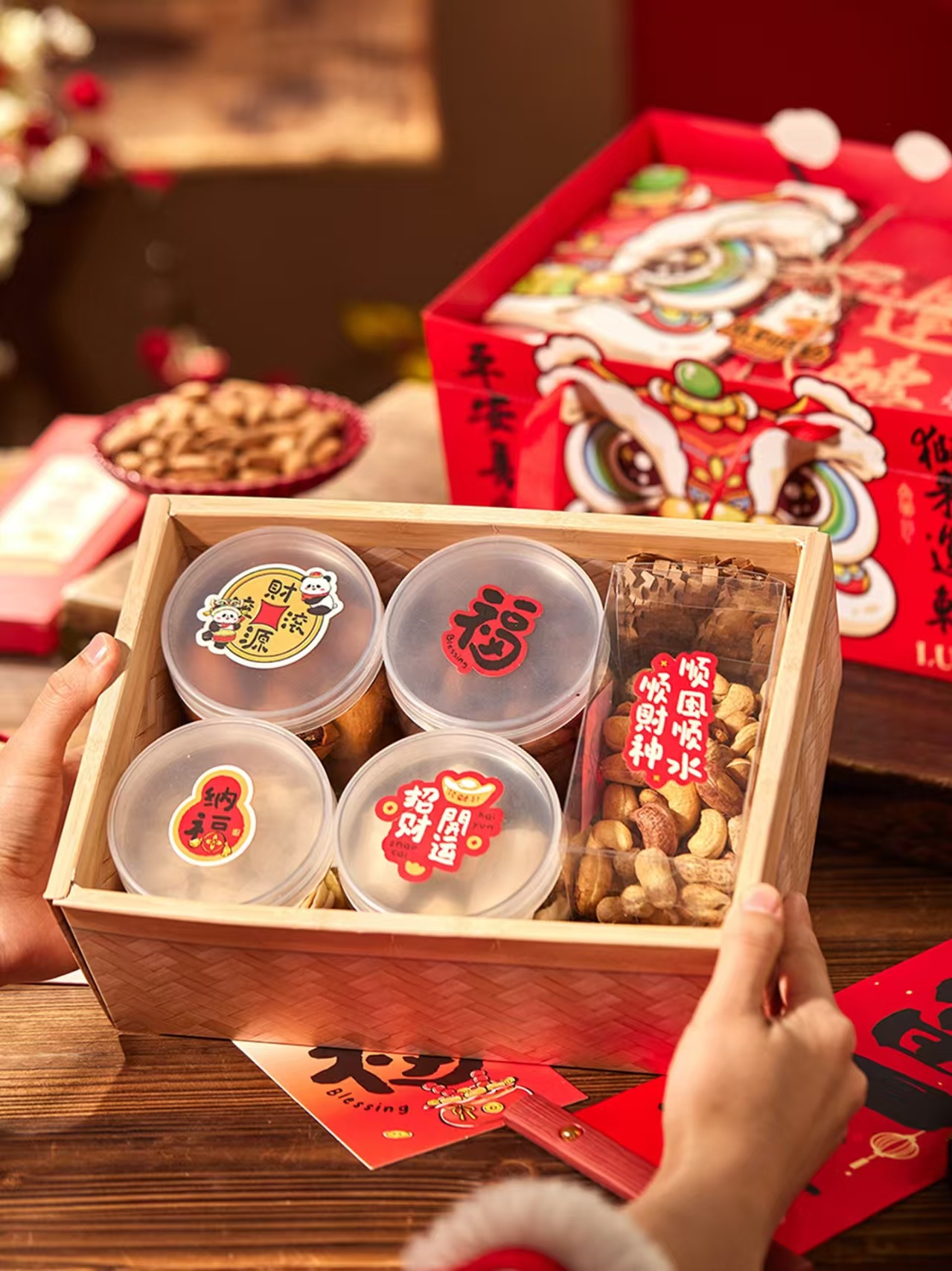 Новогодняя подарочная коробка 2026 года с имитацией бамбукового плетения и узором снежинки, пустая коробка для выпечки, красный конверт на Китайский Новый год, коробка для подарков на Новый год