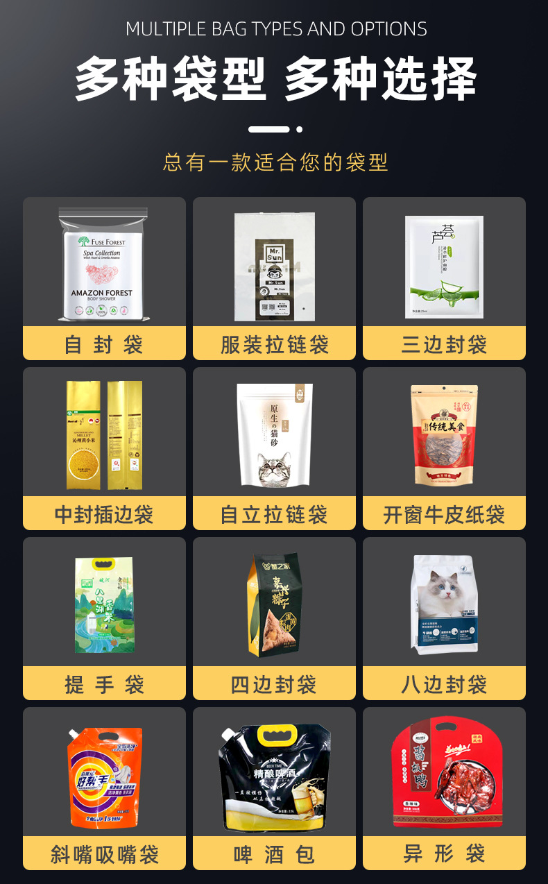 сумка для постельного белья; Мешок для мусора; сумка для покупок; подарочный пакет; сумка для хранения; сумка для украшений; Контейнерный мешок; Общая упаковка; пищевой пакет; косметичка; сумка для одежды; Упаковочная сумка для мобильного телефона; Логистическая упаковка; Упаковочные пакеты для предметов первой необходимости; Упаковка одежды; Упаковка удобрений; Упаковка кормов; Цифровая упаковка; Химическая упаковка; Упаковка строительных материалов; другой; упаковка пищевых продуктов