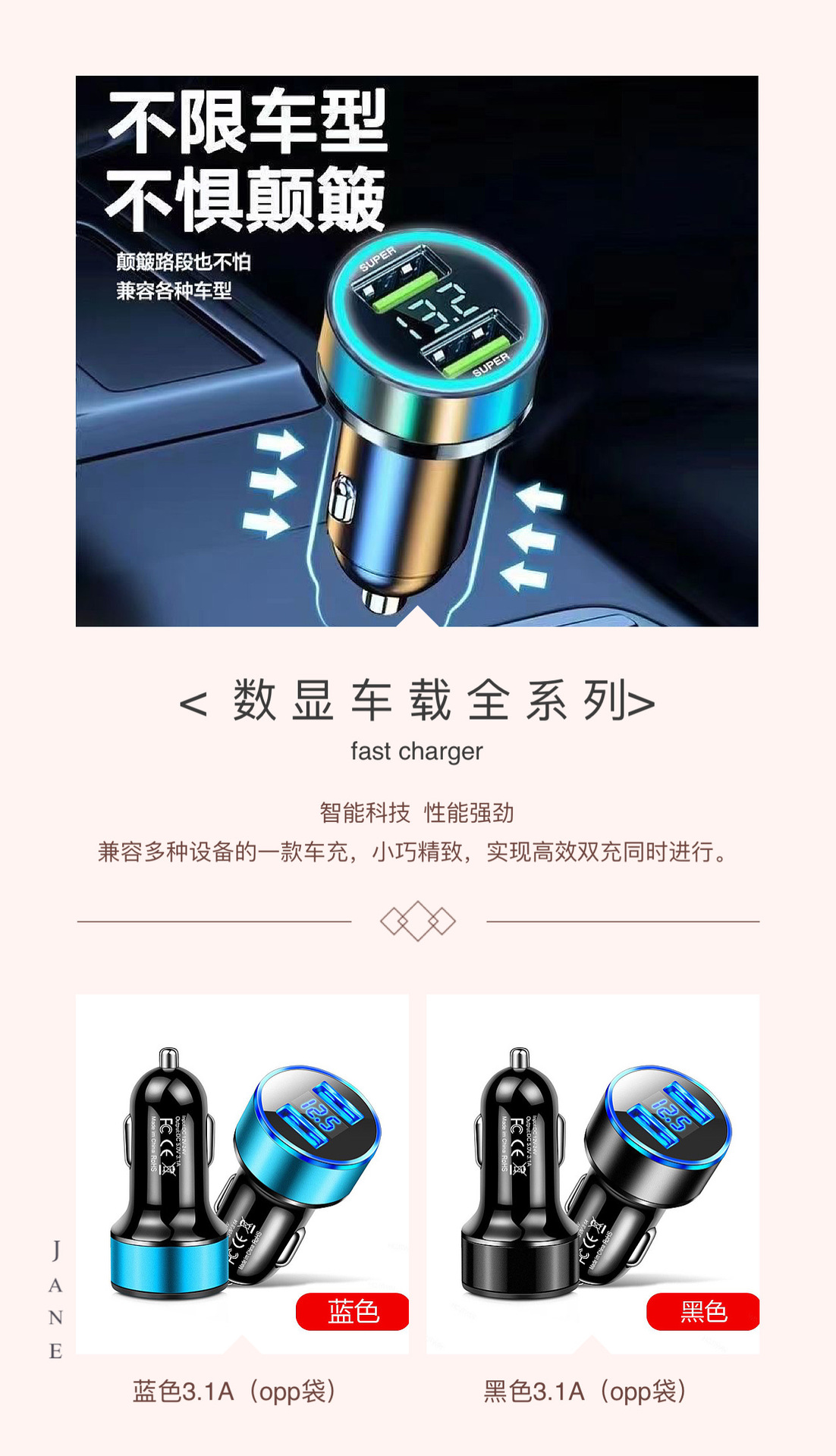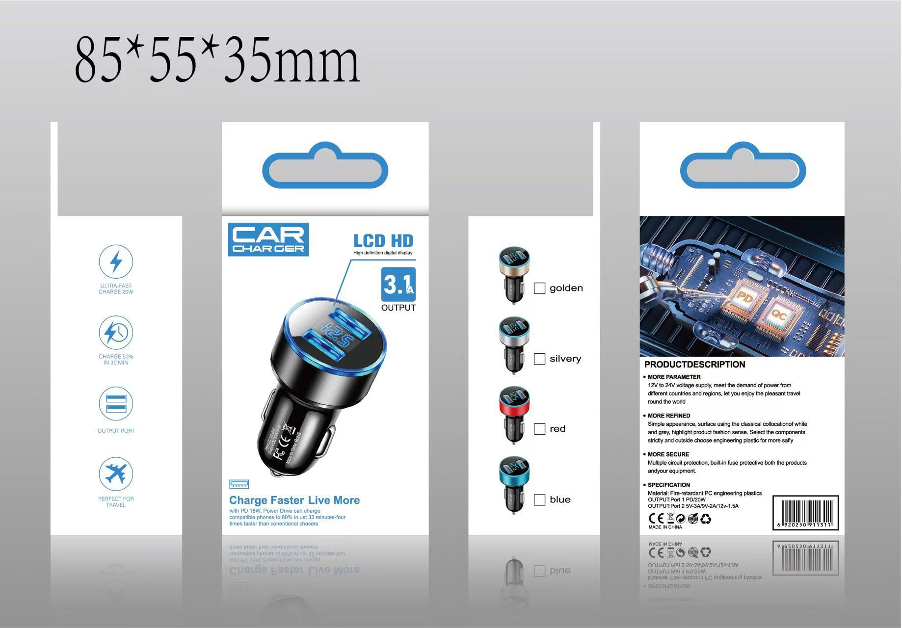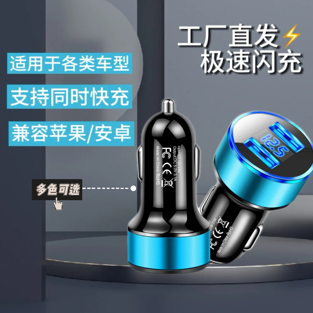Автомобильное зарядное устройство с фиксированным цифровым дисплеем 3.1A, быстрая зарядка, два USB-порта, синяя подсветка