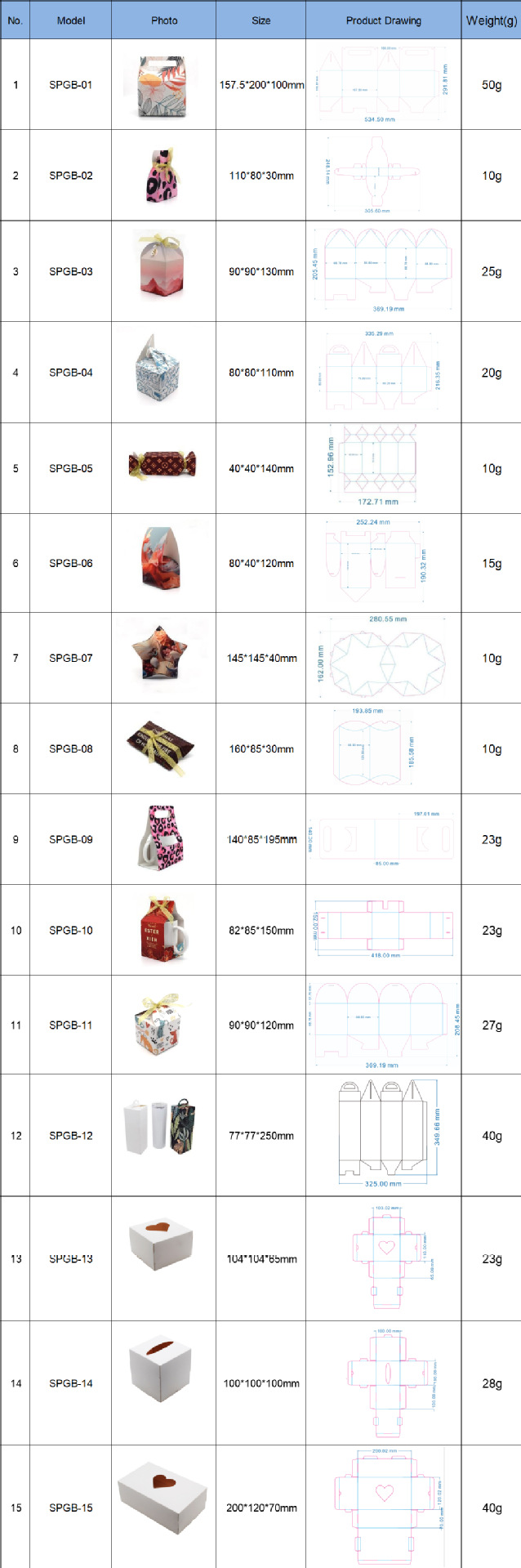 Стильная 3-подарочная коробка; Стильная 4-подарочная коробка; Стиль 11-подарочная коробка; Стиль 13-подарочная коробка; Стильная коробка конфет 2; Стильная коробка с 5 конфетами; Стильная коробка для кружек 10-11 унций; Стильная коробка для кружек 9-11 унций; Коробка шоколада Style 6; Стильная 7-шоколадная коробка; Стильная 8-шоколадная коробка; Стильная подарочная коробка с прямой чашкой на 12-20 унций; Стильная 1-большая подарочная коробка; Стильная коробка из 14 салфеток; Стильная коробка из 15 салфеток; Стильная коробка конфет на 16 конфет; Стильная коробка для кружек 17-11 унций