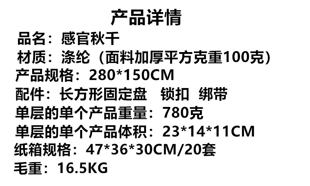 以上SKU是含全套配件的(配件包含固定盘,绑带 锁扣)如果不要配件去掉10元,面料是加厚的(平方克重100克),亲们可以比质量 比做工