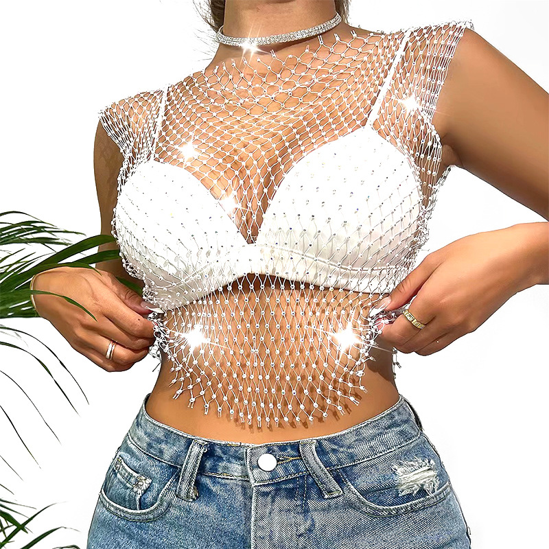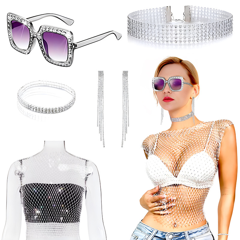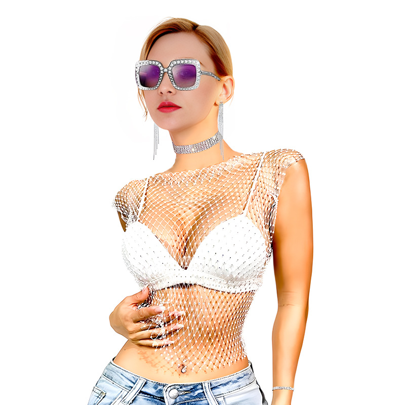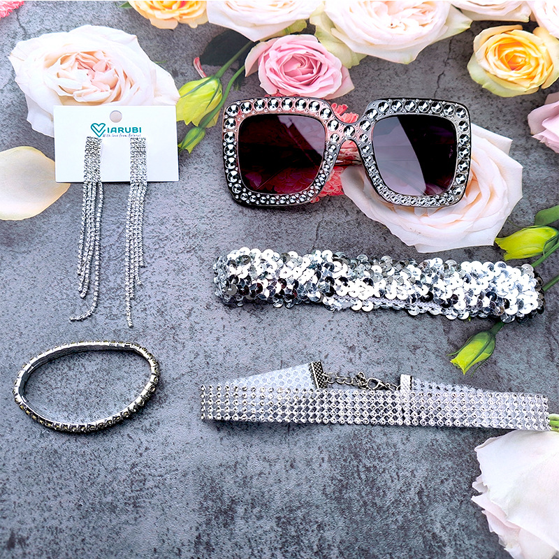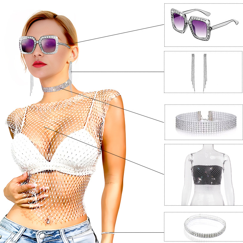 跨境2023夏季网红闪钻网格女装闪钻流苏耳环镶钻锁骨链项圈手链太阳镜服饰套装