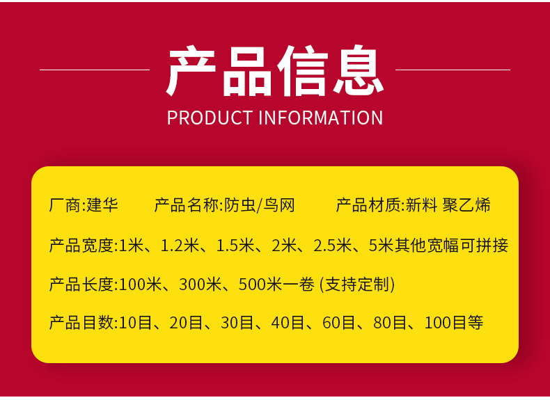 40 сетка; 60 меш [общий для разведения]; 80 меш [овощной сад]; 100 меш [плотная сетка для теплицы]; 120 меш [сетка высокой плотности]; 14 сетка; 16 сетка; 20 сетка; Утолщение 40 меш [рекомендуется для разведения]; Можно сращивать