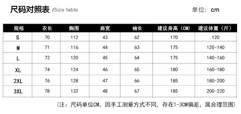 S (менее 120 цзинь); М (60,00 кг-70,00 кг; Л (70,00 кг-80,00 кг; XL (80,00 кг-90,00 кг; XXL (90,00 кг-100,00 кг; 3XL (100,00 кг-110,00 кг