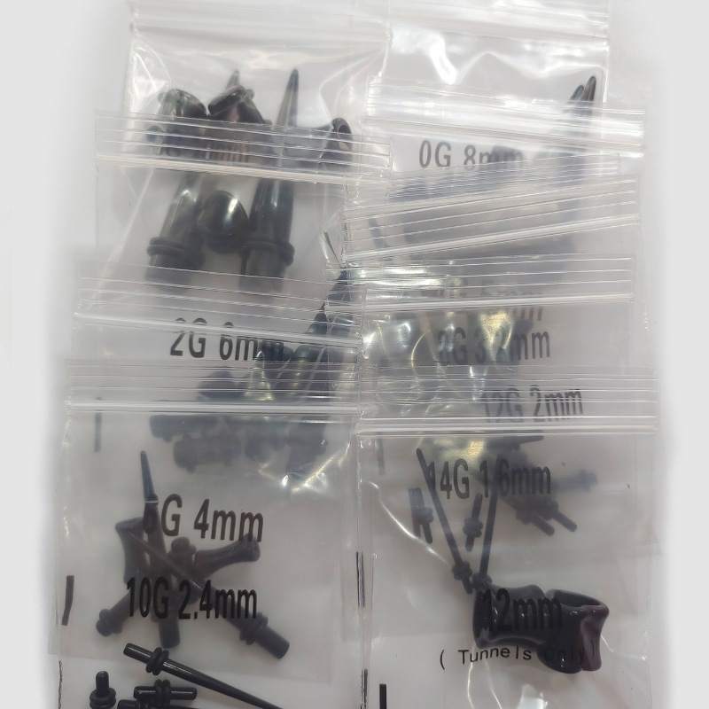 5包装;尖锥uv段爱心耳廓三个款式;其中尖锥uv段9个尺寸每个尺寸2个,爱心6个尺寸每个尺寸2个,一共48个耳廓。重量大约40克