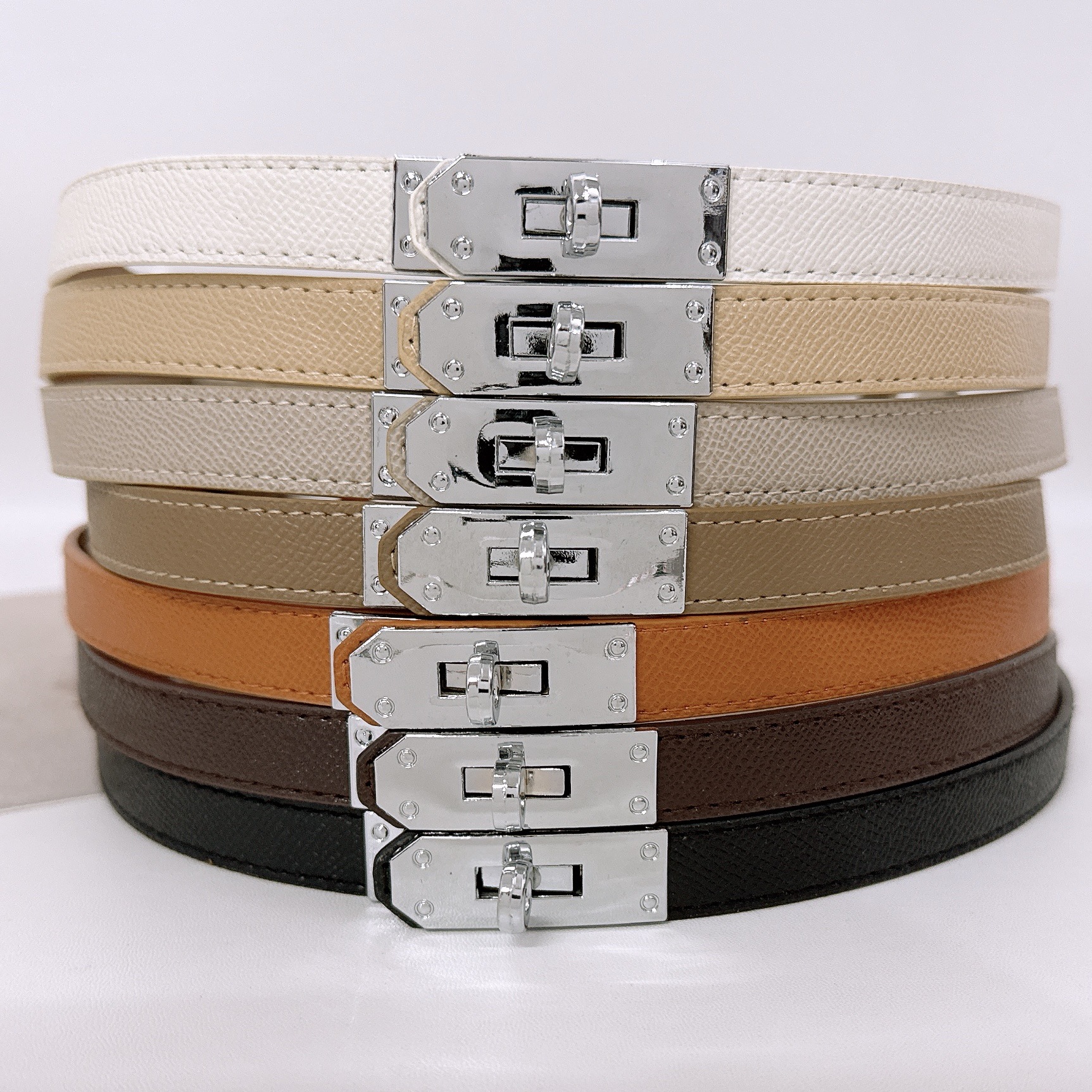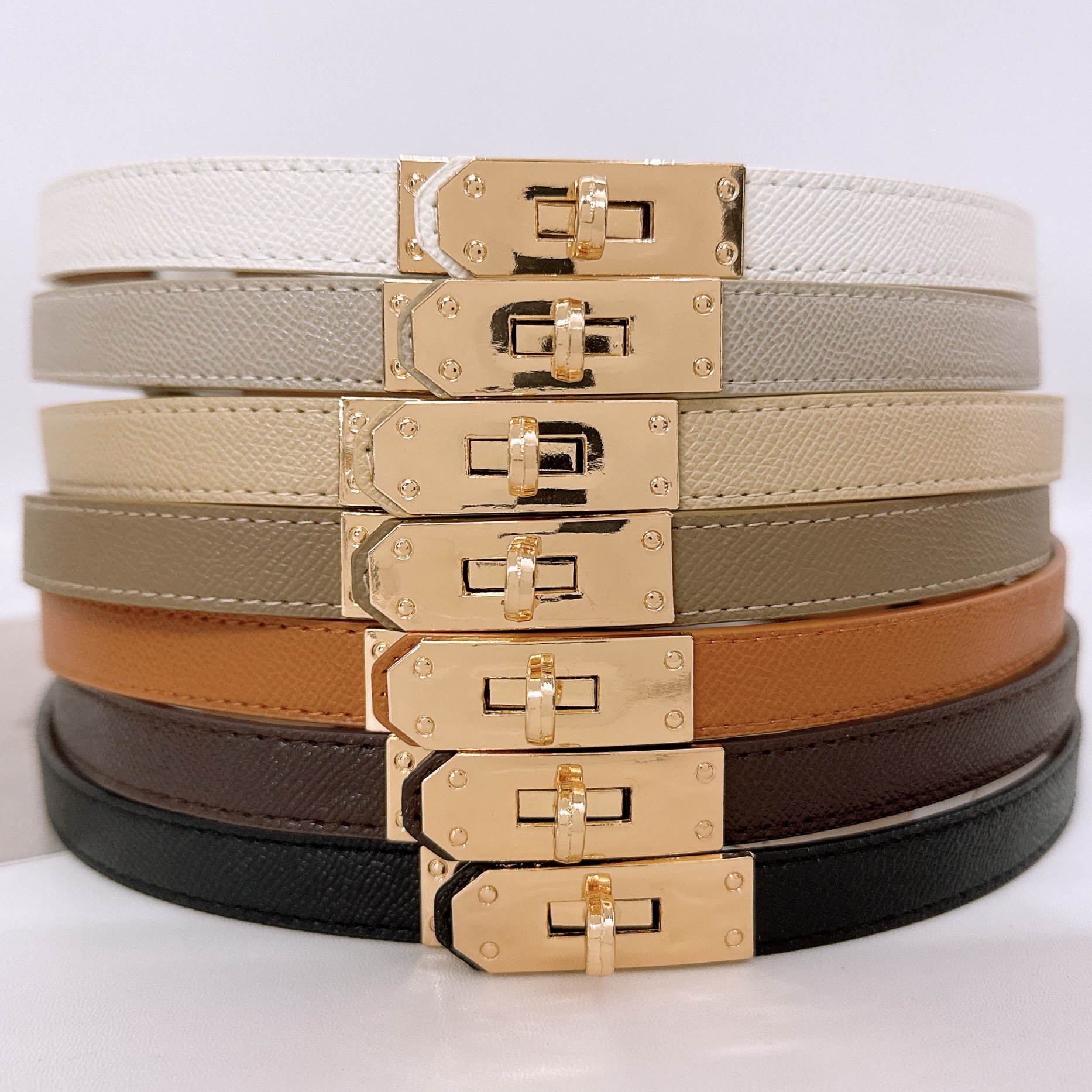 золотая пряжка черная; золотая пряжка коричневая; золотая пряжка белая; Золотая пряжка светло-хаки; золотая пряжка абрикосового цвета; золотая пряжка темно-кофейного цвета; золотая пряжка серая; Серебряная пряжка черная; Серебряная пряжка белая; серебряная пряжка коричневая; Серебряная пряжка светло-хаки; серебряный абрикос; серебряная пряжка темно-кофейного цвета; серебряная пряжка серая