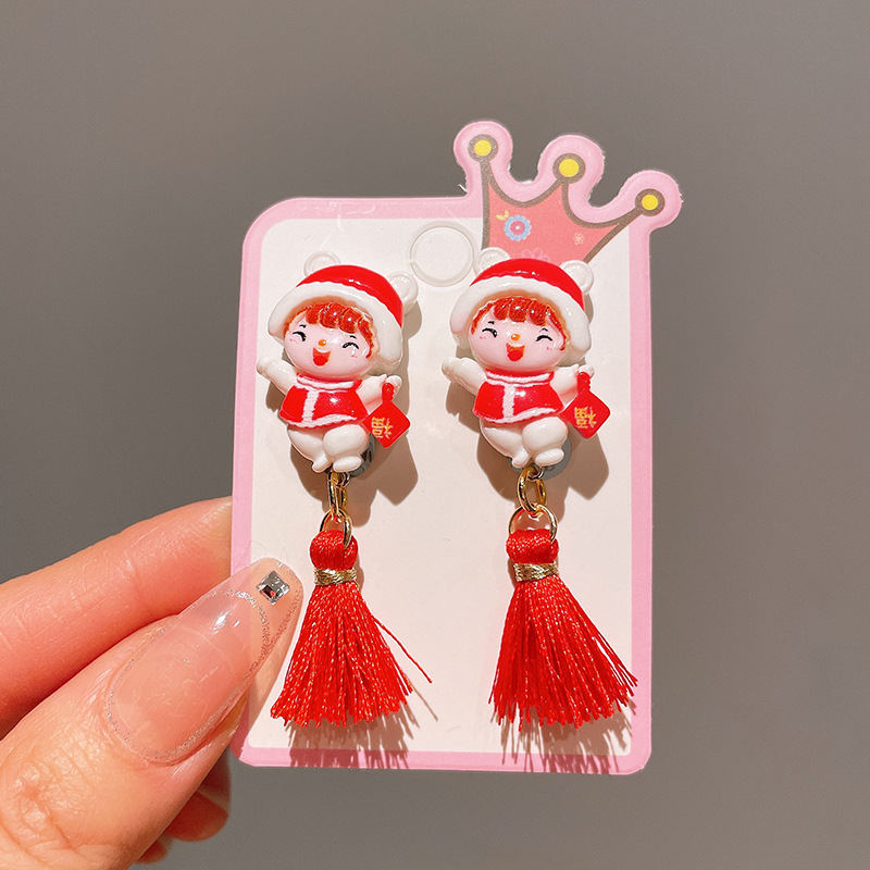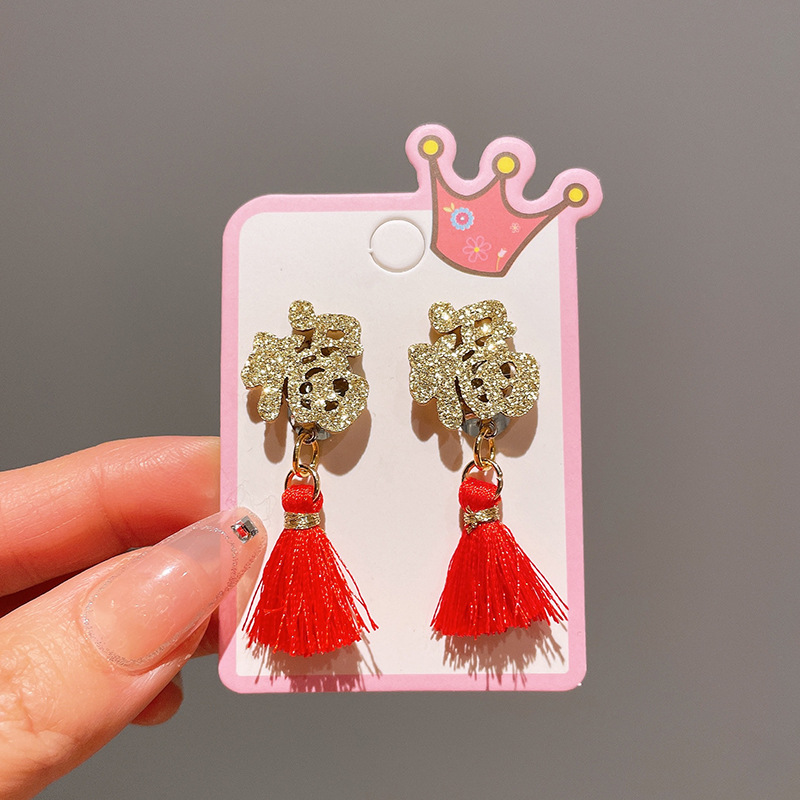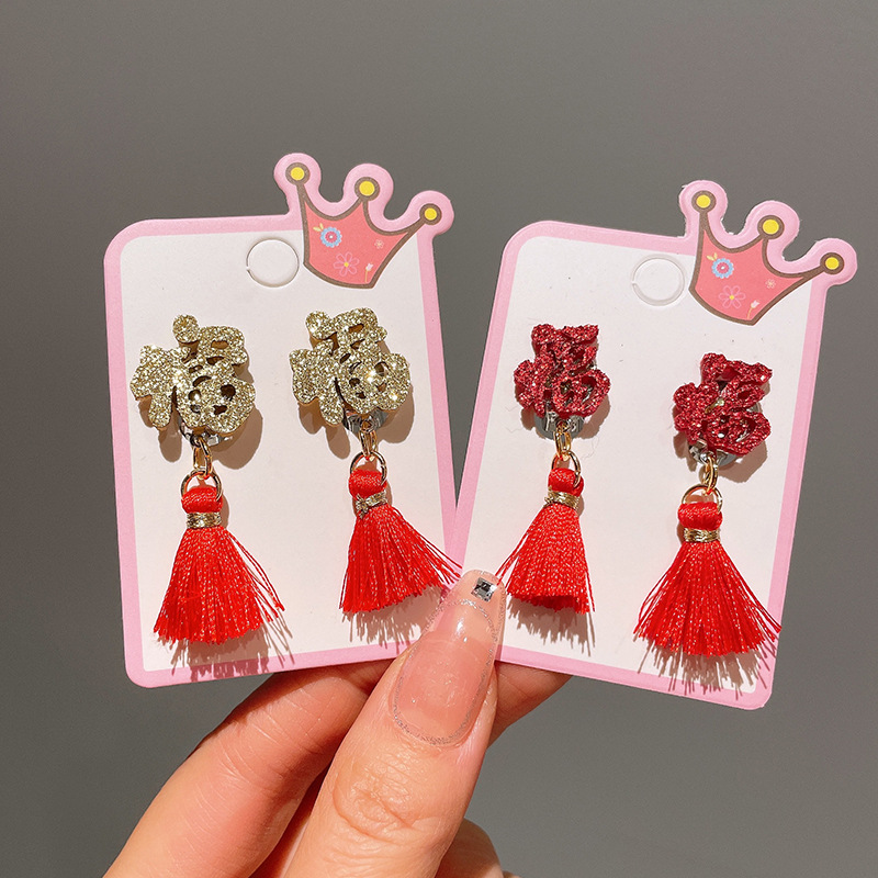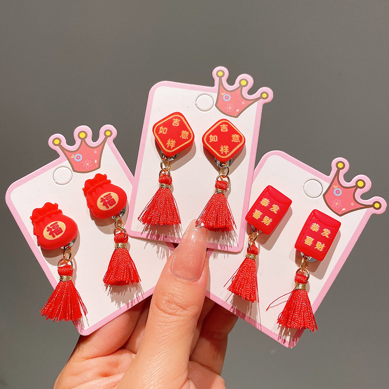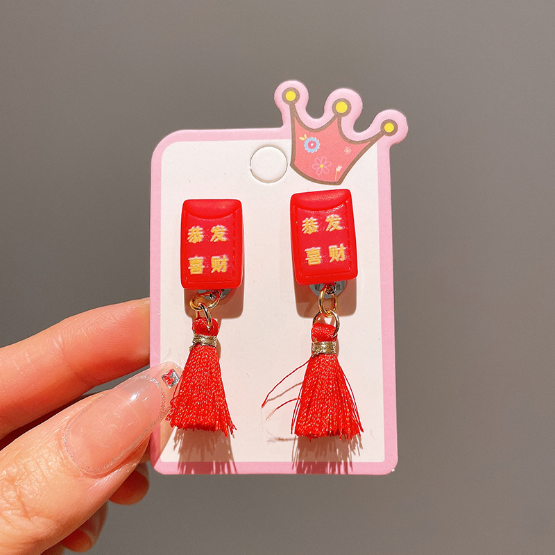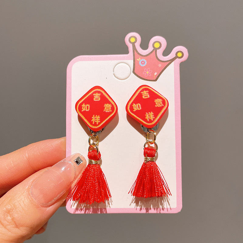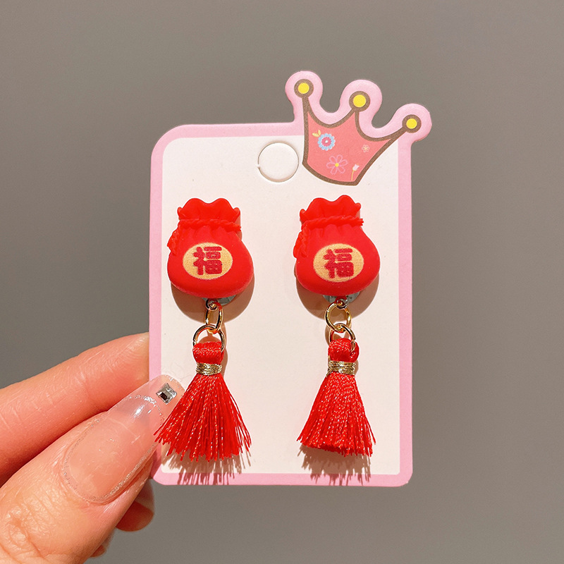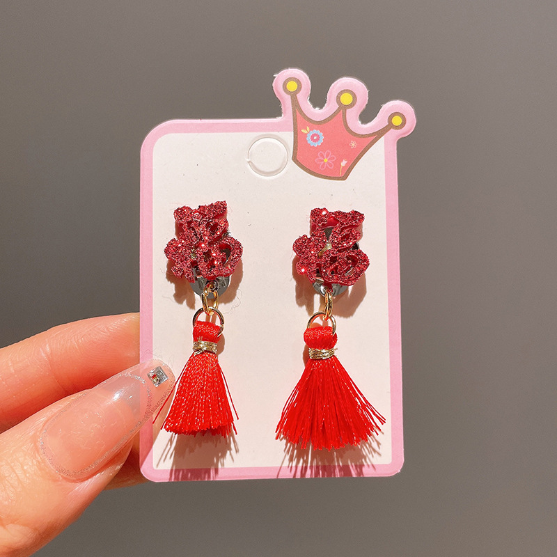 Детские красные зажимы для ушей, новогодние серьги в китайском стиле, благоприятная мультяшная кисточка, серьги без ушей для девочек, новогодние украшения
