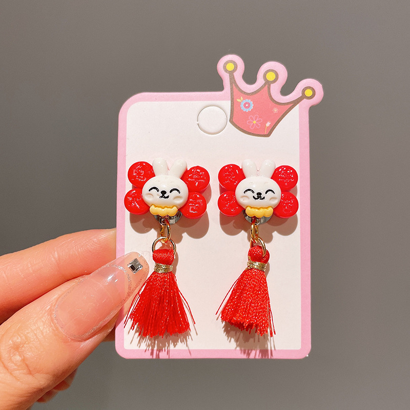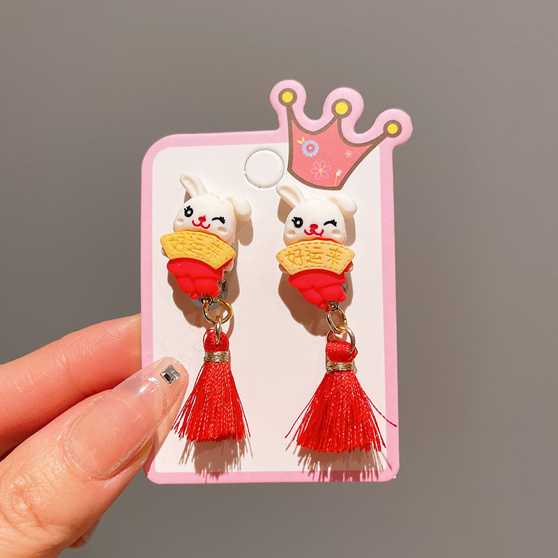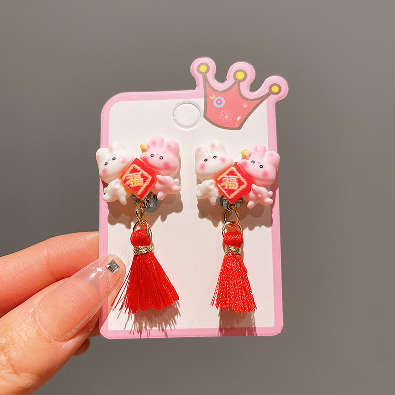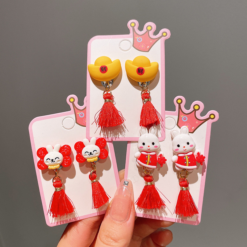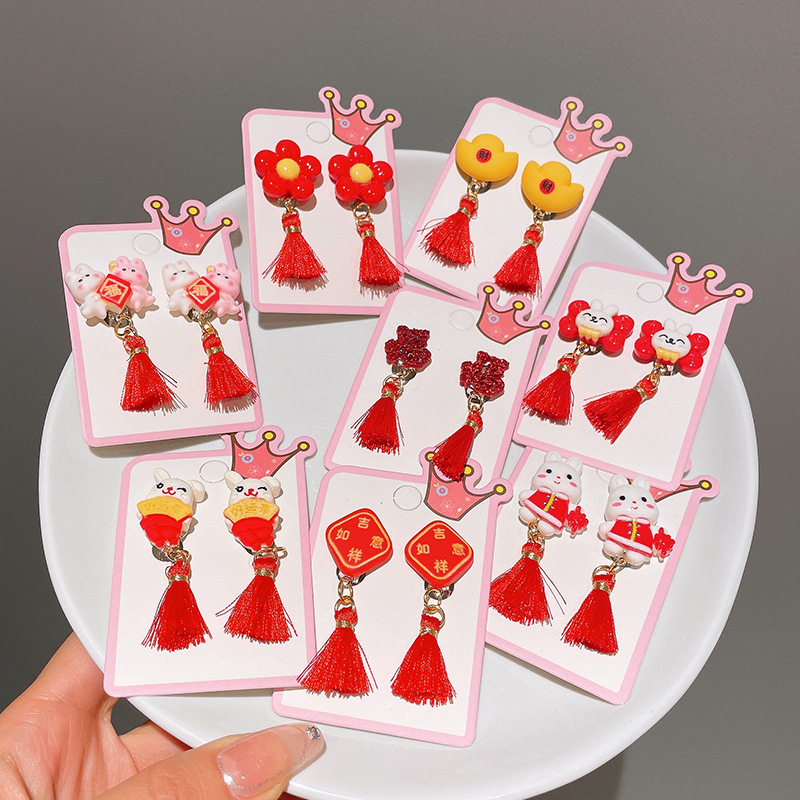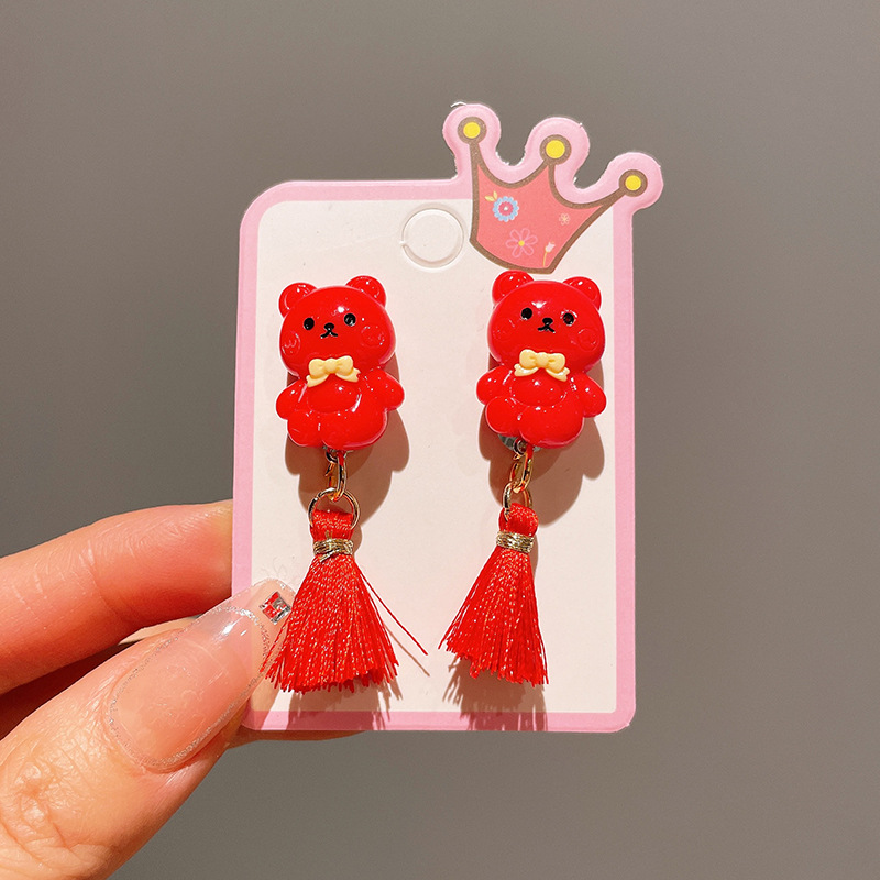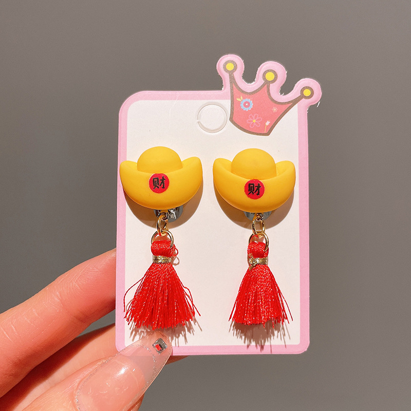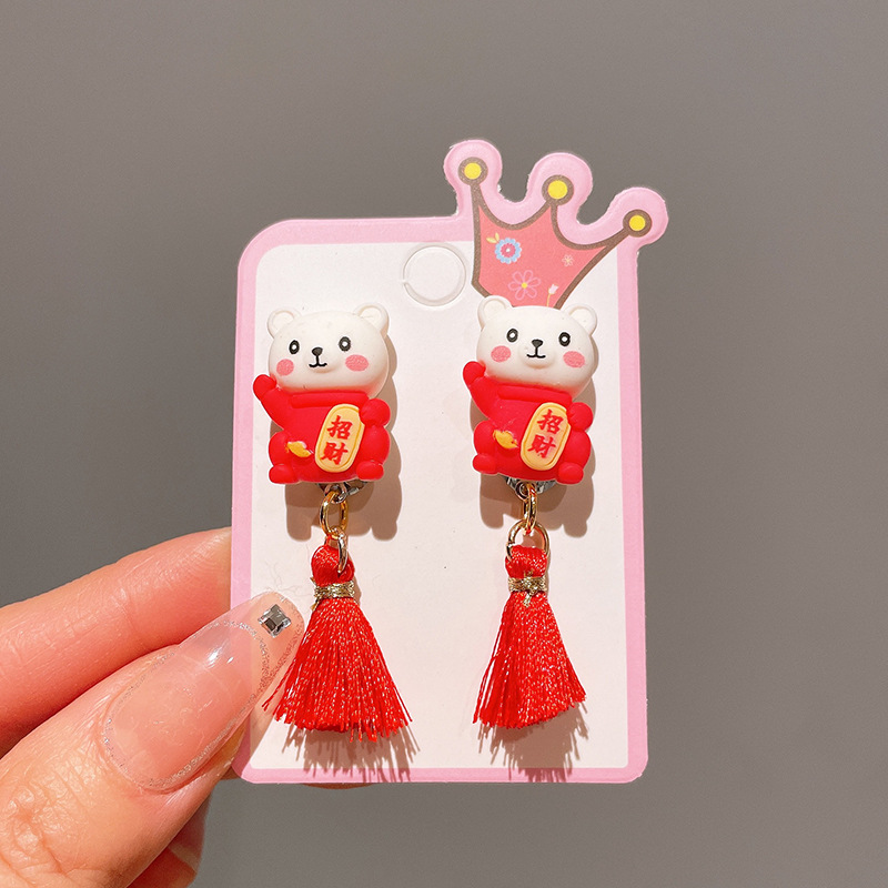 Детские красные зажимы для ушей, новогодние серьги в китайском стиле, благоприятная мультяшная кисточка, серьги без ушей для девочек, новогодние украшения