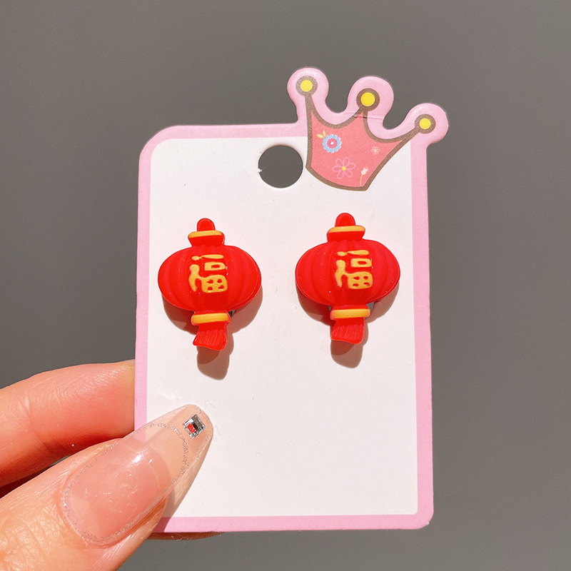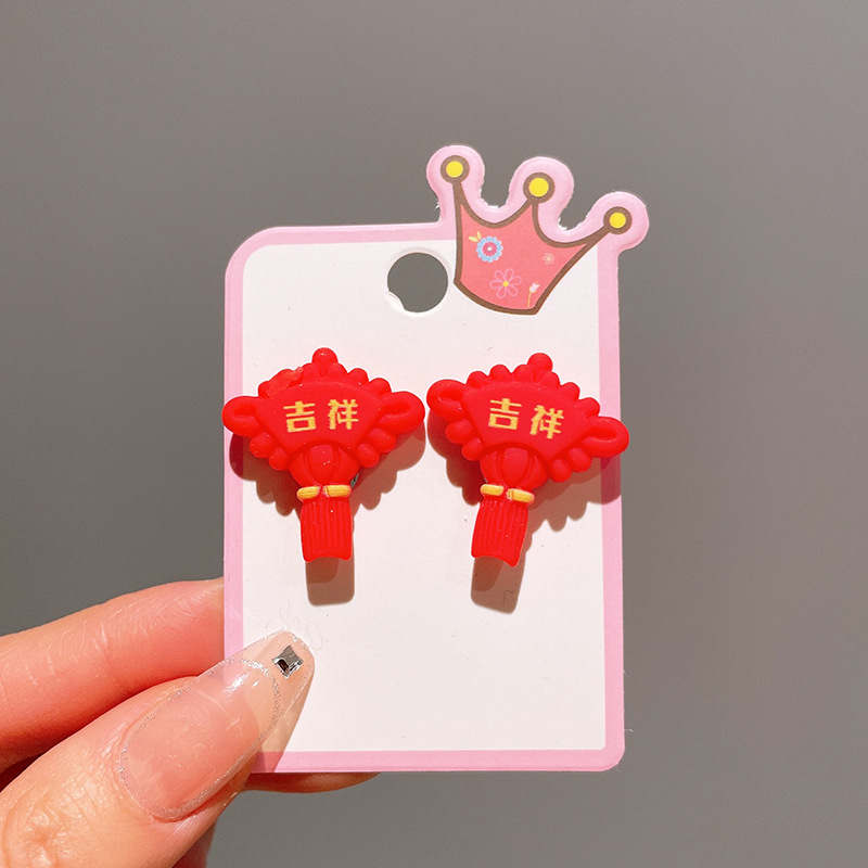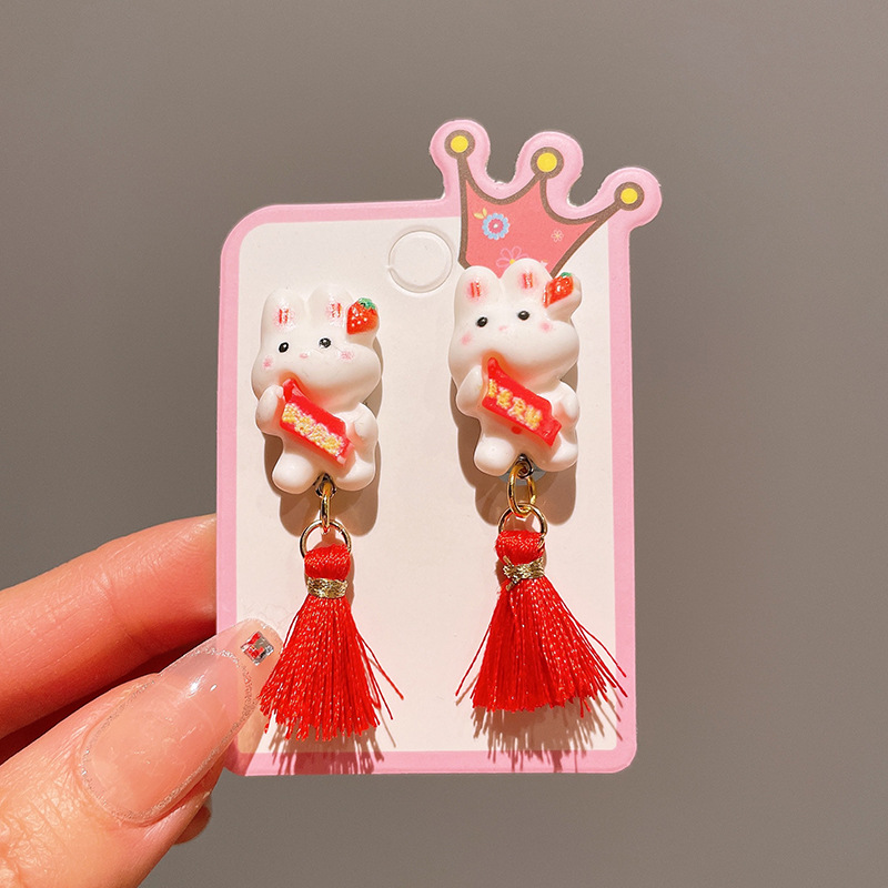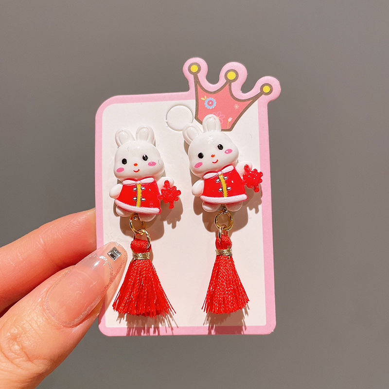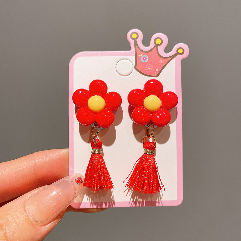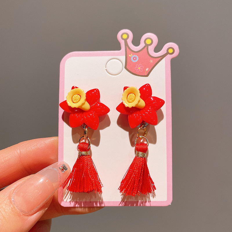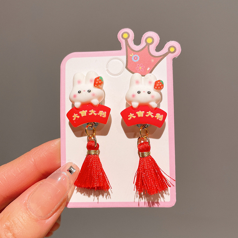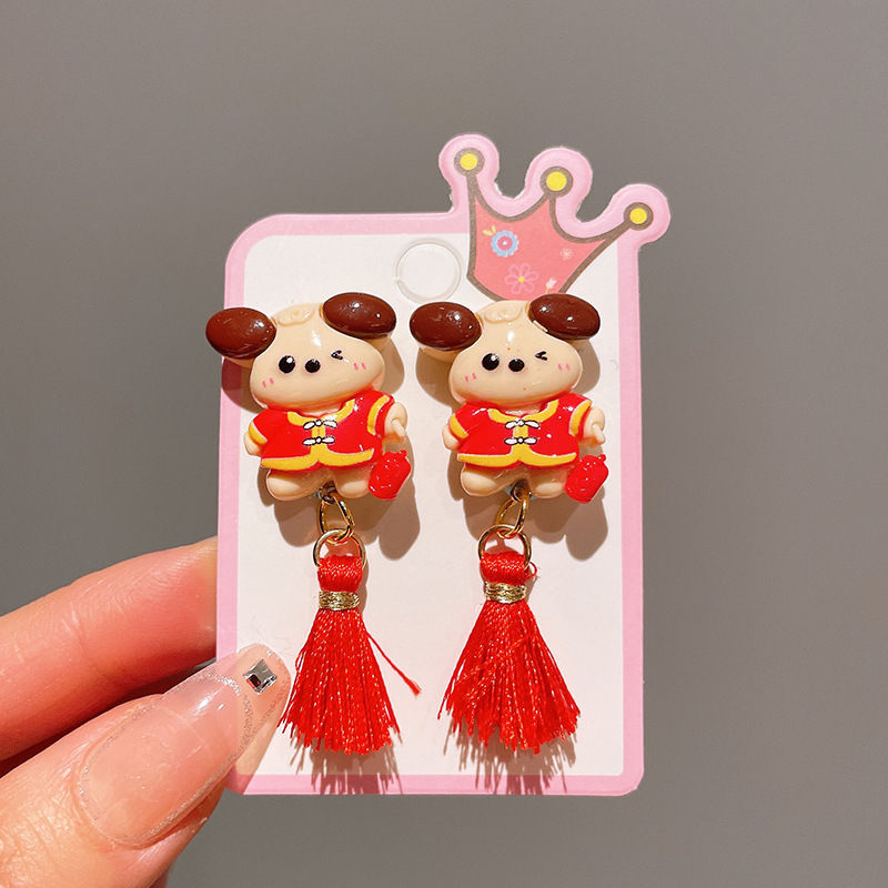 Детские красные зажимы для ушей, новогодние серьги в китайском стиле, благоприятная мультяшная кисточка, серьги без ушей для девочек, новогодние украшения