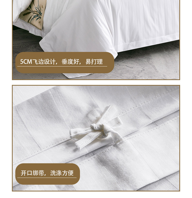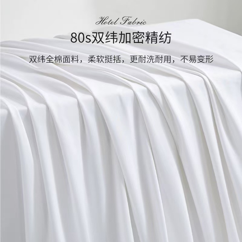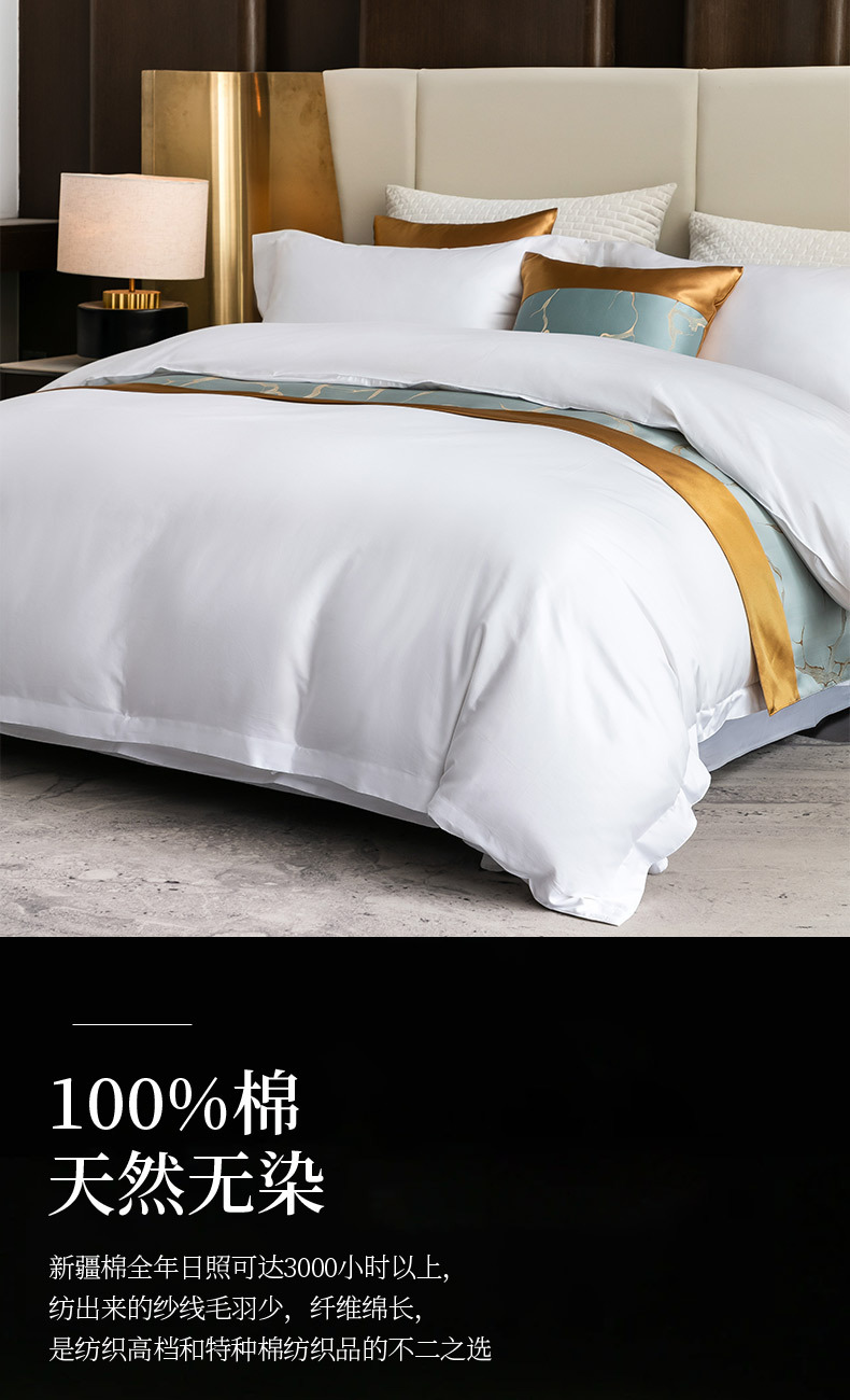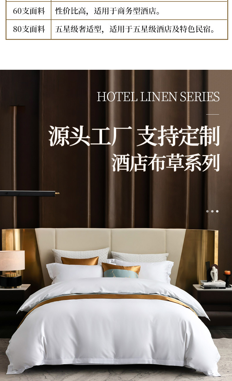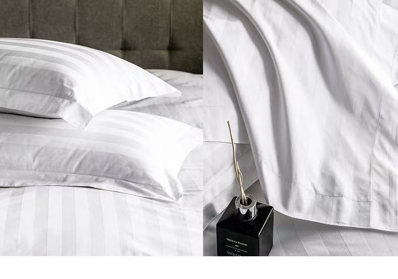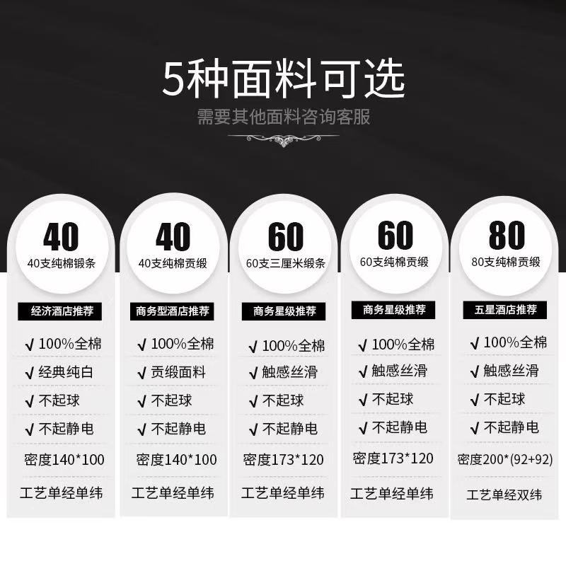 Белое бархатное постельное белье из полиэстера (устойчивое к сминанию, сверхплотное, не мнется, экономичное и долговечное — лучший выбор); Мерсеризованный хлопковый сатин плотностью 40 нитей — стиль простыней (стандарт быстрого отеля); Мерсеризованный хлопковый сатин плотностью 60 нитей — модель «Постельные простыни» (трехзвездочный бизнес-стандарт); Мерсеризованный хлопковый сатин плотностью 80 нитей — модель «Простыни» (четырех- или пятизвездочный классный бизнес-стандарт); Атласные полоски из хлопка темного цвета плотностью 40 нитей — в стиле простыни (стандарт для удобных домов для проживания); Атласные полоски из хлопка темного цвета плотностью 60 нитей — в стиле простыней (стандарт трехзвездочного отеля); Мерсеризованный хлопковый сатин плотностью 40 нитей — простыня (стандарт эконом-отеля); Мерсеризованный хлопковый сатин плотностью 60 нитей — простыня с подкладкой (стандарт трехзвездочного номера); Мерсеризованный хлопковый сатин плотностью 80 нитей — простыня на подкладке (стандарт четырех- или пятизвездочного люкса)