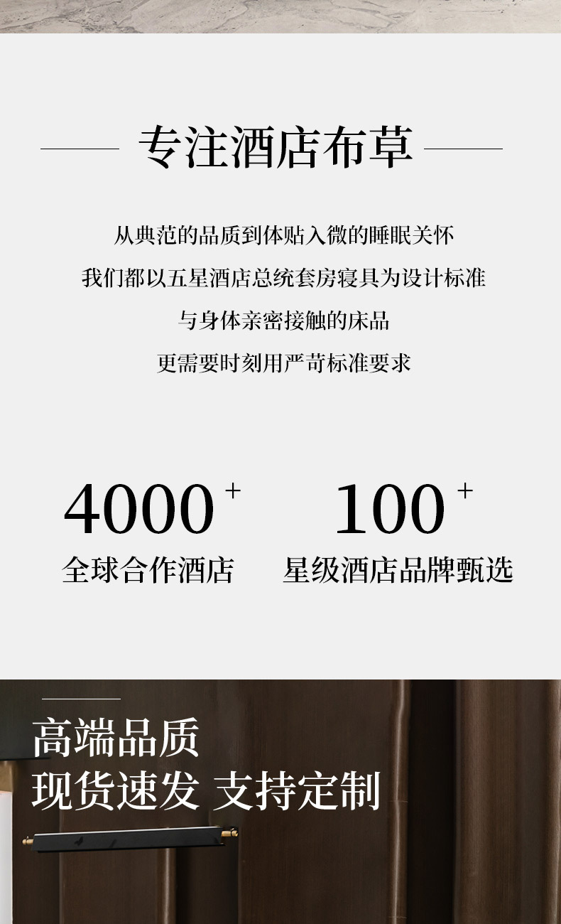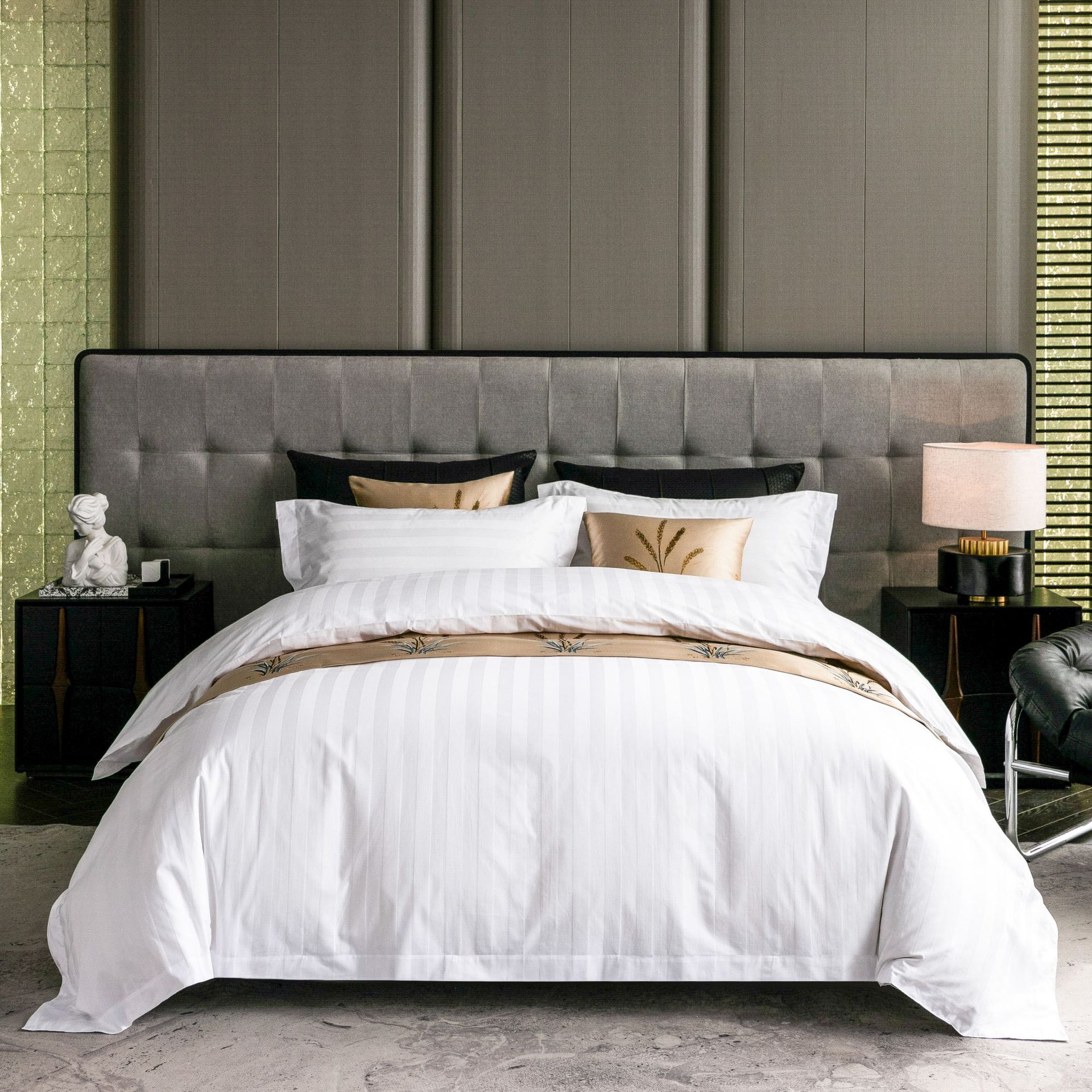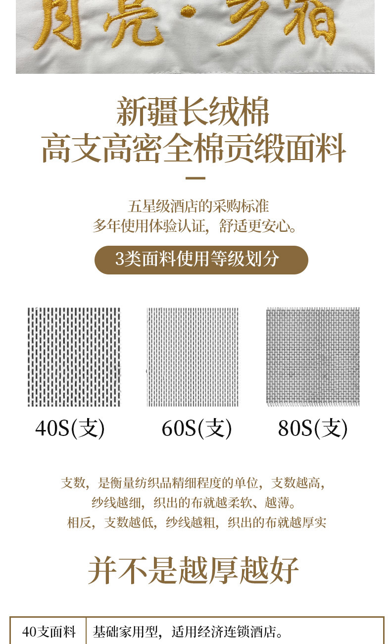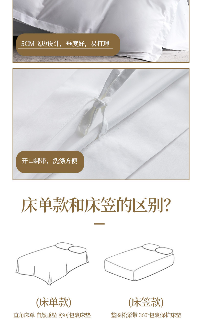 Белое бархатное постельное белье из полиэстера (устойчивое к сминанию, сверхплотное, не мнется, экономичное и долговечное — лучший выбор); Мерсеризованный хлопковый сатин плотностью 40 нитей — стиль простыней (стандарт быстрого отеля); Мерсеризованный хлопковый сатин плотностью 60 нитей — модель «Постельные простыни» (трехзвездочный бизнес-стандарт); Мерсеризованный хлопковый сатин плотностью 80 нитей — модель «Простыни» (четырех- или пятизвездочный классный бизнес-стандарт); Атласные полоски из хлопка темного цвета плотностью 40 нитей — в стиле простыни (стандарт для удобных домов для проживания); Атласные полоски из хлопка темного цвета плотностью 60 нитей — в стиле простыней (стандарт трехзвездочного отеля); Мерсеризованный хлопковый сатин плотностью 40 нитей — простыня (стандарт эконом-отеля); Мерсеризованный хлопковый сатин плотностью 60 нитей — простыня с подкладкой (стандарт трехзвездочного номера); Мерсеризованный хлопковый сатин плотностью 80 нитей — простыня на подкладке (стандарт четырех- или пятизвездочного люкса)