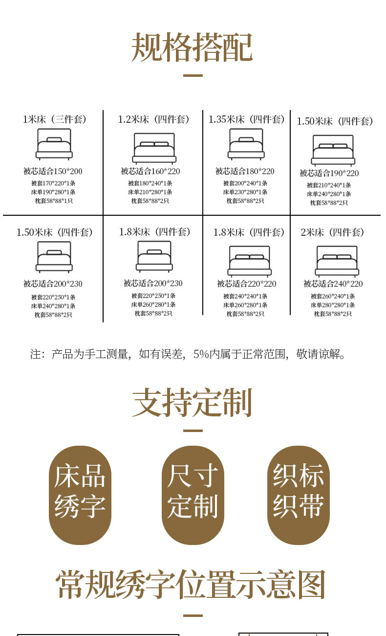 Комплект из трех предметов для кровати длиной 1,0 м (рекомендуется соответствовать стеганому яру 150*200); Комплект из четырех предметов для кровати длиной 1,2 м (рекомендуется соответствовать ярусу одеяла 160*220); Комплект из четырех предметов для кровати шириной 1,35 м (рекомендуется соответствовать ярусу одеяла 180*220); Комплект из четырех предметов для кровати длиной 1,5 м (рекомендуется соответствовать сердцевине одеяла 190*220); Комплект из четырех предметов для кровати длиной 1,5 м (рекомендуется соответствовать стеганому яру 200*230); Комплект из четырех предметов для кровати длиной 1,8 м (рекомендуется соответствовать сердцевине одеяла 200*230); Комплект из четырех предметов для кровати 1,8 м (рекомендуется соответствовать стеганому сердечнику 220*220); Комплект из четырех предметов для кровати длиной 2,0 м (рекомендуется соответствовать ярусу одеяла 240*220)