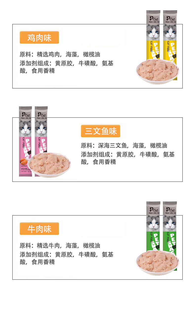 Мяу Маленький Жирный3-Куриный вкус; Мяу Литтл Фэт3 – вкус говядины; Мяу Маленький Жирный3-Тунец Вкус; Мяу Литтл Фэт3 – Смак Лосося; Мяу, маленький вкус толстого цыпленка; Мяу Маленький Жирный - вкус говядины; Мяу, маленький вкус толстого тунца; Мяу, маленький жирный вкус лосося; Мяу Сяопанг - Куриный вкус; Мяу Сяопан - вкус трески; Мяу Сяопанг - вкус тунца; Мяу Сяопанг – вкус лосося; Английская охота на сокровища со вкусом курицы; Английская охота на сокровища - вкус трески; Английская охота на сокровища - вкус тунца; Китайская охота на сокровища — вкус курицы; Китайская охота на сокровища - вкус трески; Китайская охота на сокровища - вкус тунца