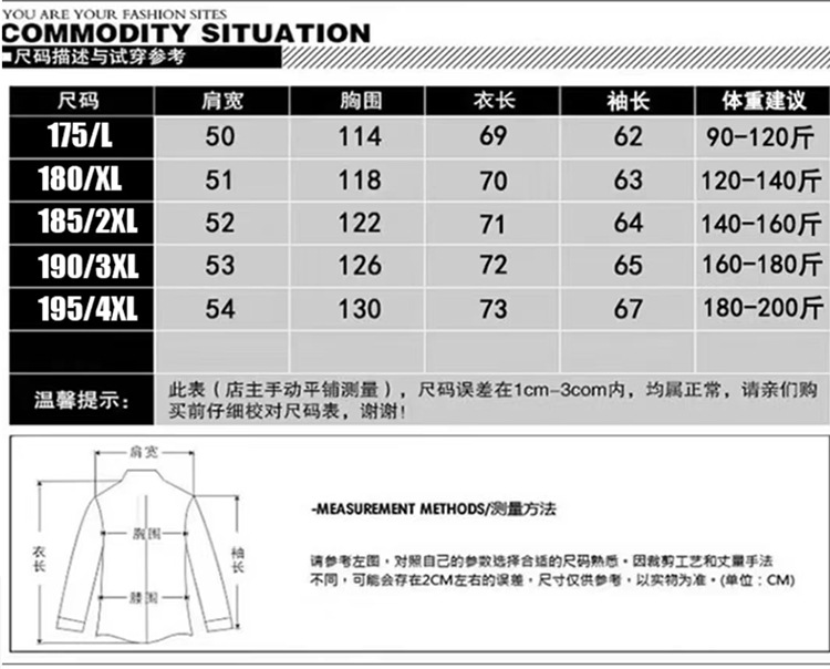 175/L; 180/XL; 185/2XL; 190/3XL; 195/4XL