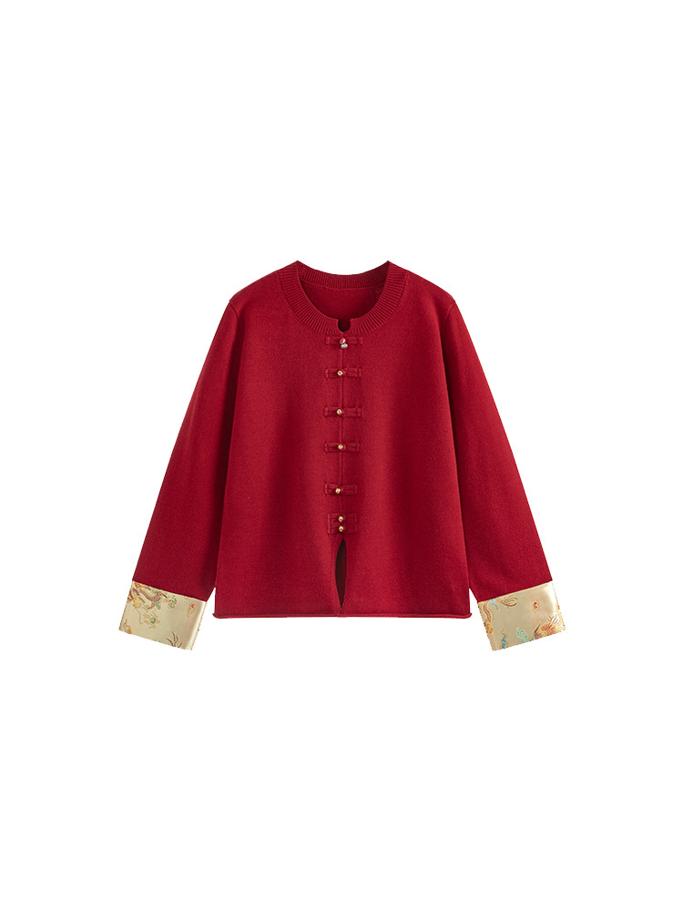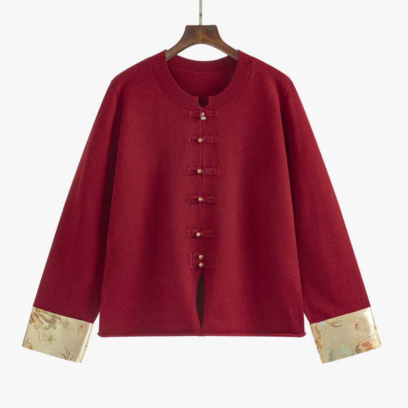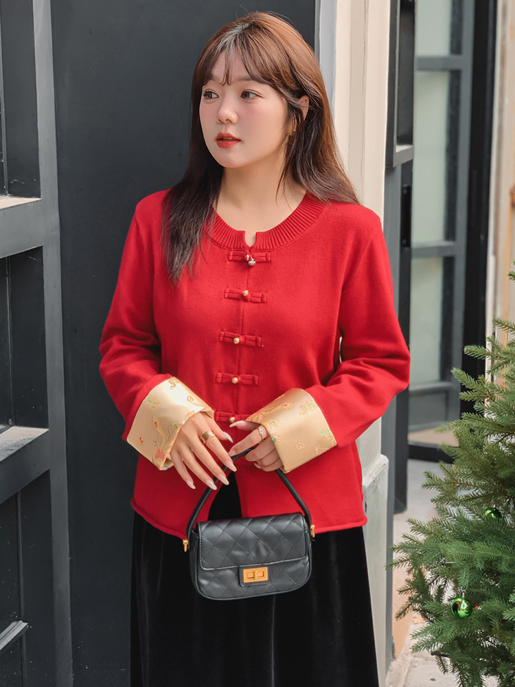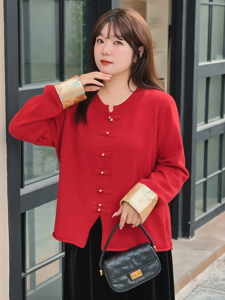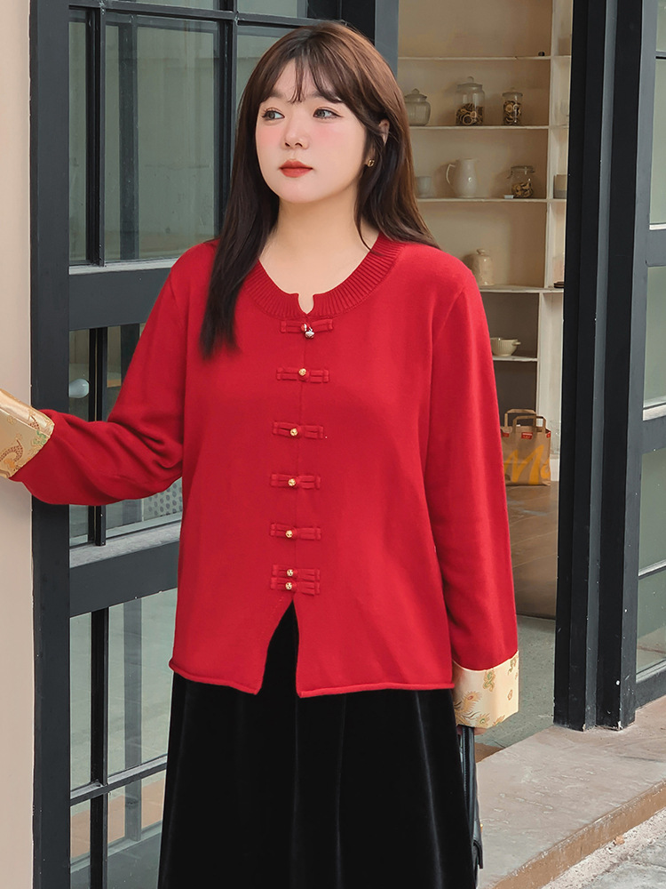 Женская одежда больших размеров, новое пальто в национальном стиле в китайском стиле, красный топ для женщин, осенний стиль 2025 года, вязаный свитер для полных женщин 22115.