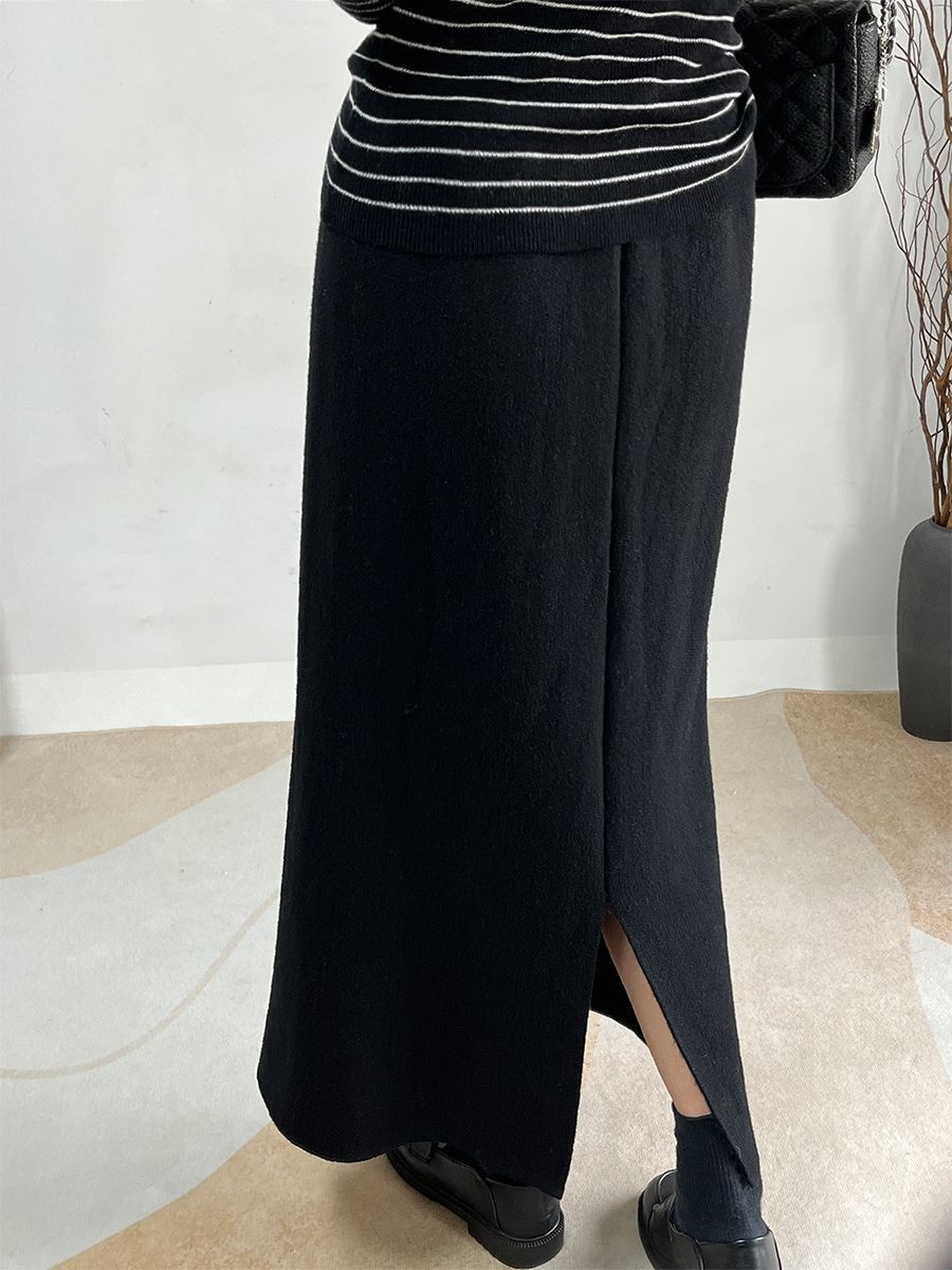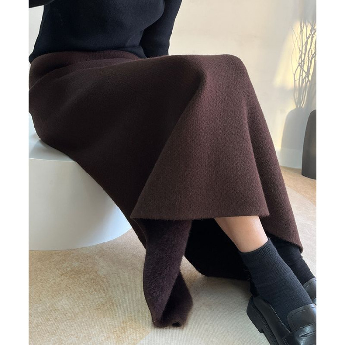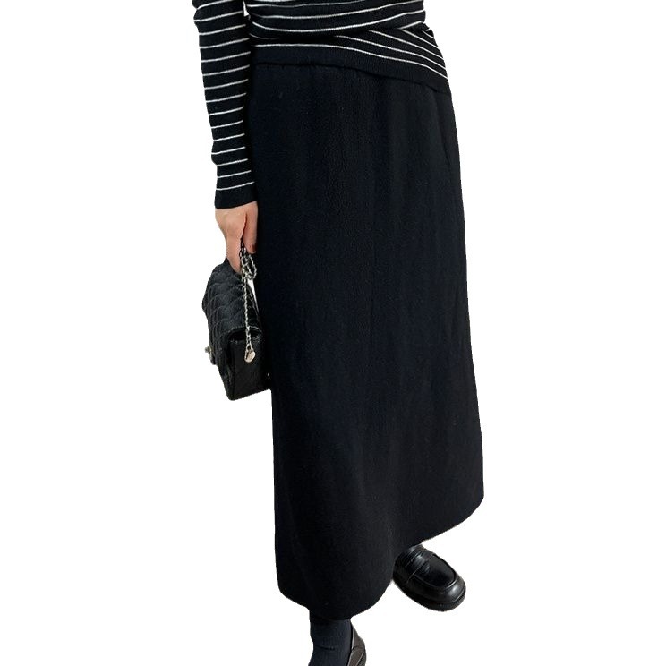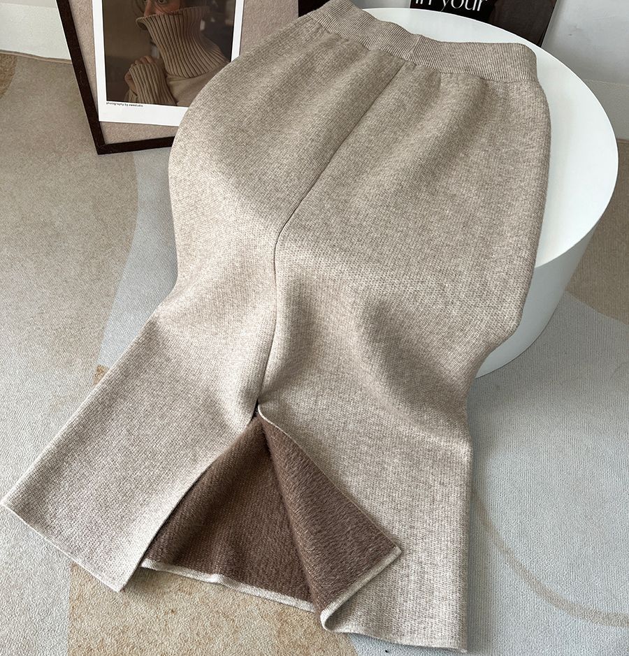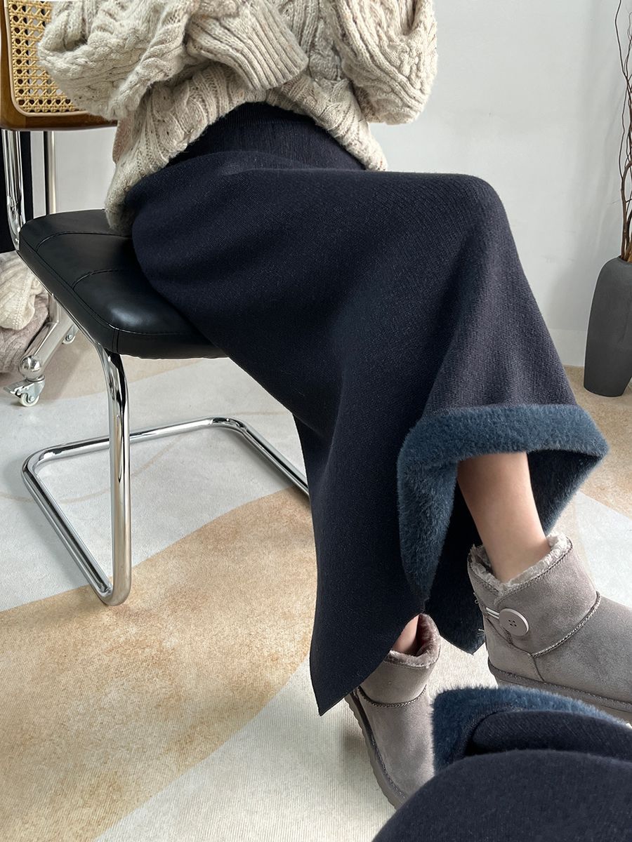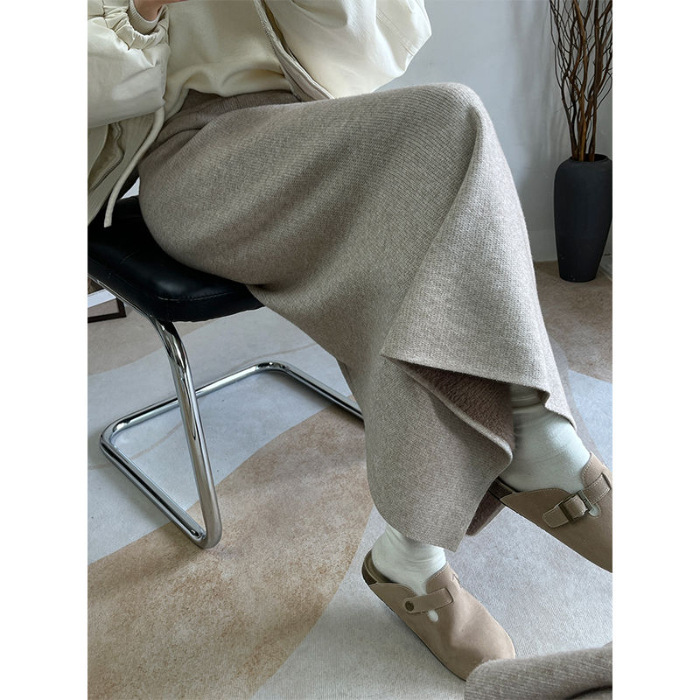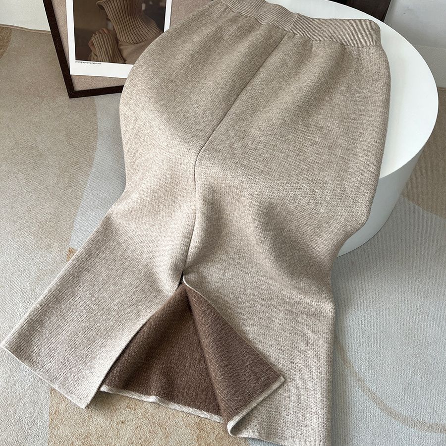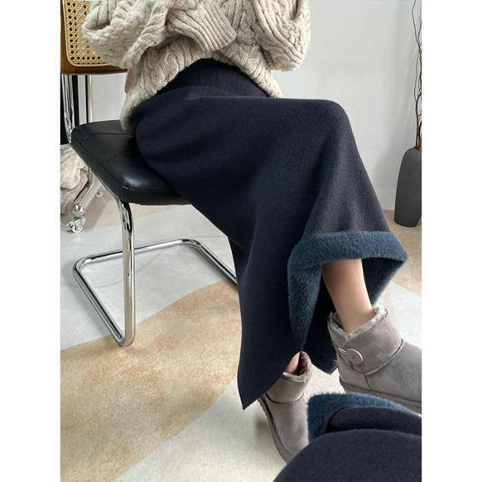 [Зимняя трикотажная юбка на флисовой подкладке] с разрезом, модная женская Свободная прямая универсальная шерстяная юбка-футляр с завышенной талией