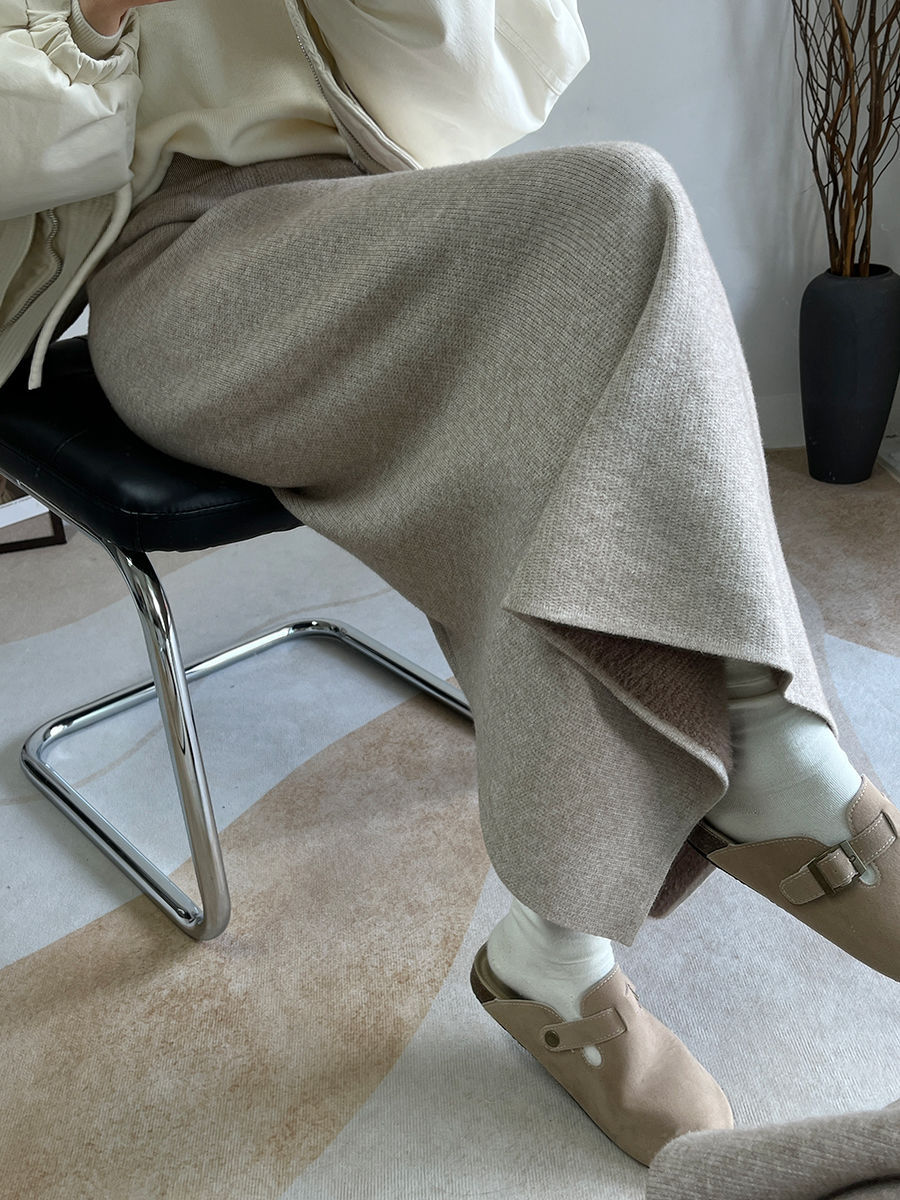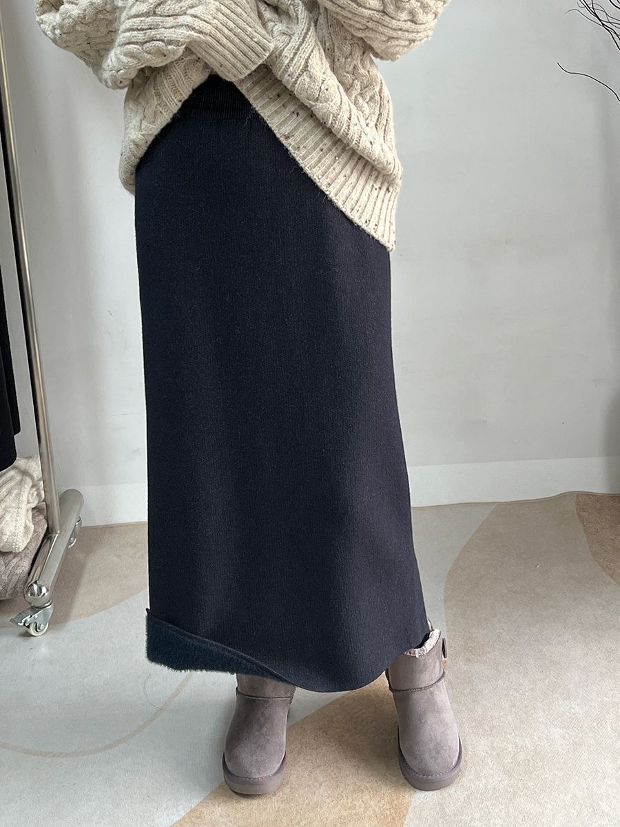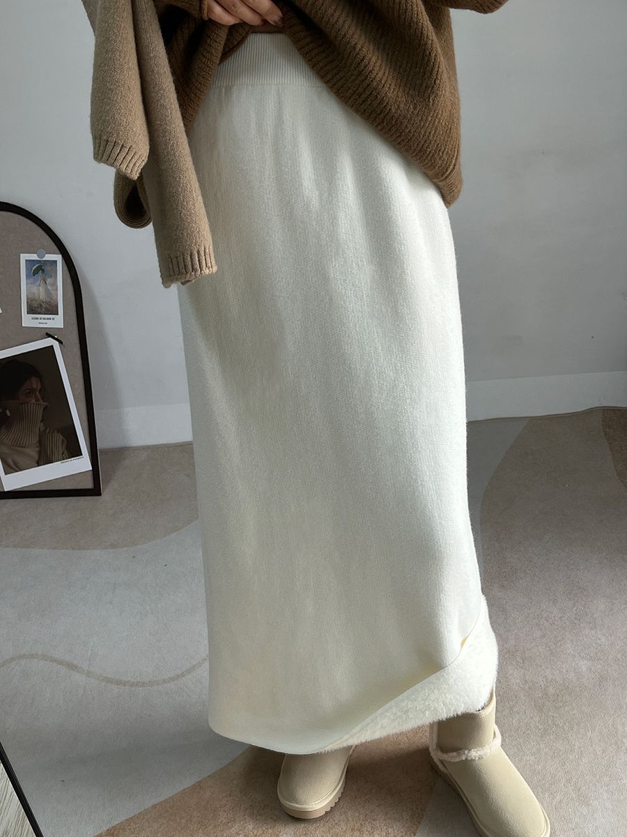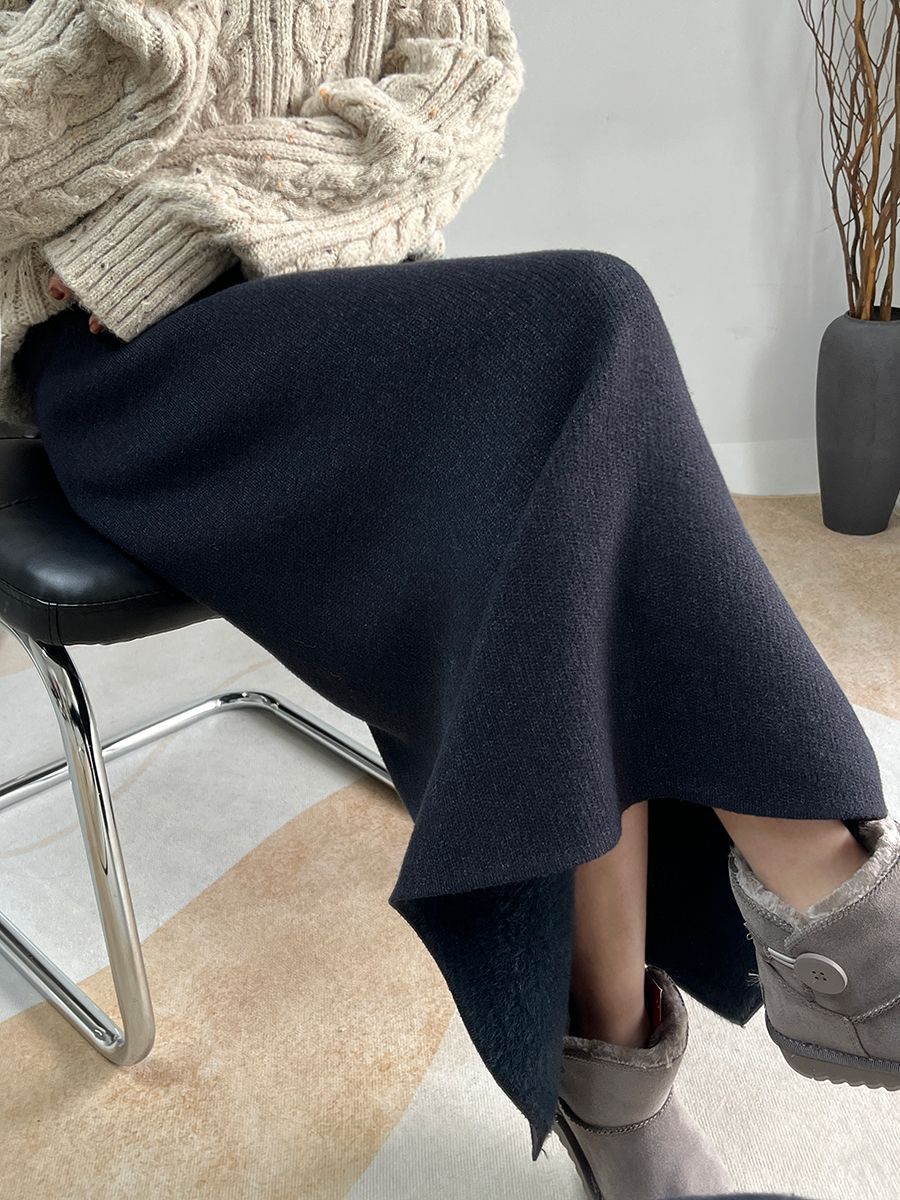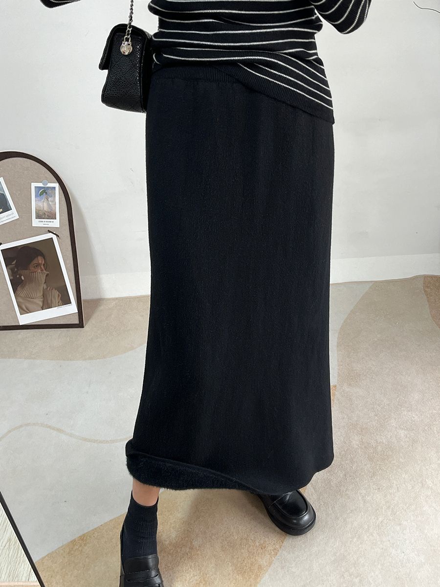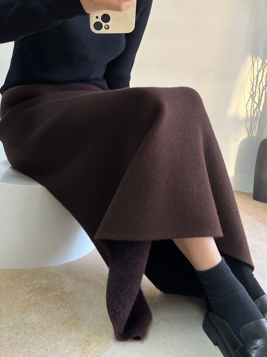 [Зимняя трикотажная юбка на флисовой подкладке] с разрезом, модная женская Свободная прямая универсальная шерстяная юбка-футляр с завышенной талией