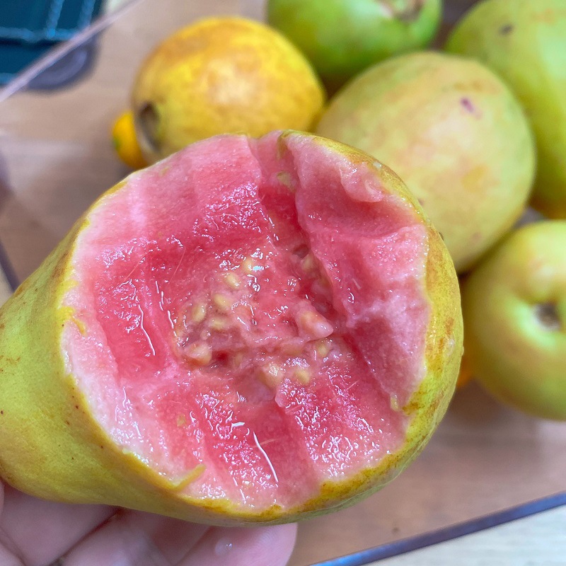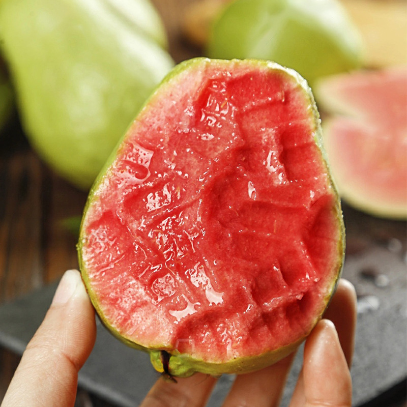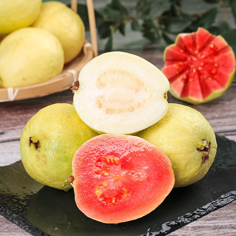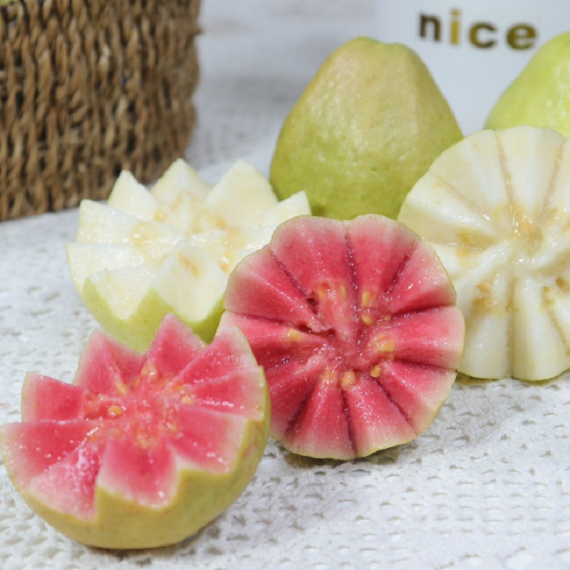 Гуава из Фуцзяня, красная и белая, смешанная, в коробке, целые плоды, крупные, с красной мякотью, свежие, мягкие, сладкие, только что собранные.