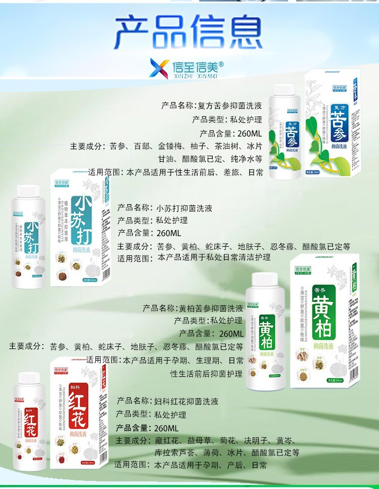 Составной антибактериальный гель для мытья Compound Sophora [Классический, 260 мл]; Составной раствор софоры желтозеленой [новое поступление]; Лосьон с экстрактами софоры желтой и феллодендрона [хит продаж, 260 мл]; Женское средство для ухода Bear Orange [300 мл]; Составной раствор для ухода за софорой желтозеленой [300 мл]; Лосьон с экстрактами софоры желтой и феллодендрона [300 мл]; Гинекологический лосьон с сафлором [260 мл]; Гинекологический лосьон с сафлором [в формате спрея]; Лосьон с пищевой содой [260 мл}; Лосьон с экстрактами софоры желтой и феллодендрона [260 мл]; Гинекологический лосьон с сафлором [260 мл]
