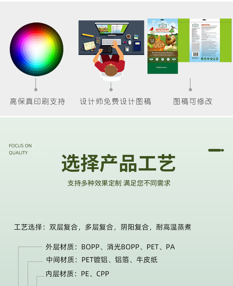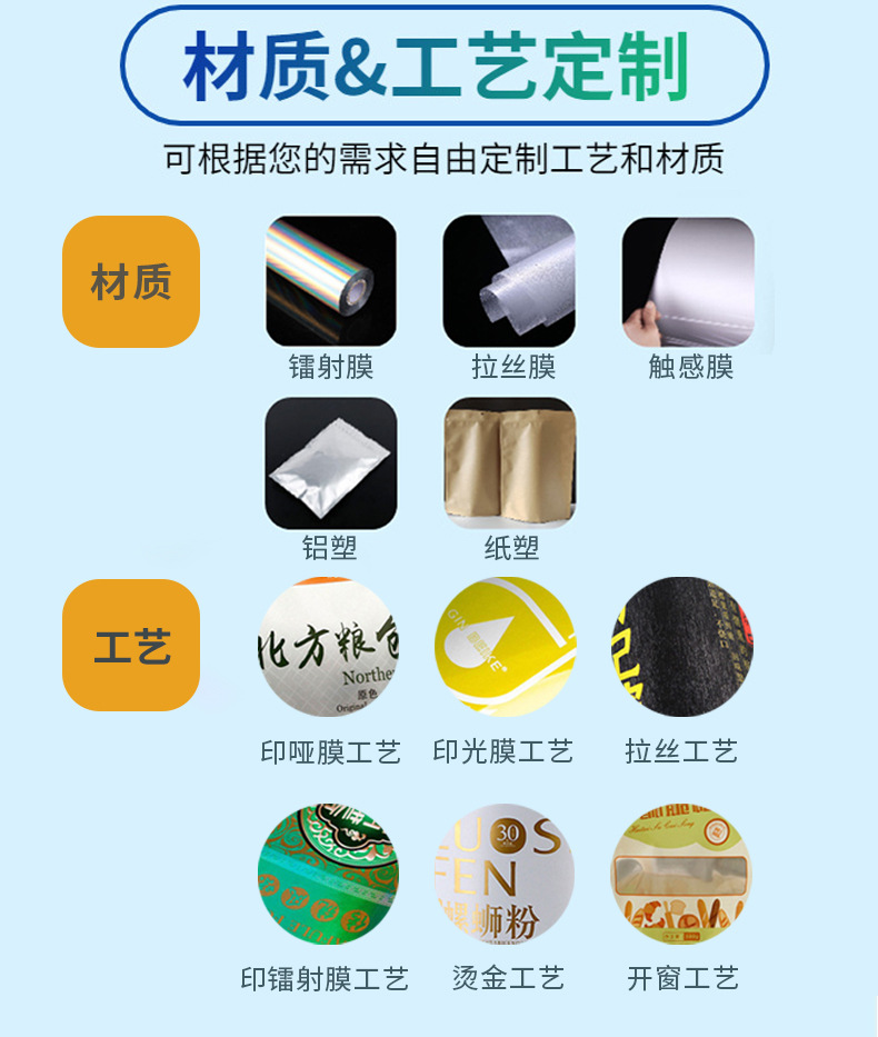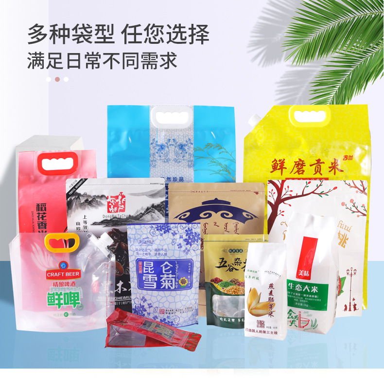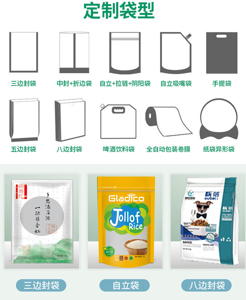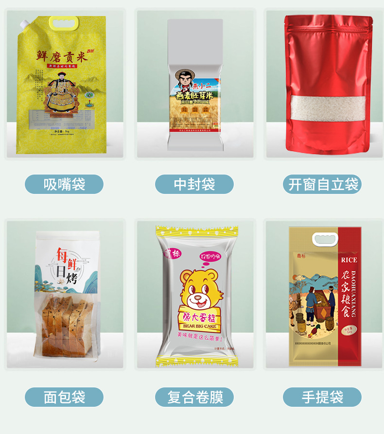 Получить образец [Проконсультируйтесь со службой поддержки клиентов]; вакуумный мешок; Коричневый упаковочный бумажный пакет; Композитная рулонная пленка; Отдельно стоящая сумка с застежкой-молнией.; Восемь боковых уплотнительных пакетов; корм для собак, мешок для корма для кошек; мешок из алюминиевой фольги; мешок для насадок; пакет для тостов с хлебом; мешок с рисом; Сумки специальной формы; Различные пакеты для еды; сумка для маски; Другие упаковочные пакеты