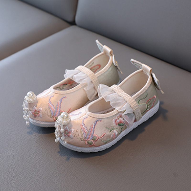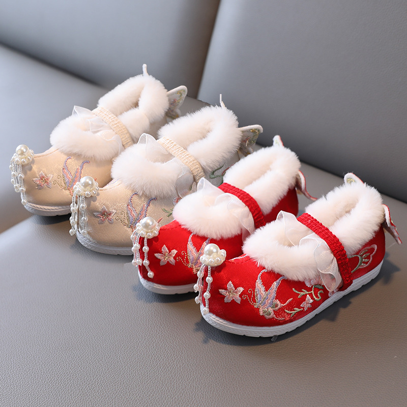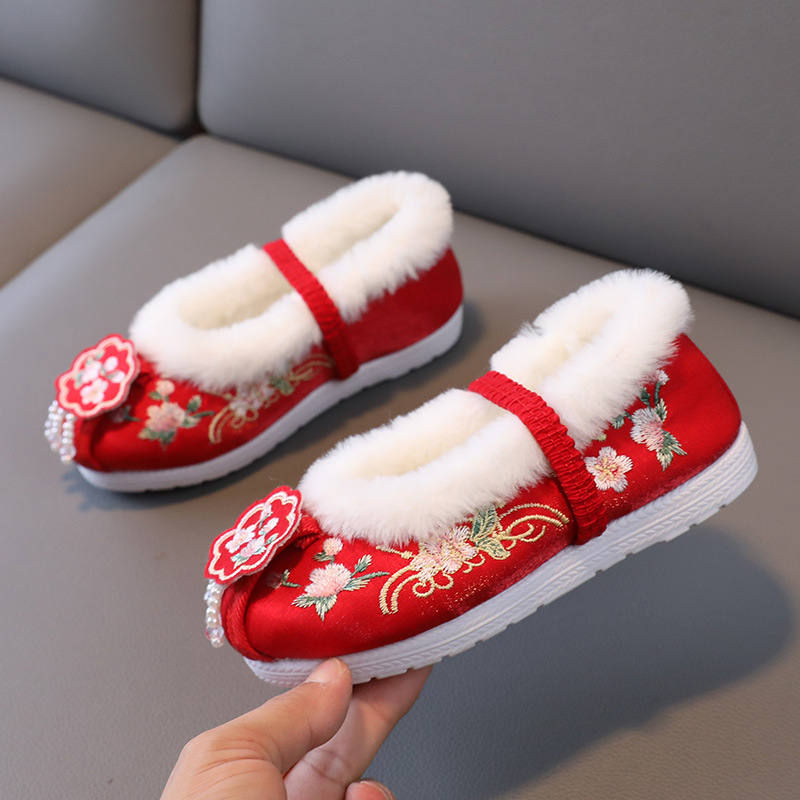 Обувь Hanfu для девочек, зимний старинный костюм на флисовой подкладке, детская обувь с вышивкой, старинный стиль, детская подходящая юбка с верхом, хлопковая обувь с перекрестным носком