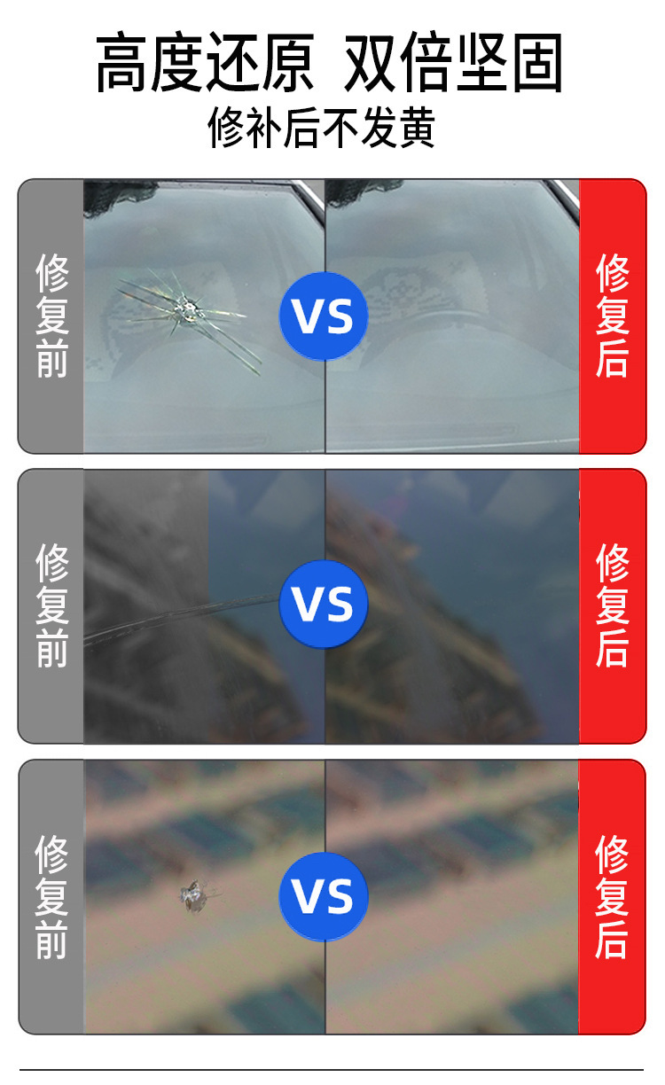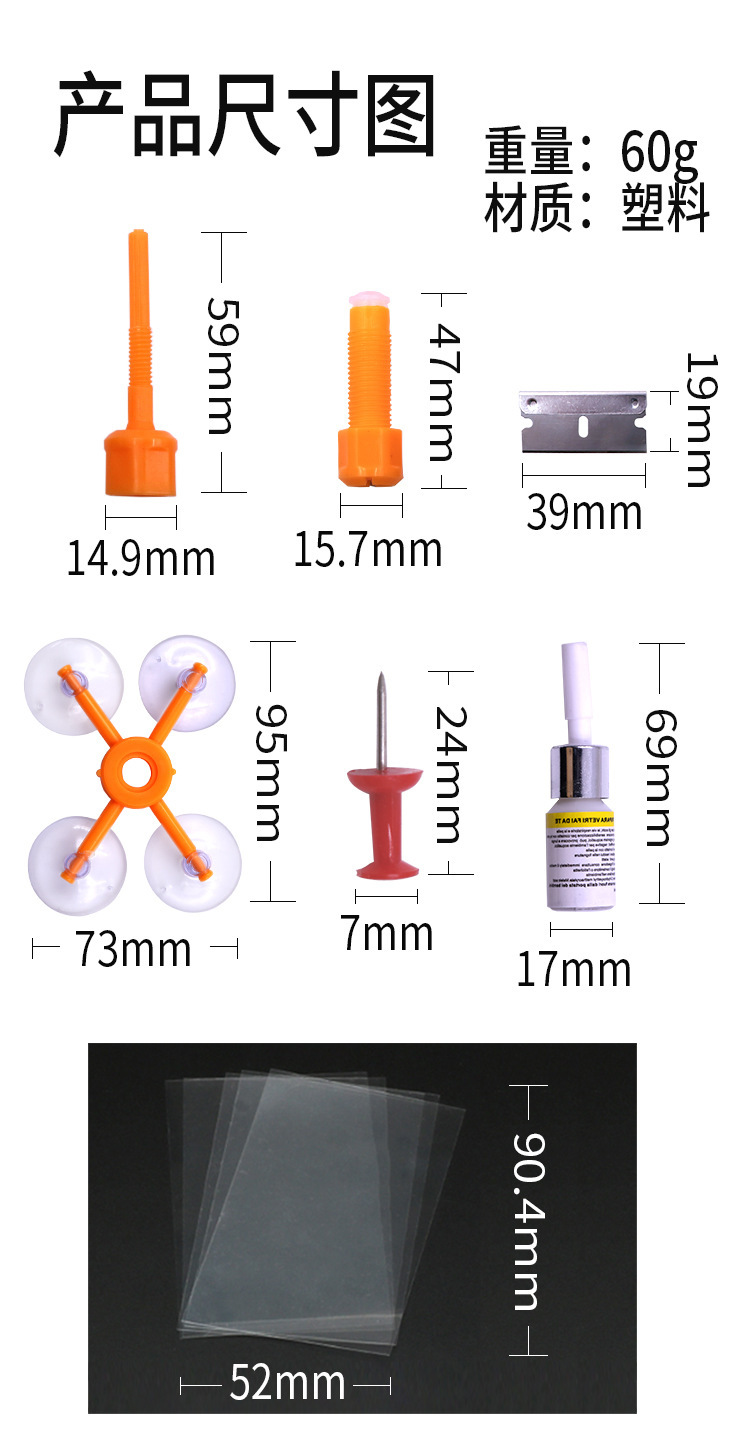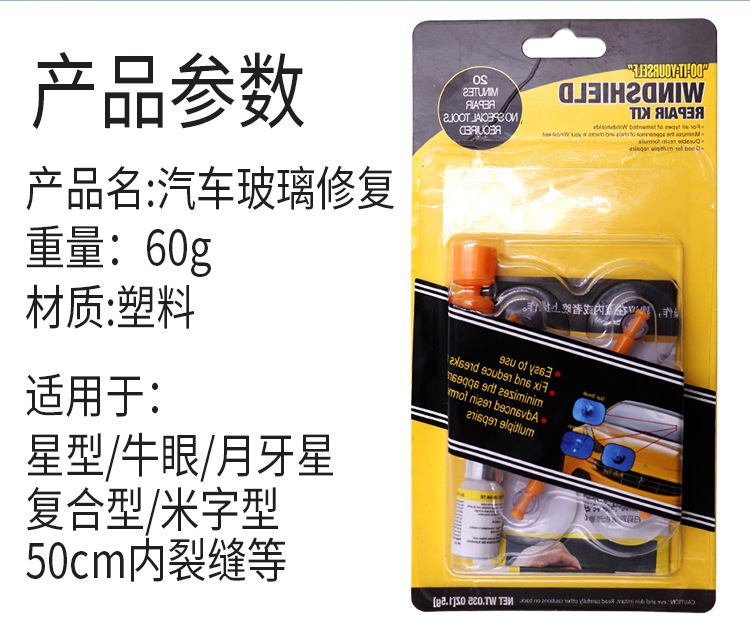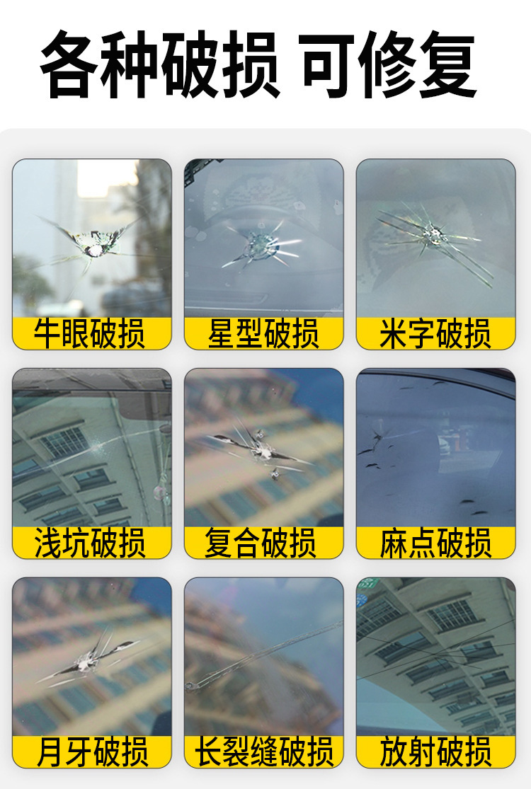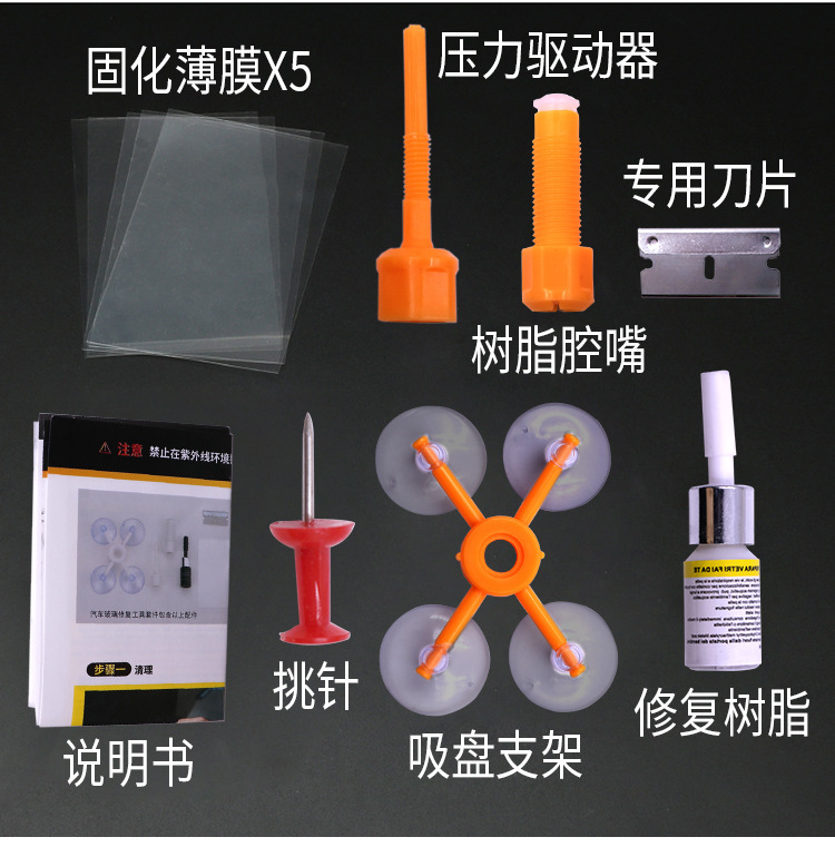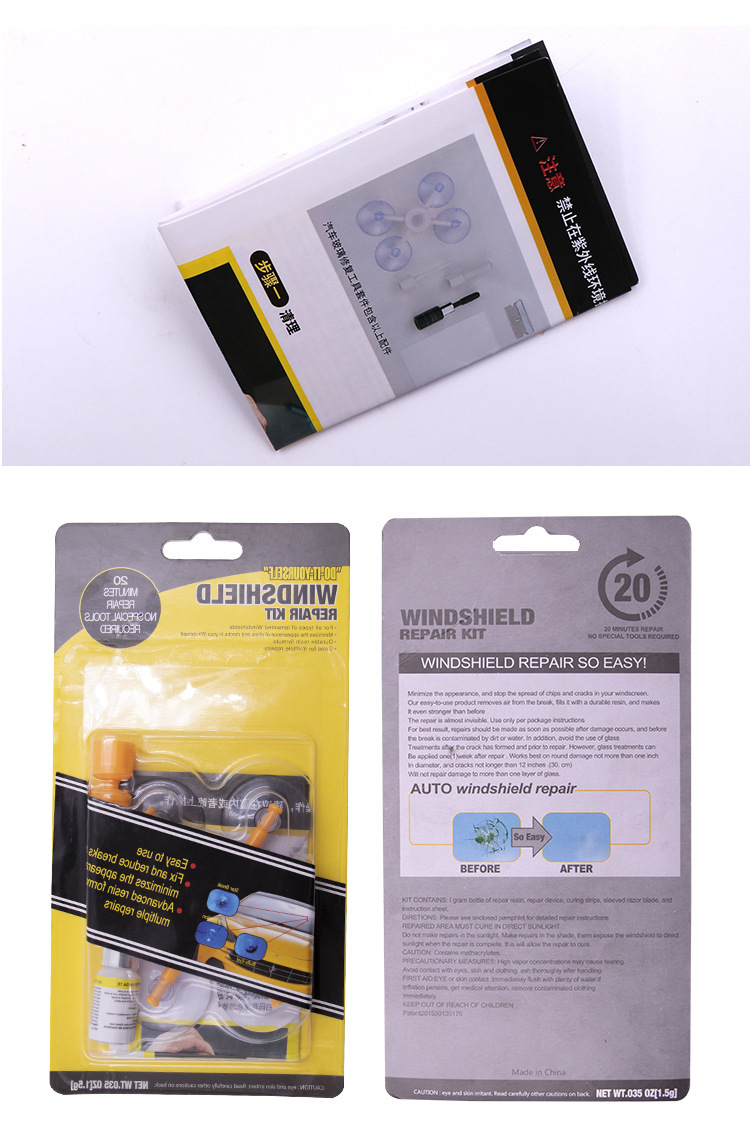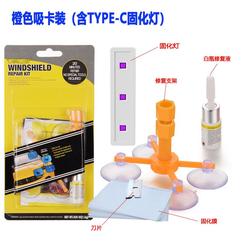 Черный комплект из трех предметов; Оранжевый инструмент для ремонта стекла с присоской; Белый комплект из трех предметов; Желтый комплект из трех предметов; Черная одинарная бутылка; Белая одинарная бутылка; Желтый одинарный флакон; Зеленая блистерная упаковка в виде шприца [подходит для длинных трещин и повреждений]; 1 бутылка белого + 1 бутылка черного цвета + инструменты; Белые 2 бутылки + инструменты; Оранжевый инструмент для ремонта стекла с присоской и УФ-лампой
