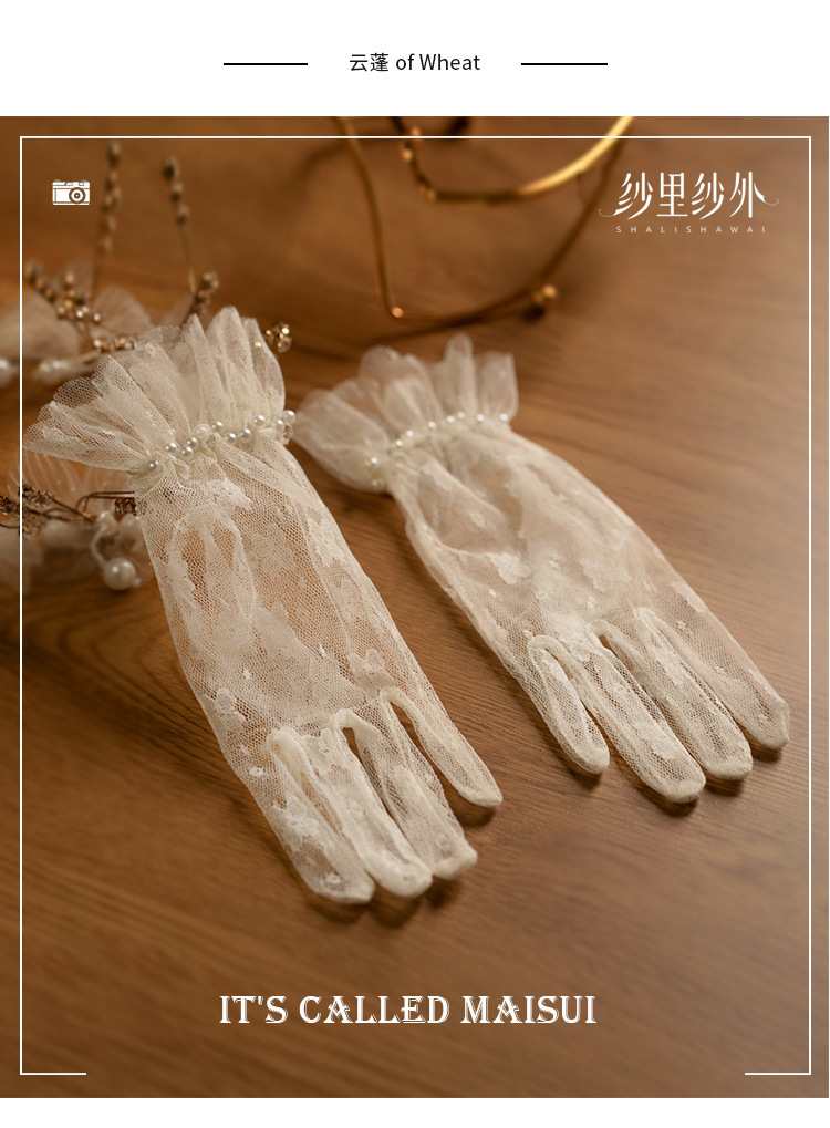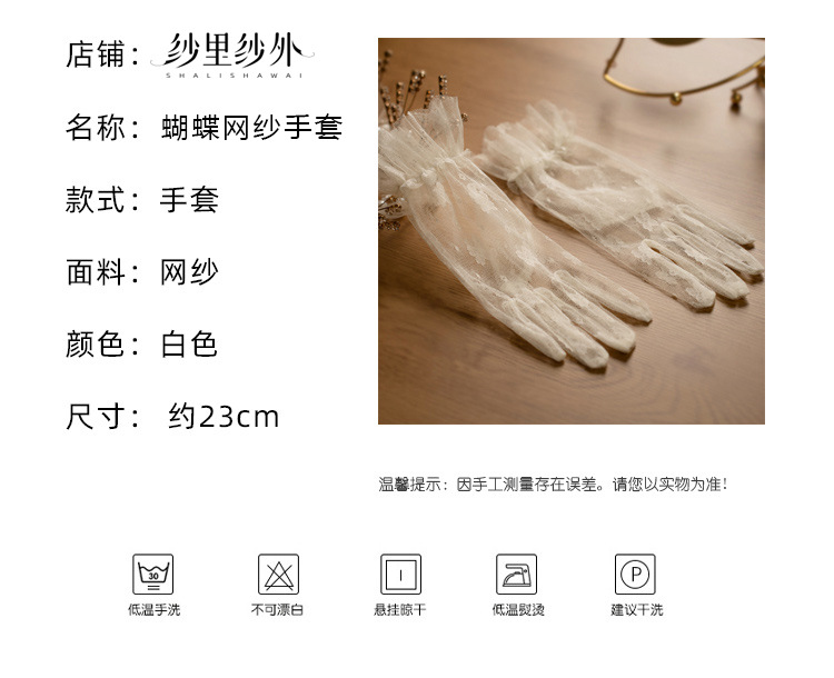 Перчатки из кремовой сетки-бабочки с кругом из бисера; Перчатки из кремовой сетки-бабочки с атласным бантом; Почерепашьи перчатки из органзы с украшением из органзы; Перчатки из кремовой сетки-бабочки; Сетчатые перчатки из простой пряжи
