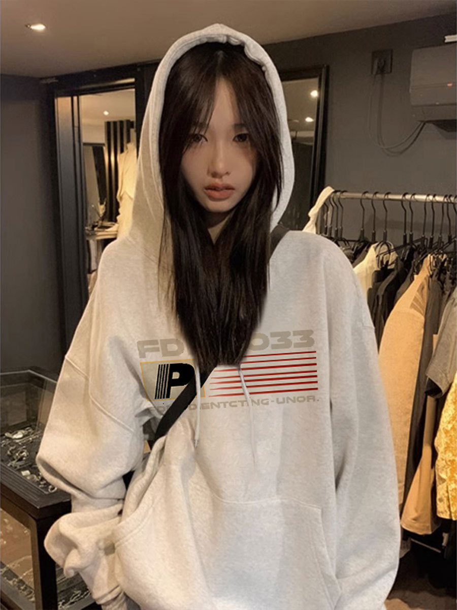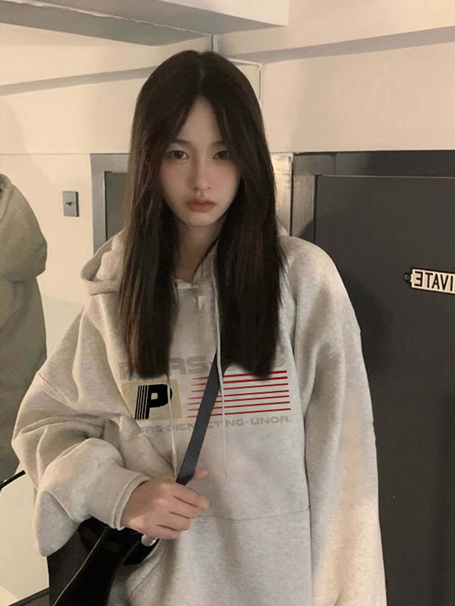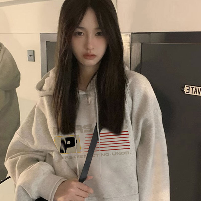 Серый свитер на флисовой подкладке в Корейском стиле с буквенным принтом для студенток, Осень-зима, Новый Свободный пуловер с капюшоном, женское Верхнее пальто