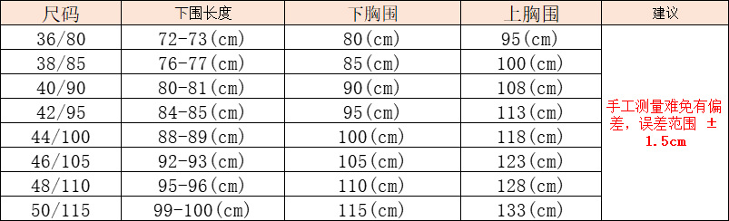 75/34; 80/36; 85/38; 90/40; 95/42; 100/44; 105/46