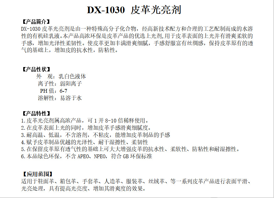 125 кг/баррель; Высокая термостойкость, низкая температура, отсутствие растворителя, антипригарная кожа, может усилить ощущение рук от кожаных изделий 4. Придайте кожаным изделиям Превосходный блеск, стойкость к влажному и сухому истиранию, гибкость; Внешний вид: молочно-белая жидкость ионная: значение pH слабого катиона: 6-7