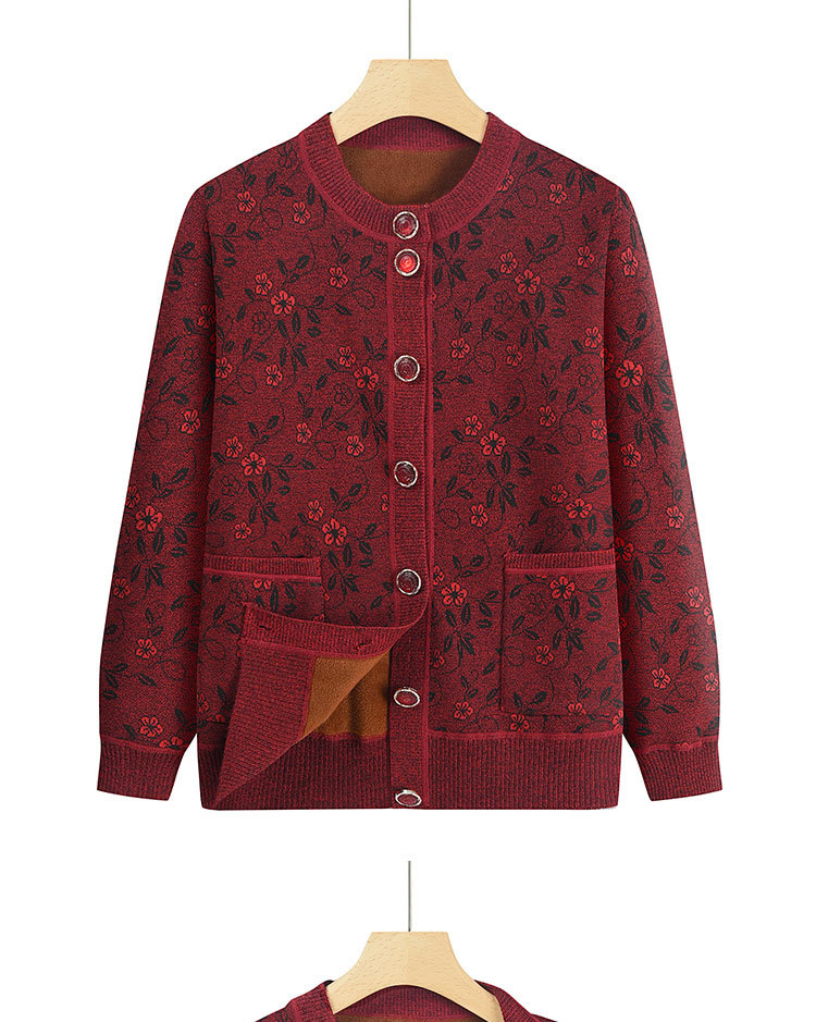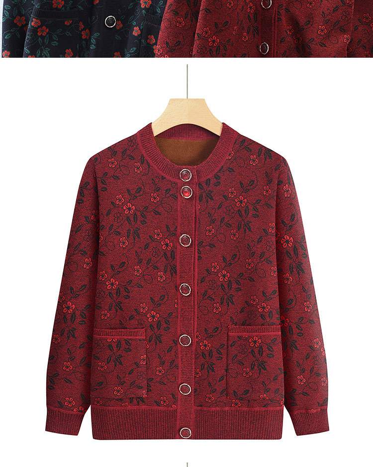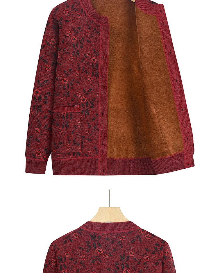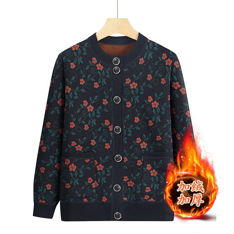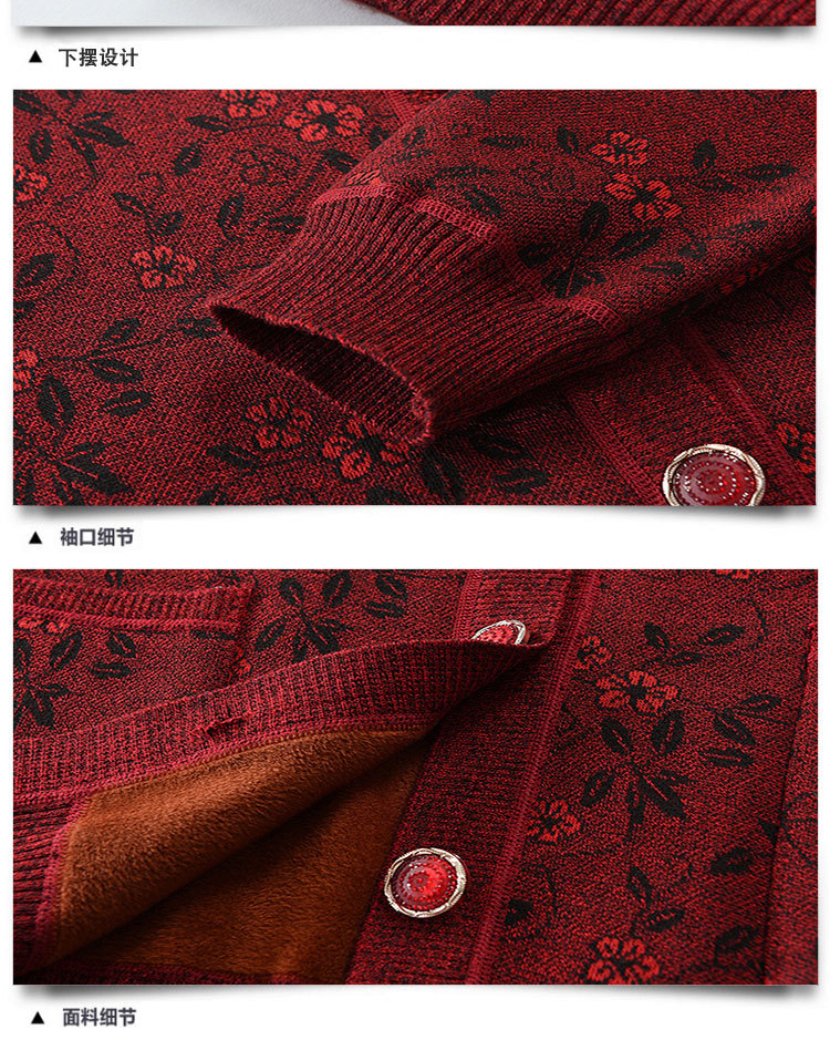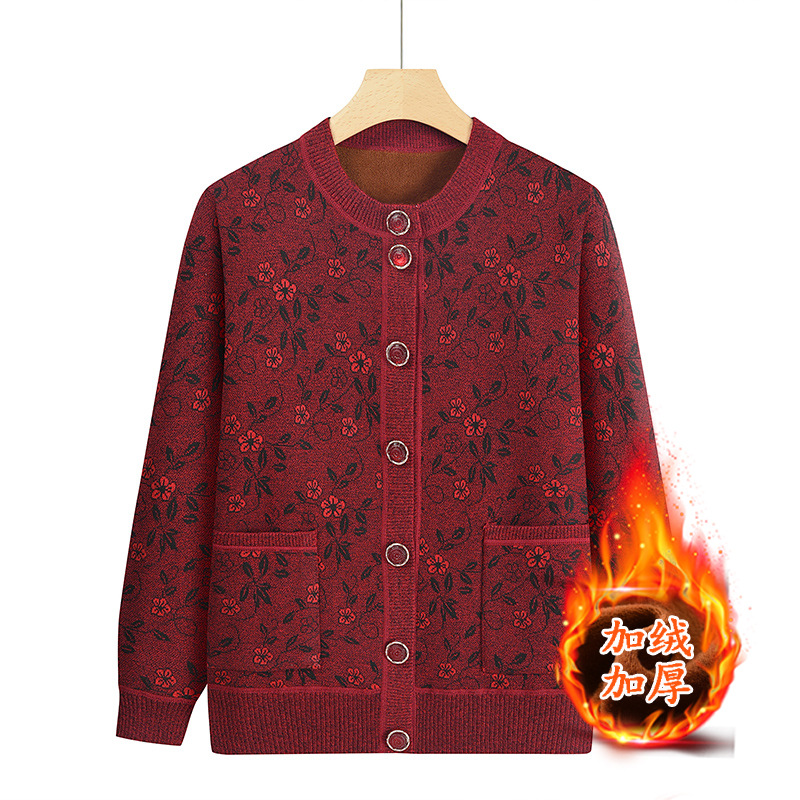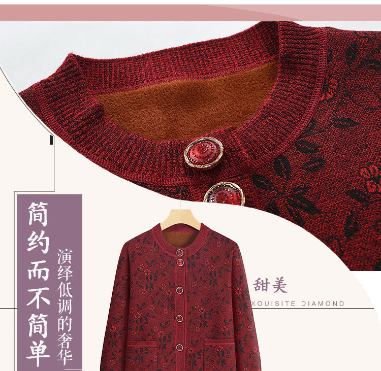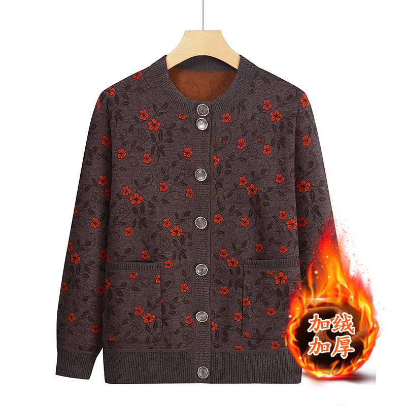 Теплое пальто с круглым вырезом и принтом для среднего и пожилого возраста, осенне-зимний свитер для бабушки, вязаный кардиган, повседневный топ на флисовой подкладке