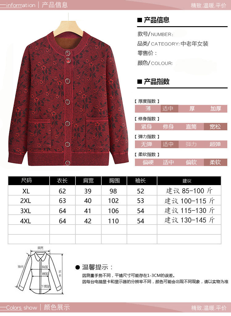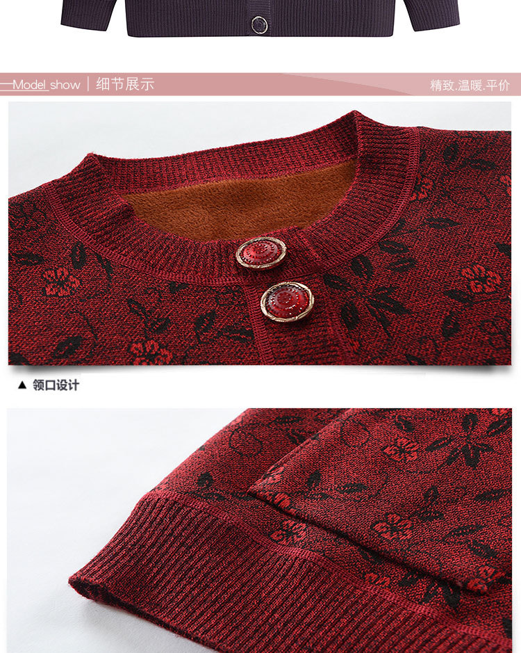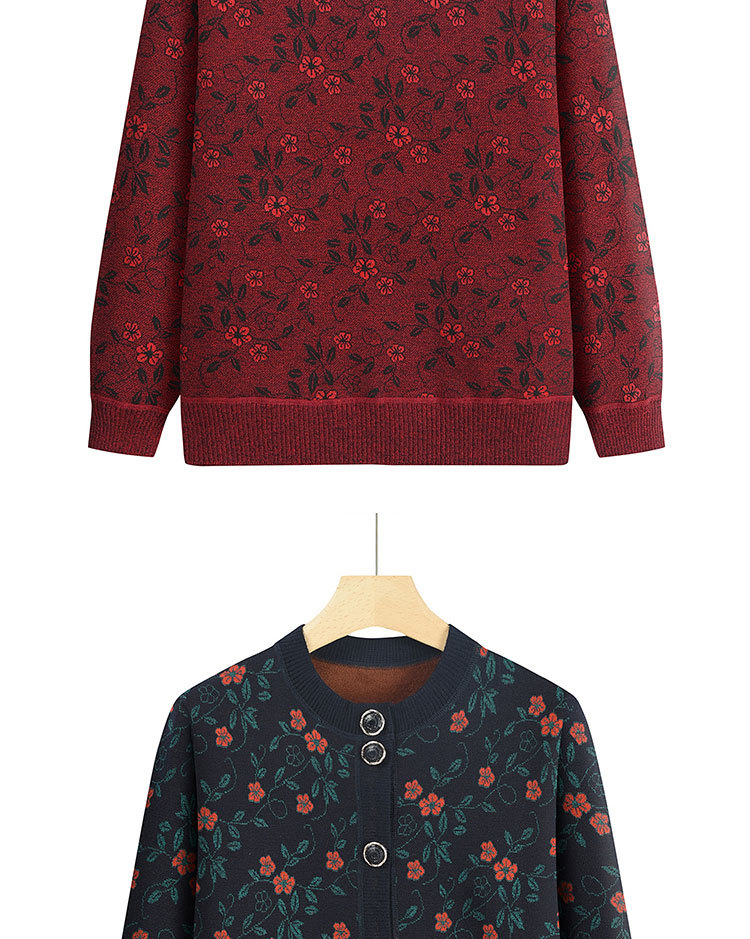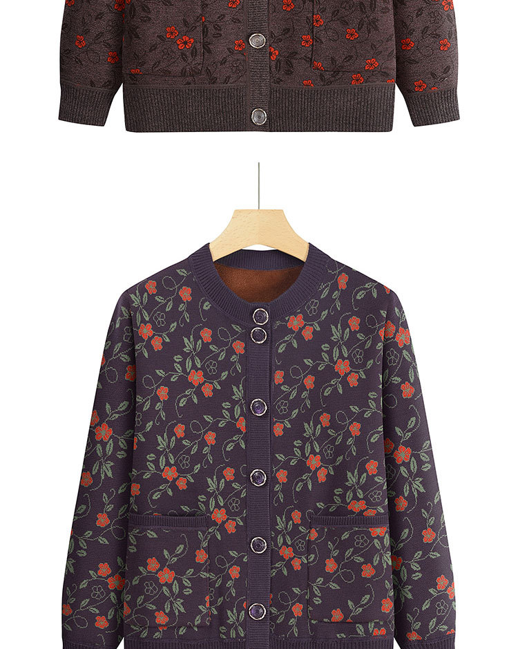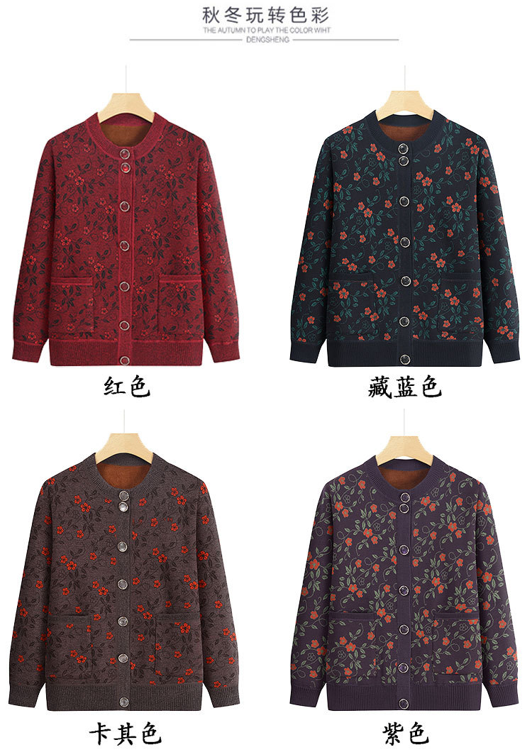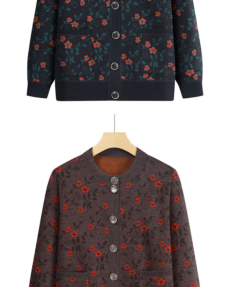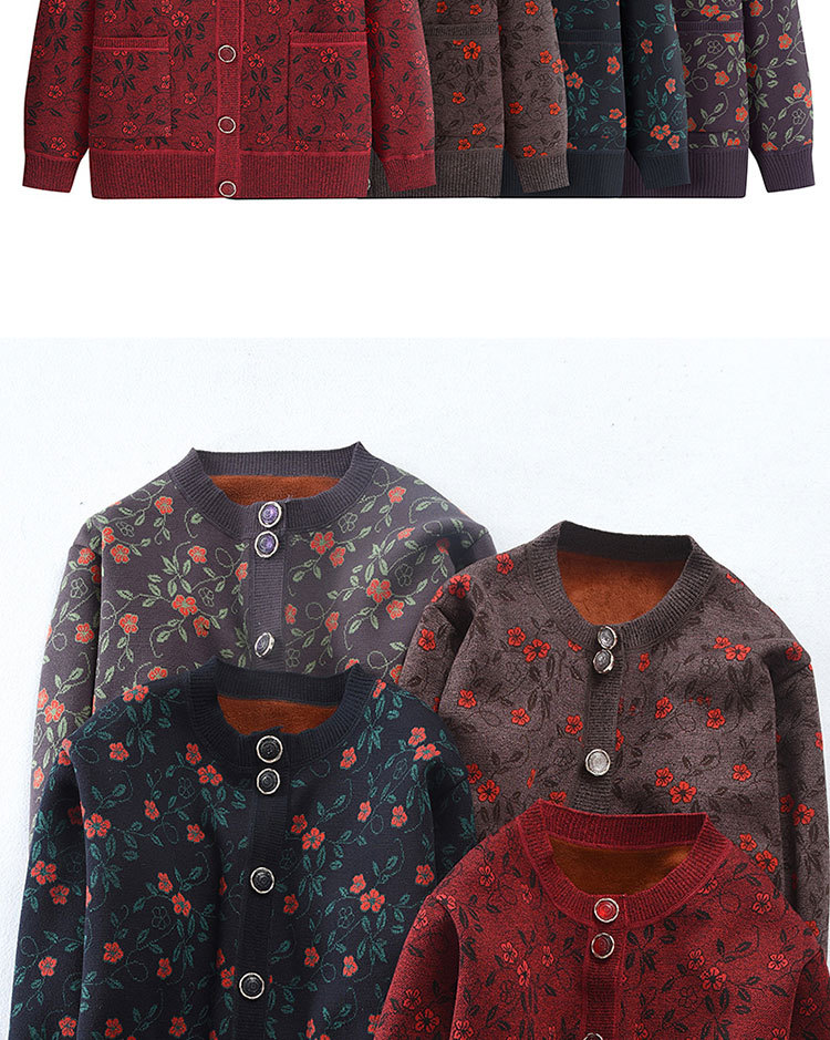 Теплое пальто с круглым вырезом и принтом для среднего и пожилого возраста, осенне-зимний свитер для бабушки, вязаный кардиган, повседневный топ на флисовой подкладке