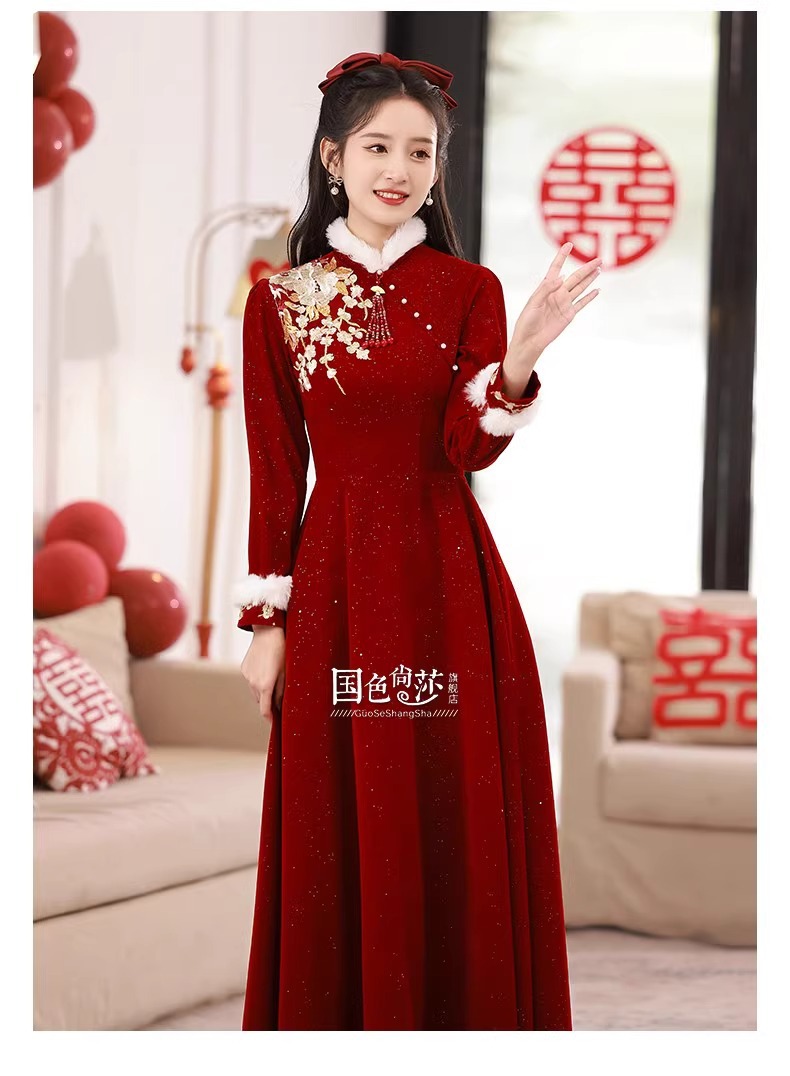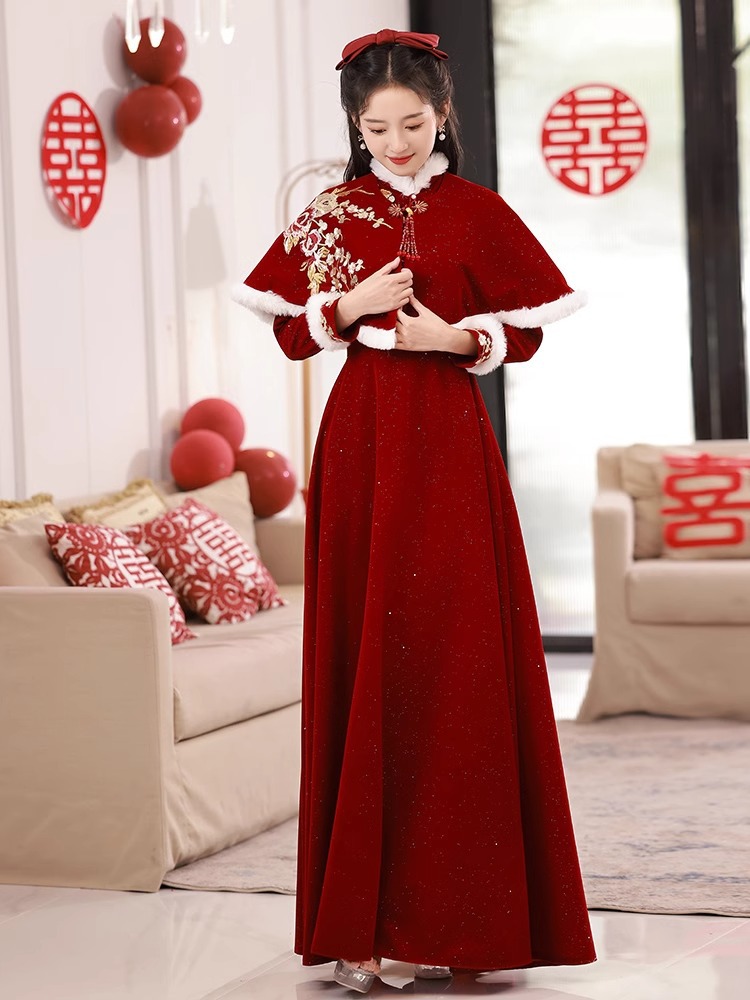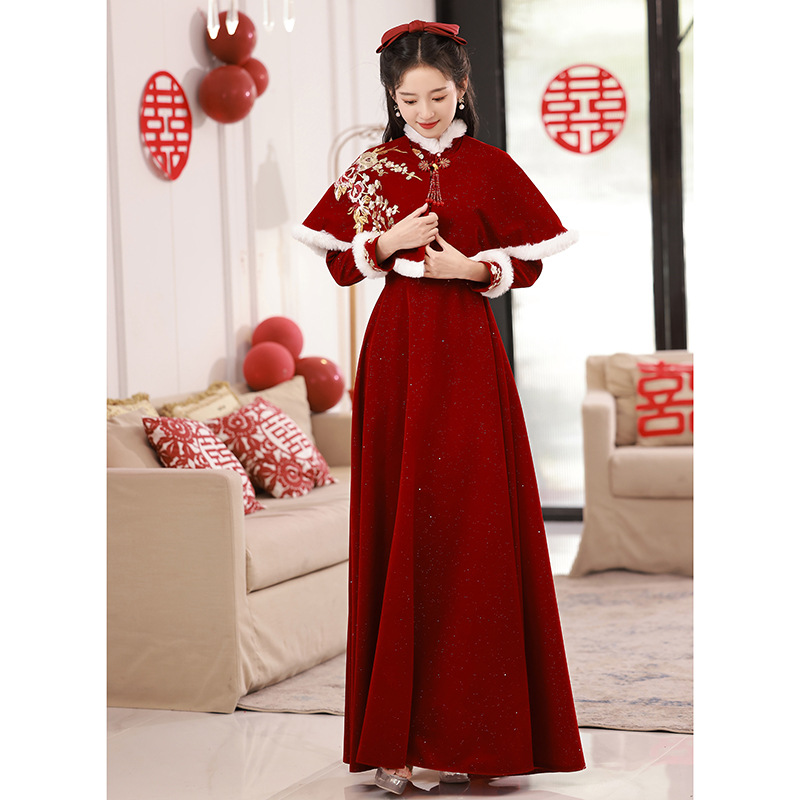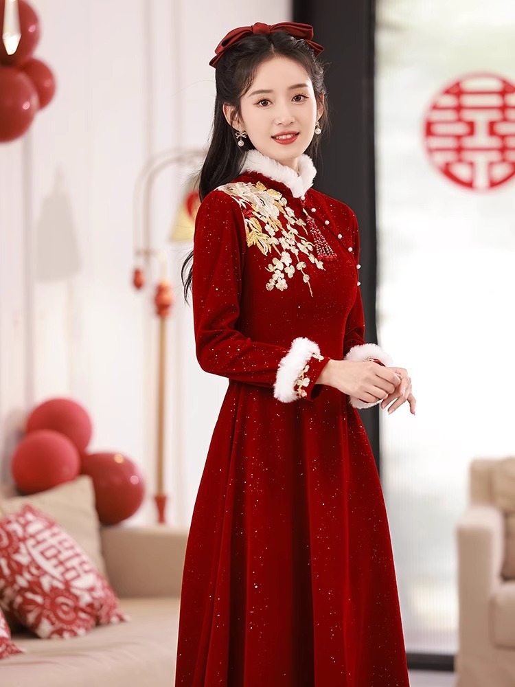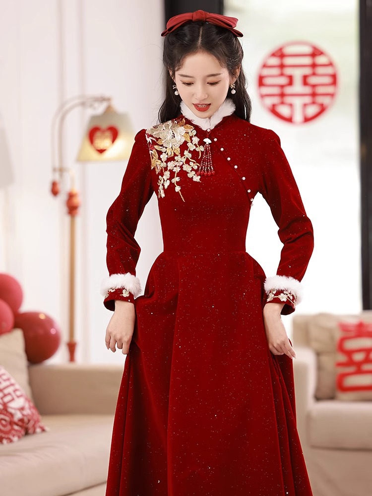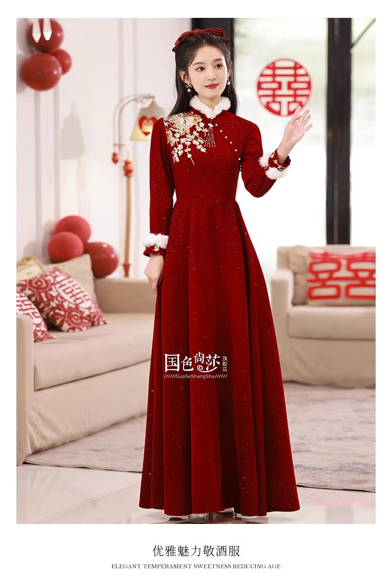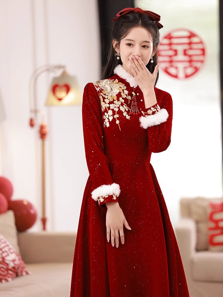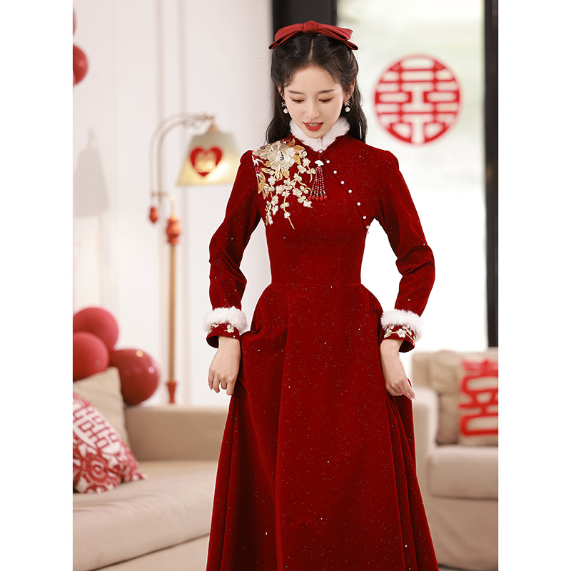 Платье для невесты 2025, новое зимнее бархатное чонсам с длинными рукавами, высококачественное бордовое свадебное платье для помолвки