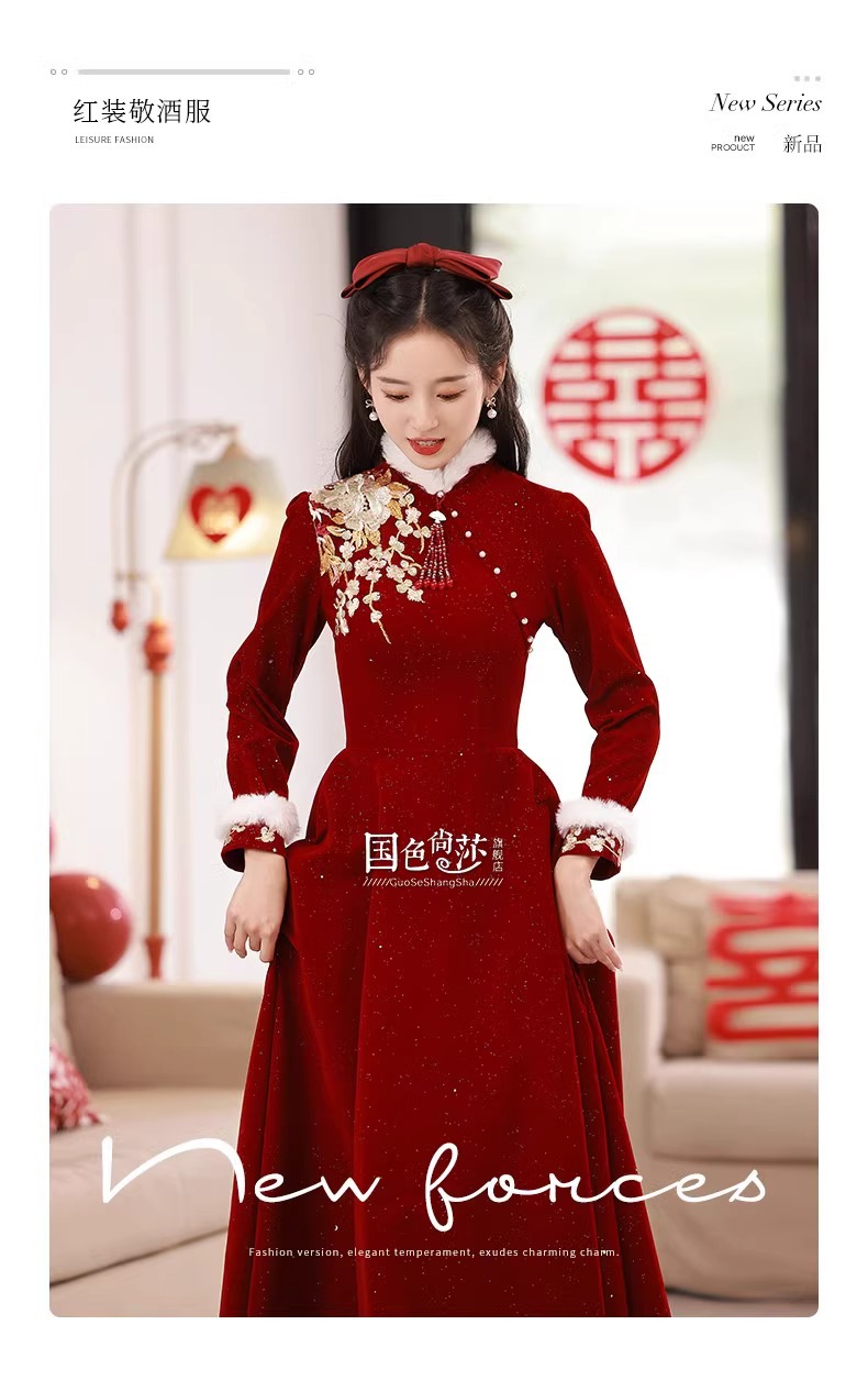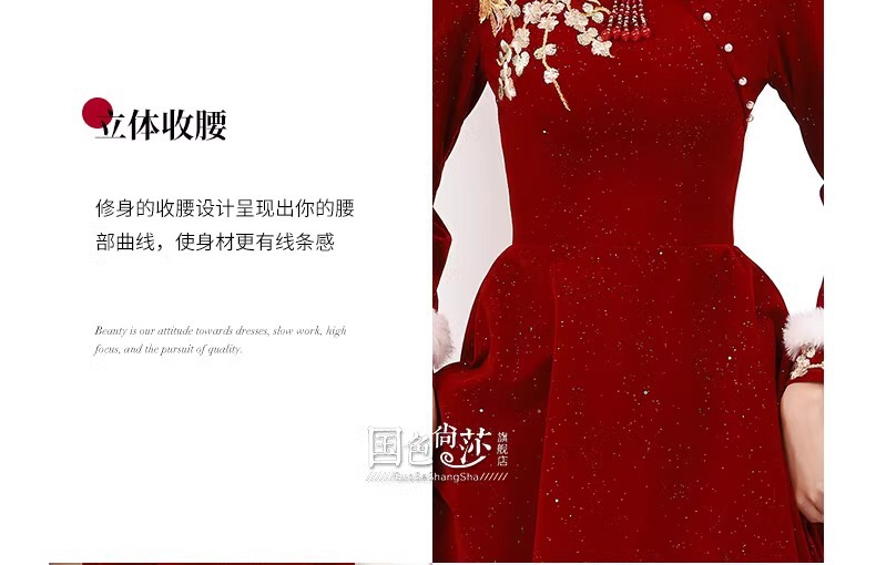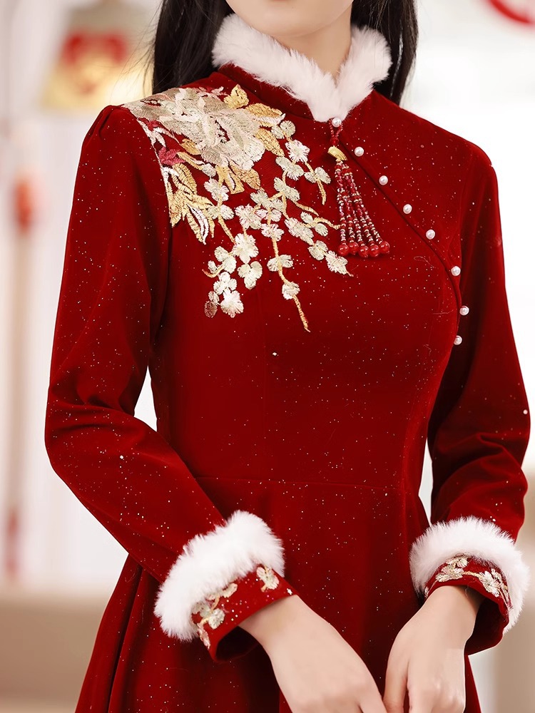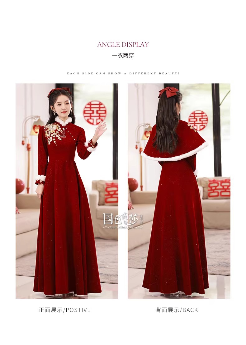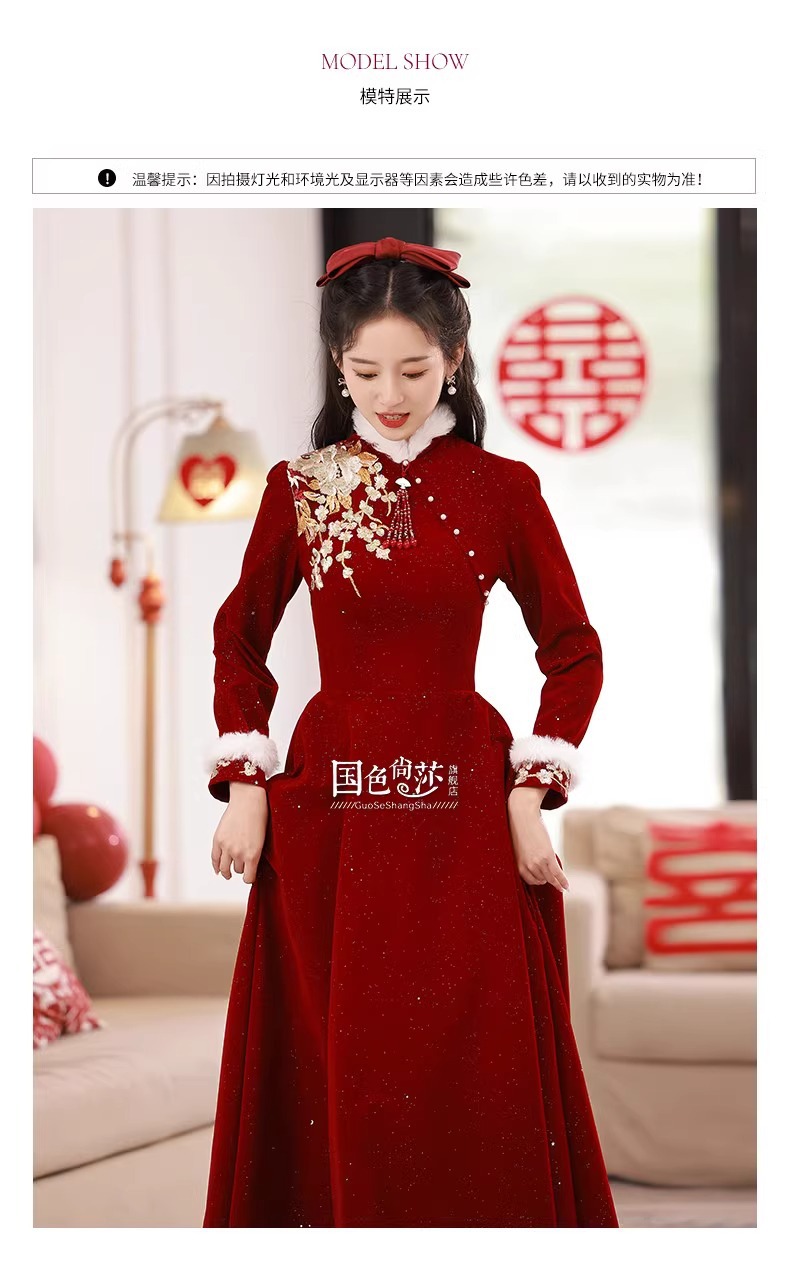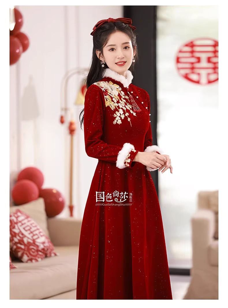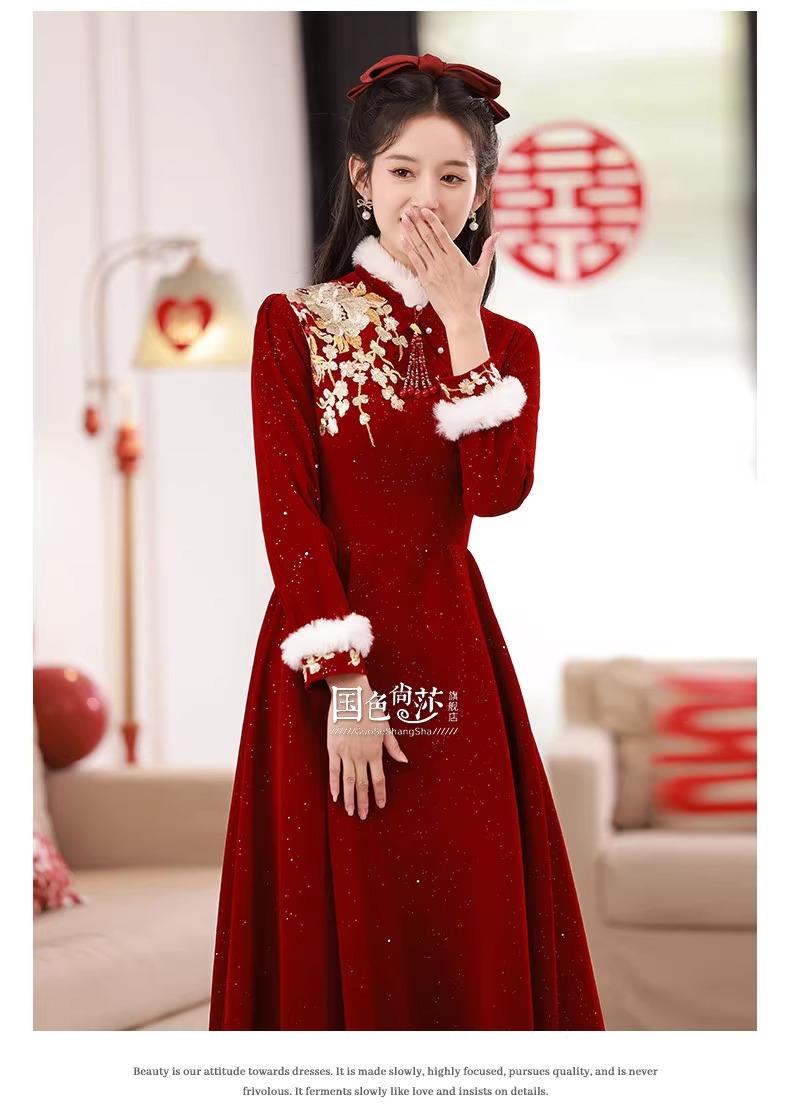 Платье для невесты 2025, новое зимнее бархатное чонсам с длинными рукавами, высококачественное бордовое свадебное платье для помолвки