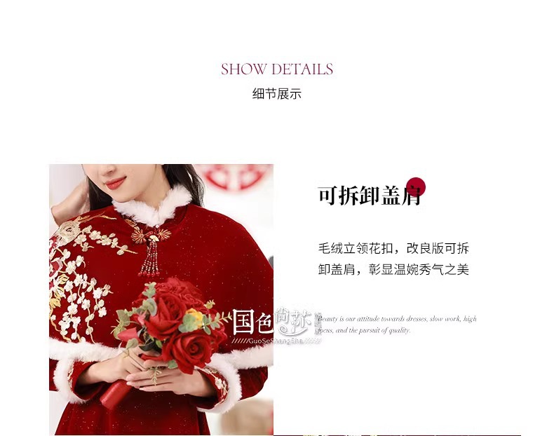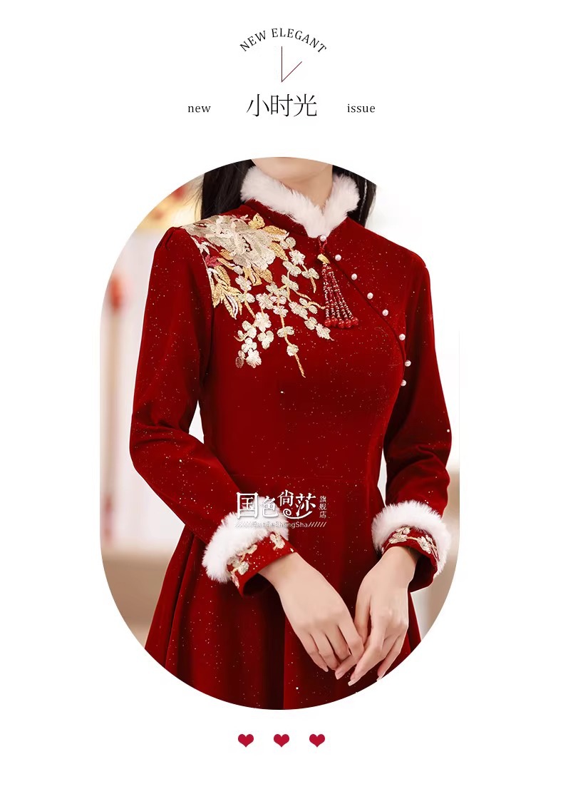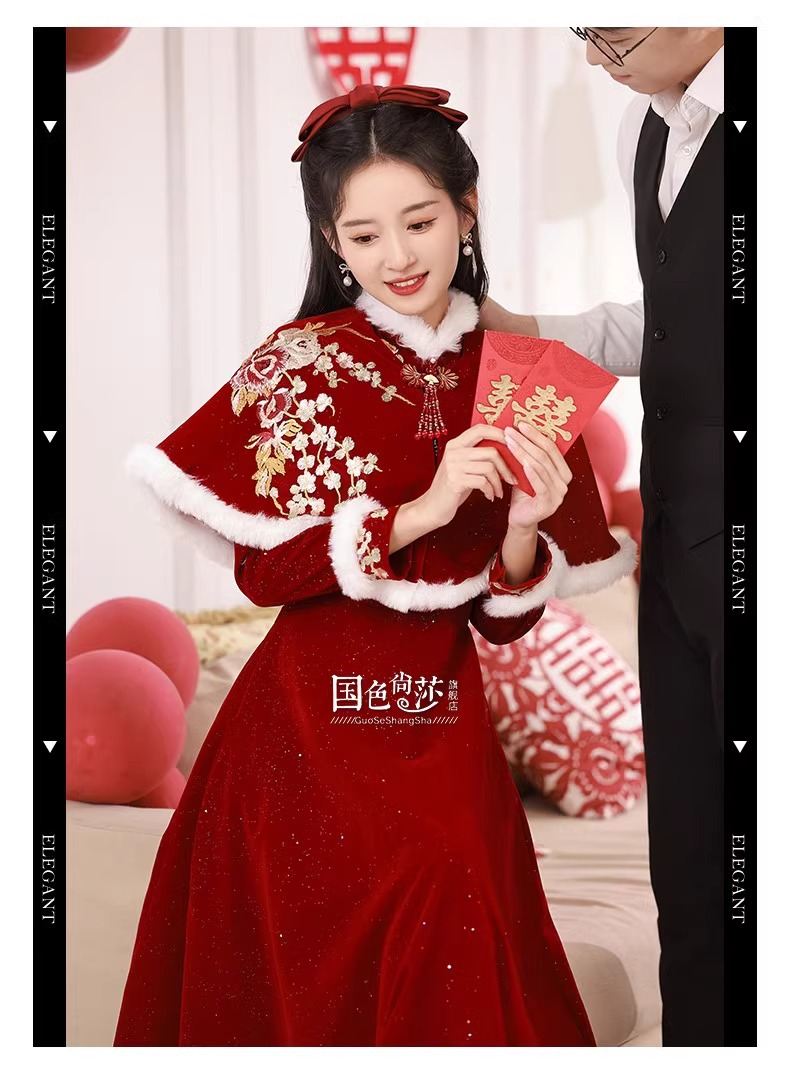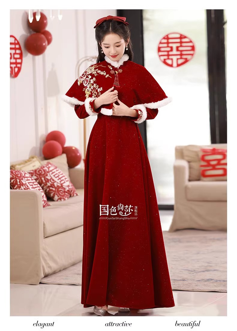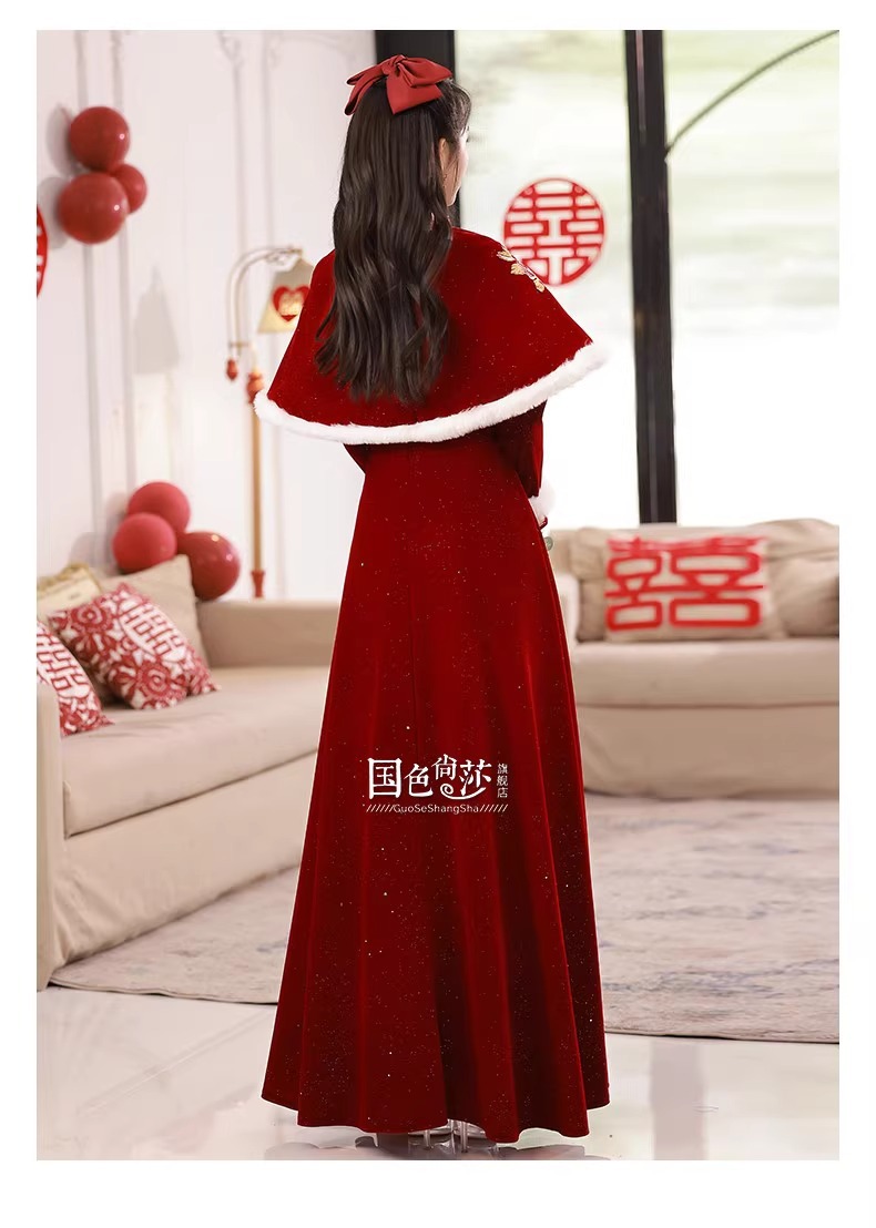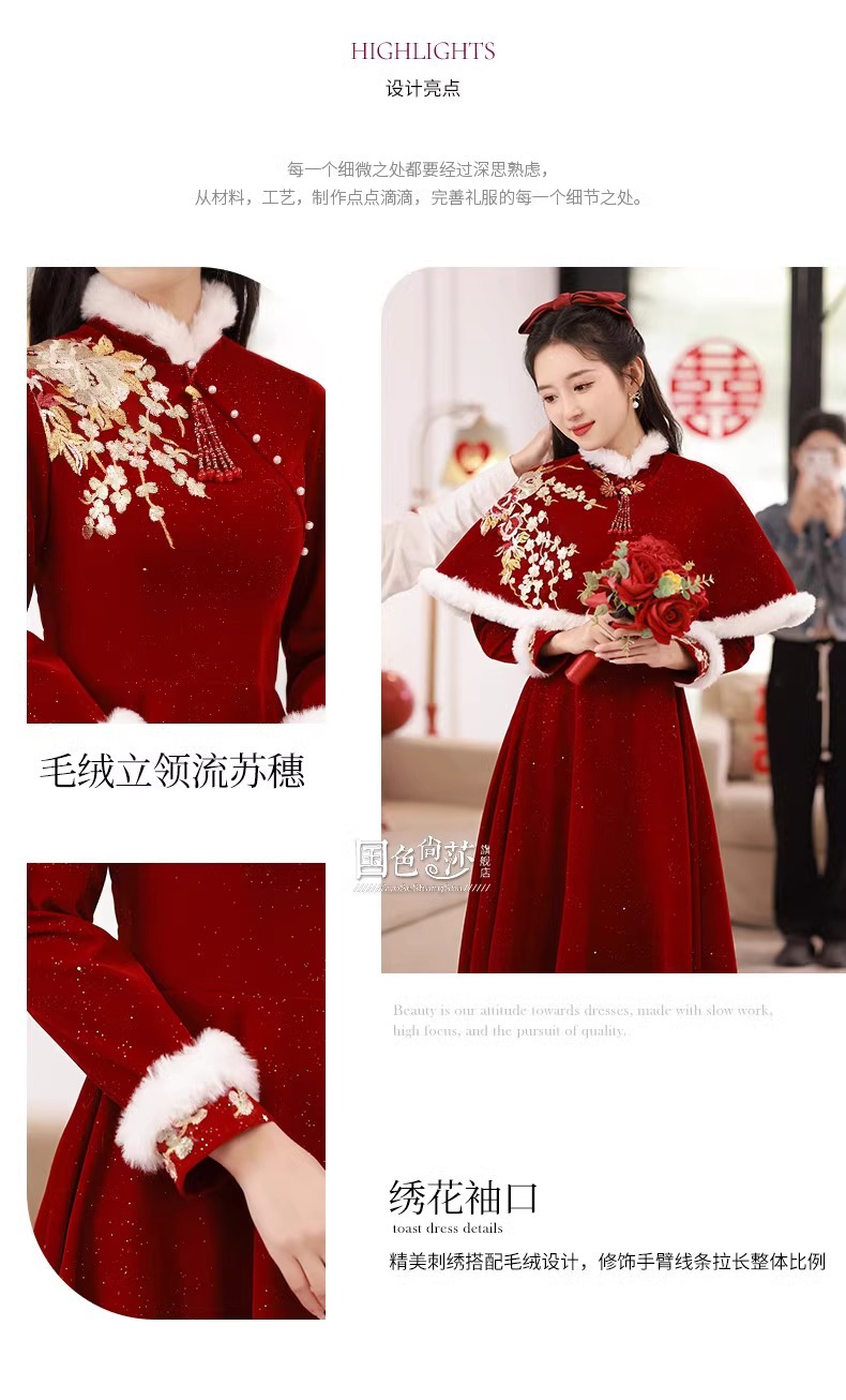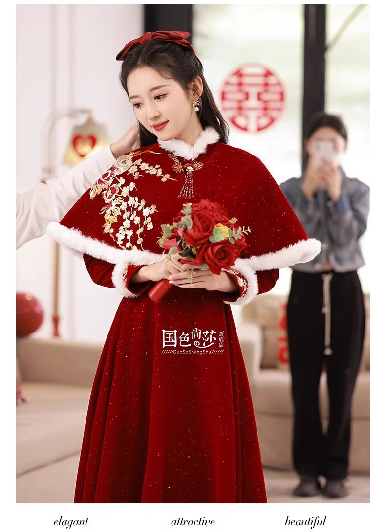 Платье для невесты 2025, новое зимнее бархатное чонсам с длинными рукавами, высококачественное бордовое свадебное платье для помолвки