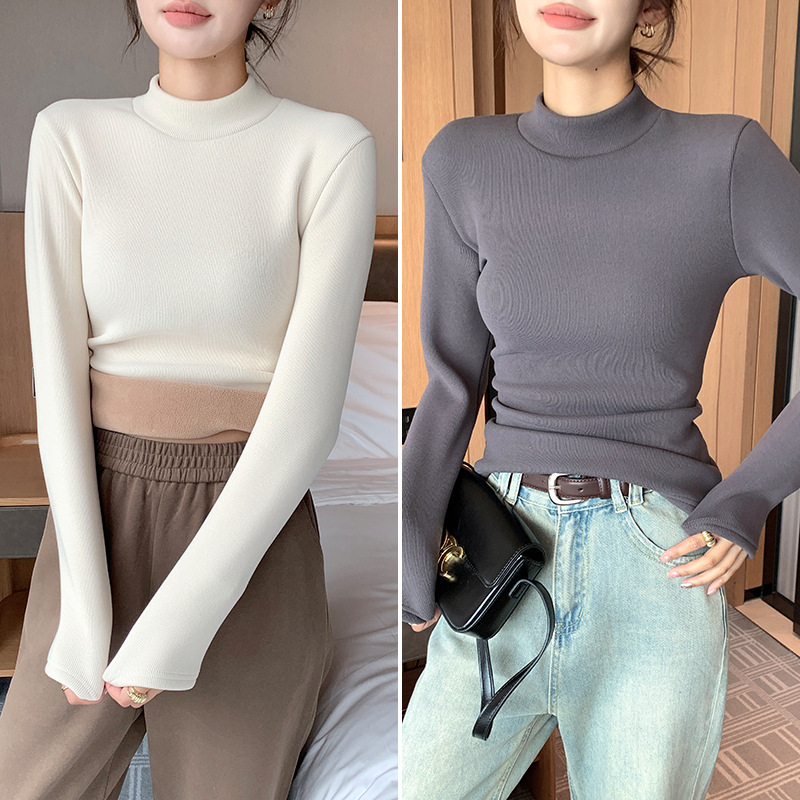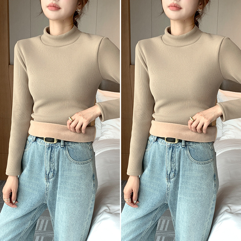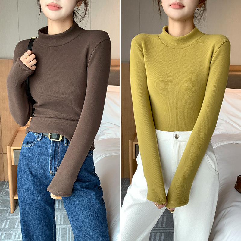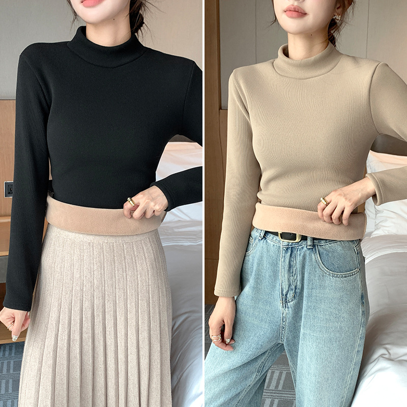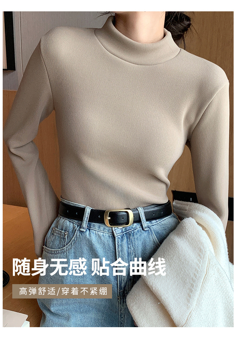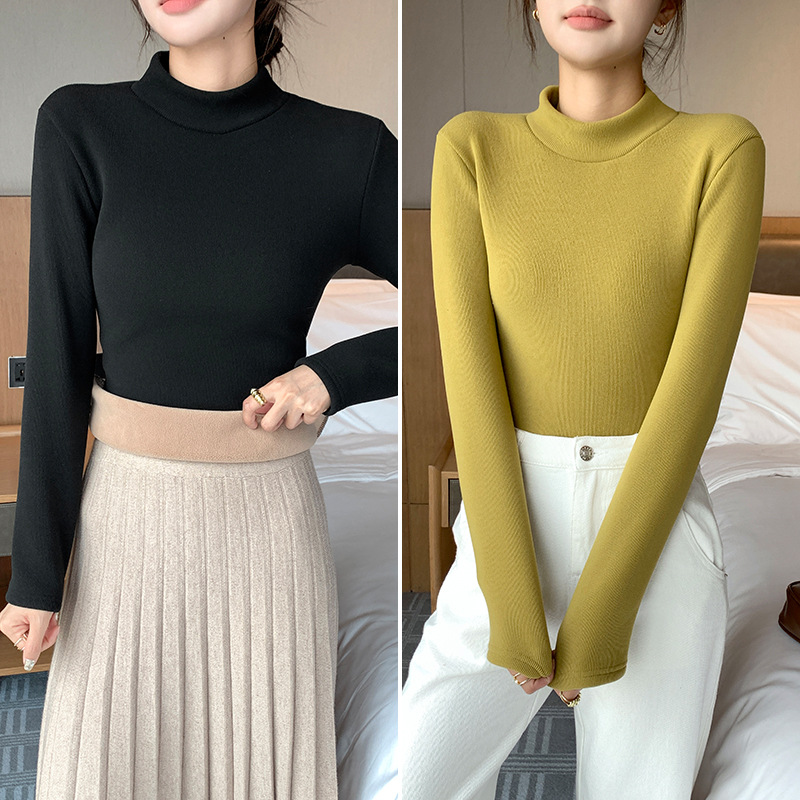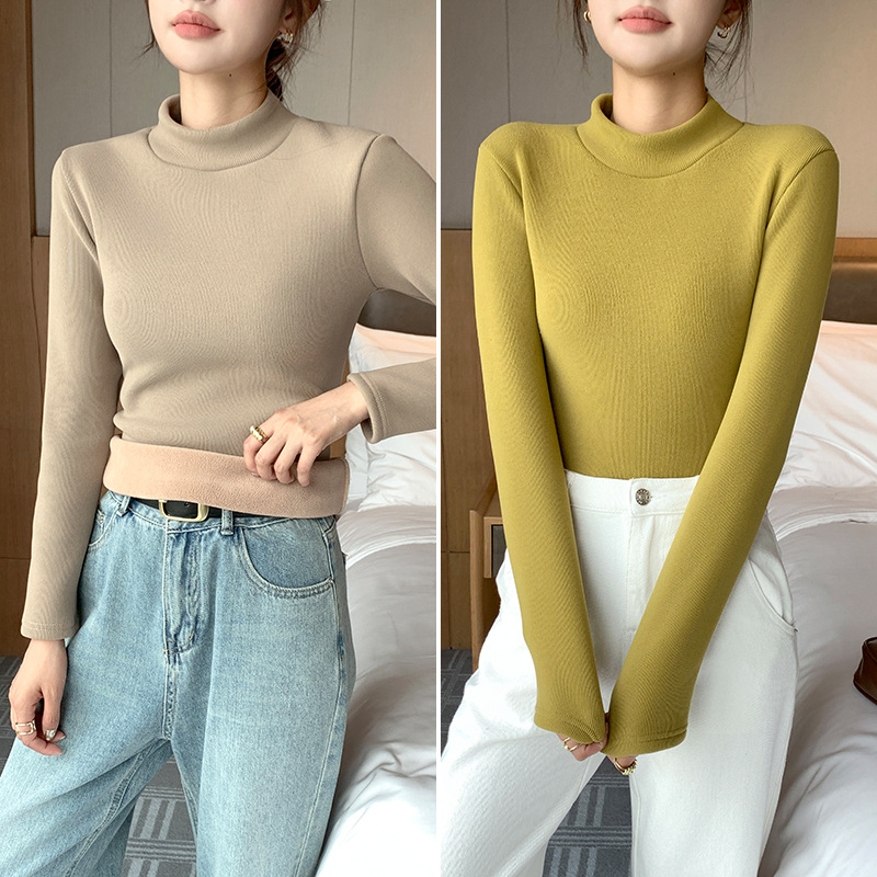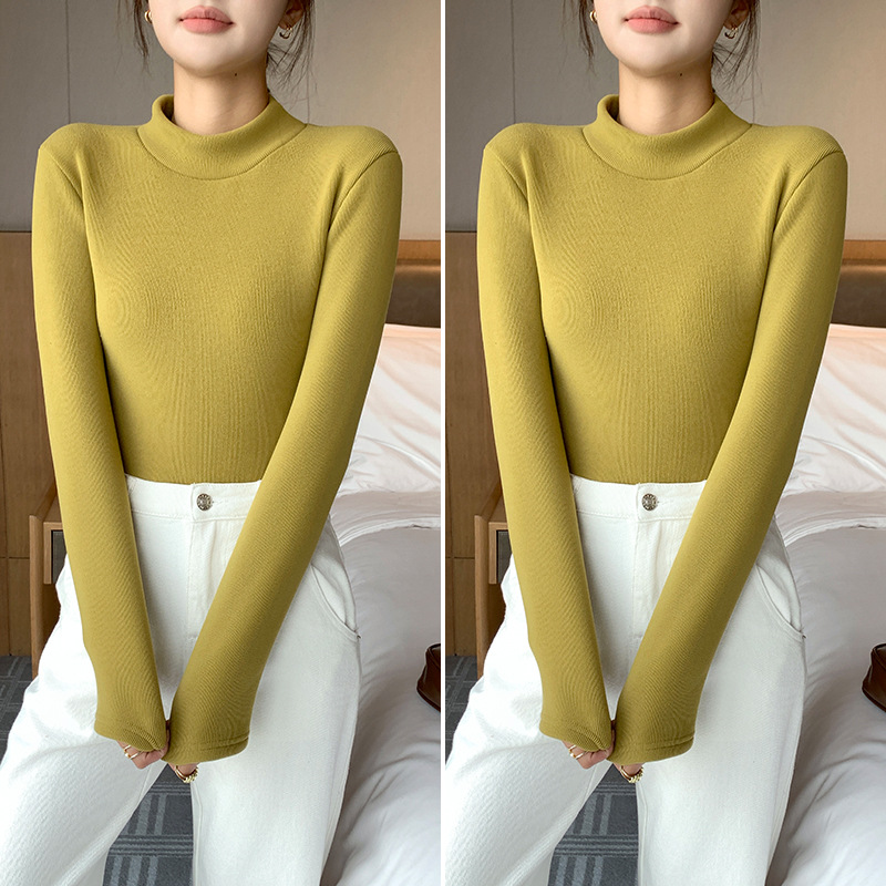 Комбинированная внутренняя водолазка с высоким воротом, облегающая трикотажная нижняя рубашка, теплый топ на флисовой подкладке, Женская осенне-зимняя маленькая Водолазка с длинным рукавом