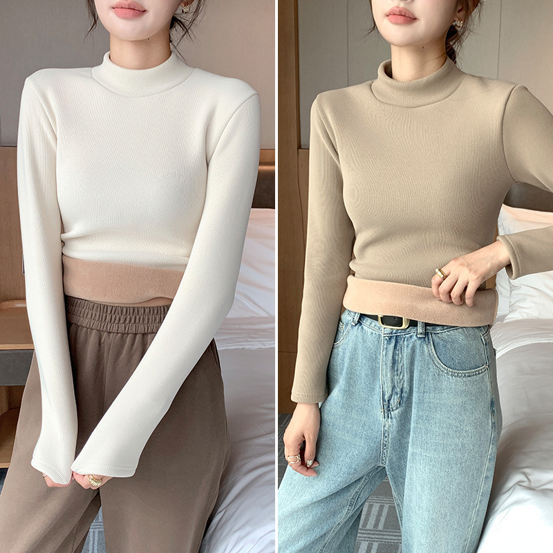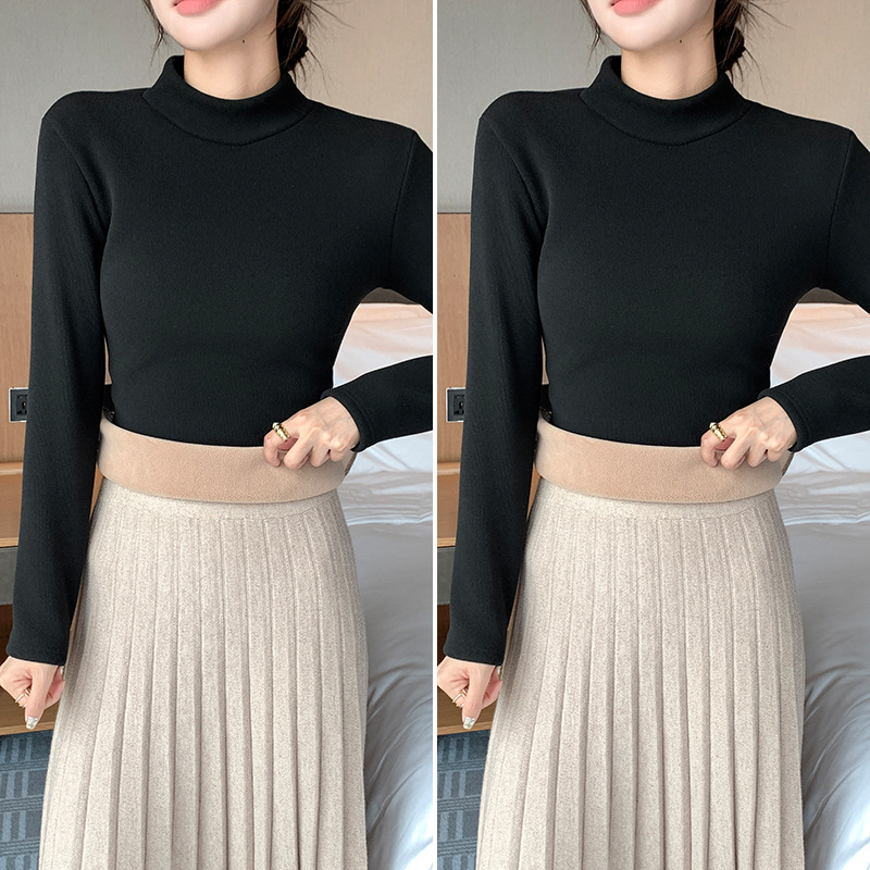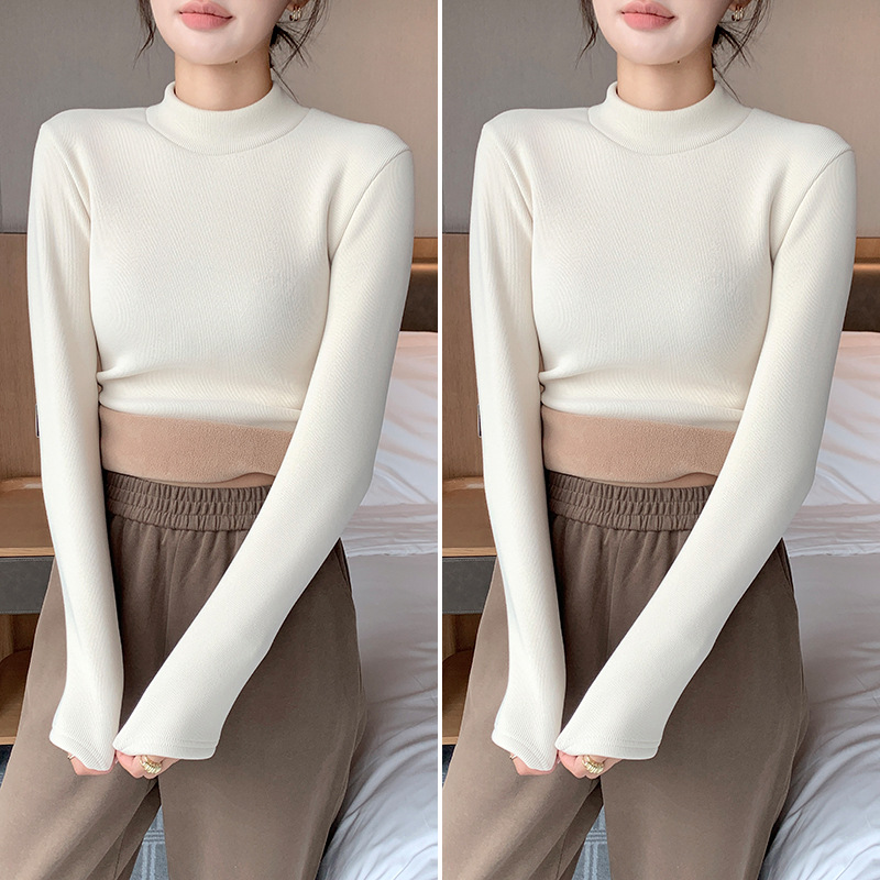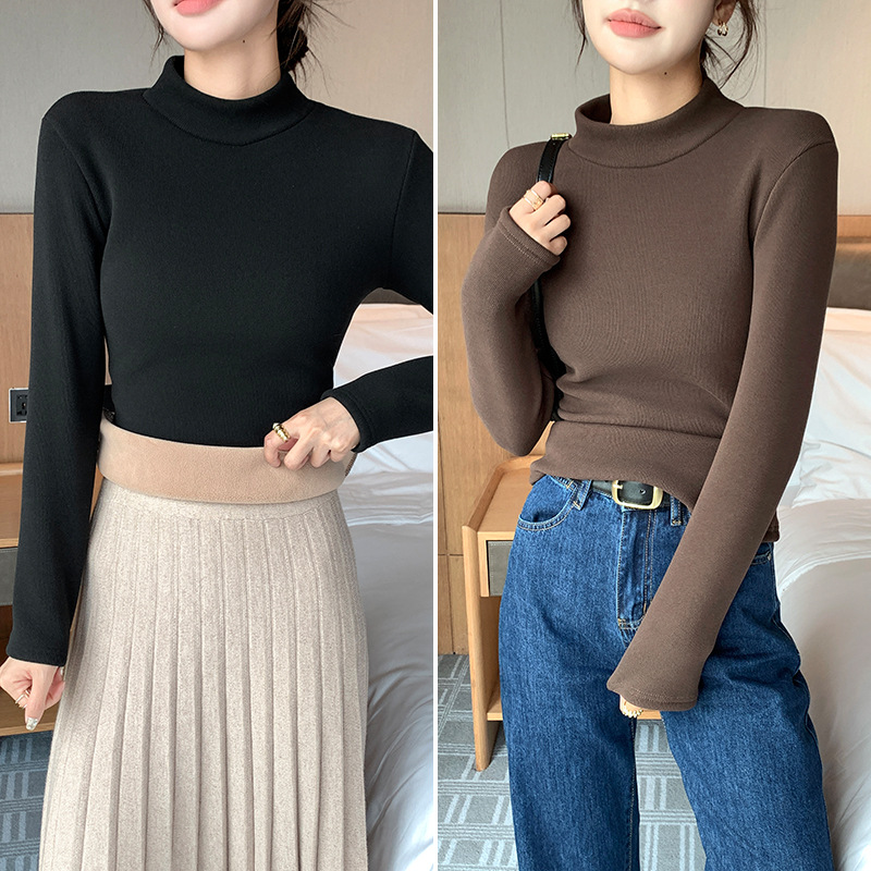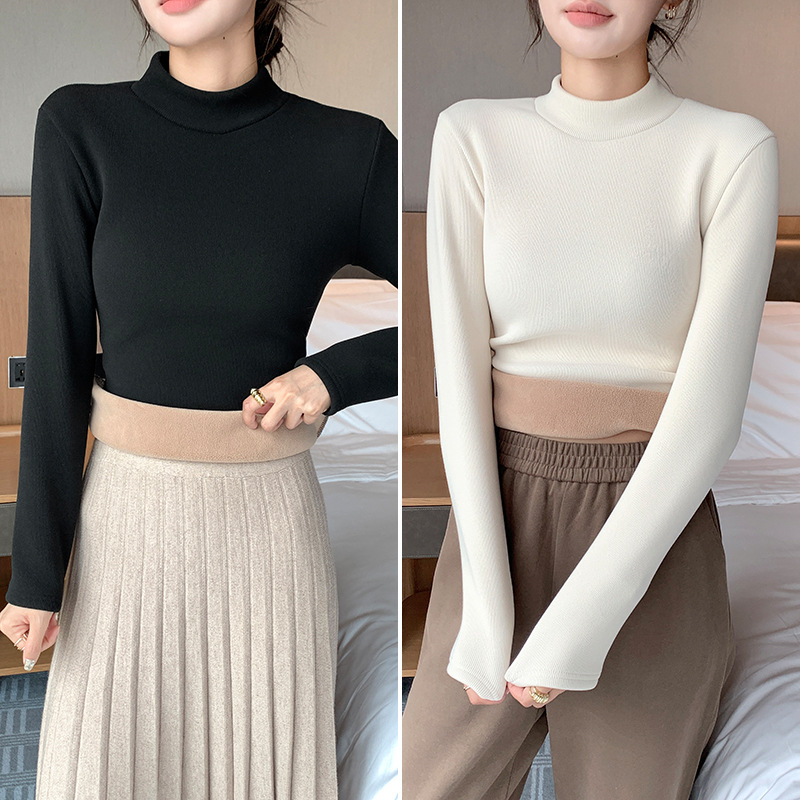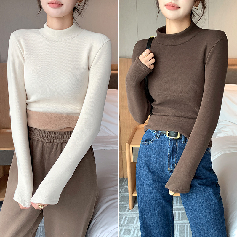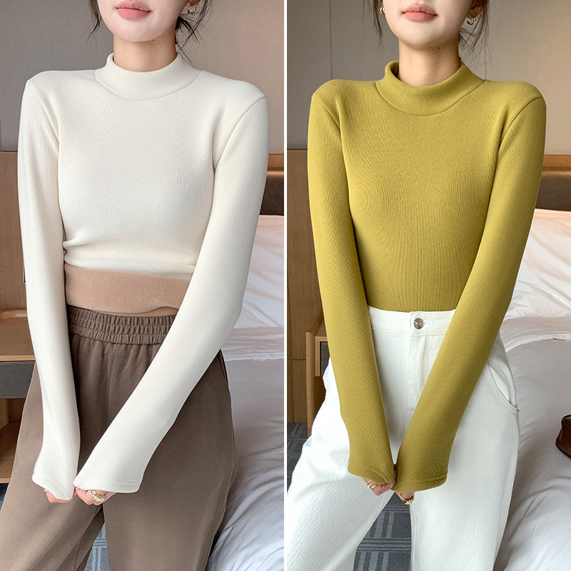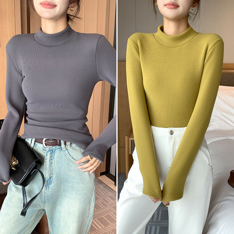 Комбинированная внутренняя водолазка с высоким воротом, облегающая трикотажная нижняя рубашка, теплый топ на флисовой подкладке, Женская осенне-зимняя маленькая Водолазка с длинным рукавом