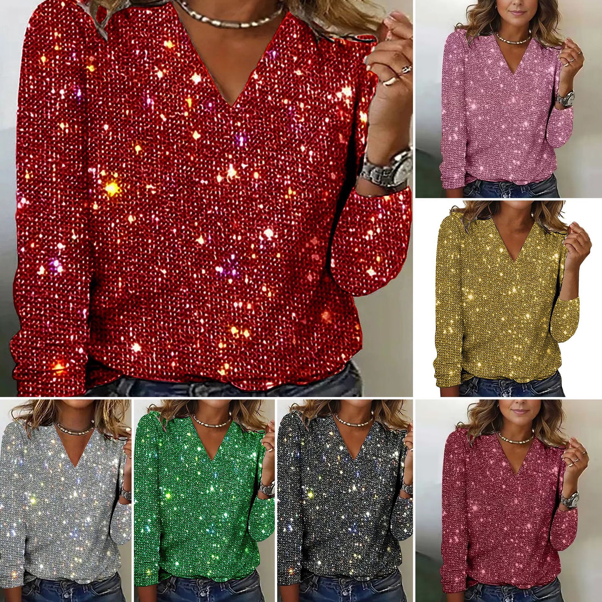 Популярный трансграничный Amazon, европейский и американский независимый сайт AliExpress, элегантный однотонный топ с длинными рукавами и блестками для поездок на работу с v-образным вырезом