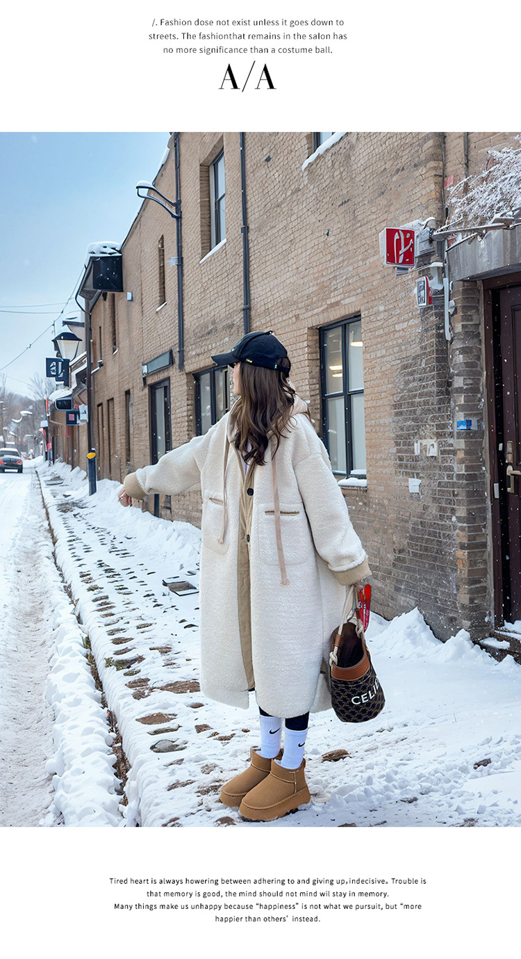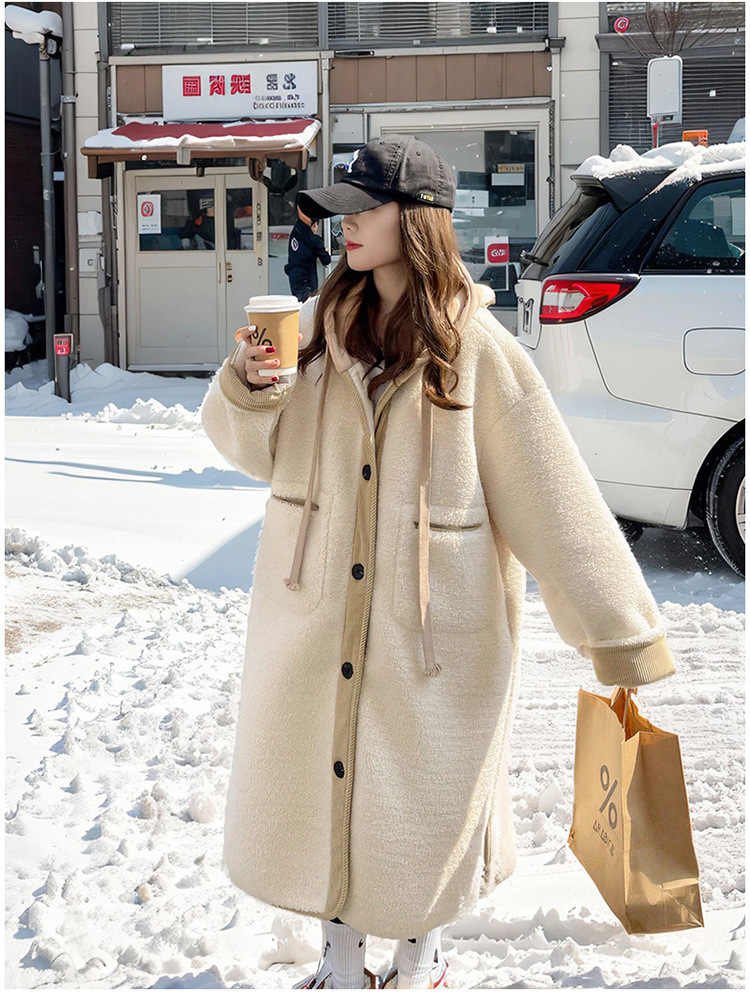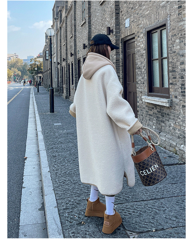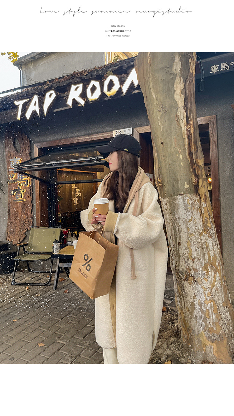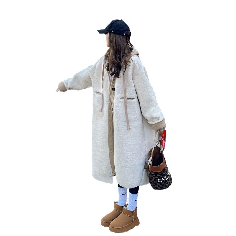 Нежно-белая капюшон с шапочкой 2025 имитация шерстяной шерсти ягненка женский осенне-зимний свободный ленивый средний длинный хлопковый костюм плюшевая куртка прилив