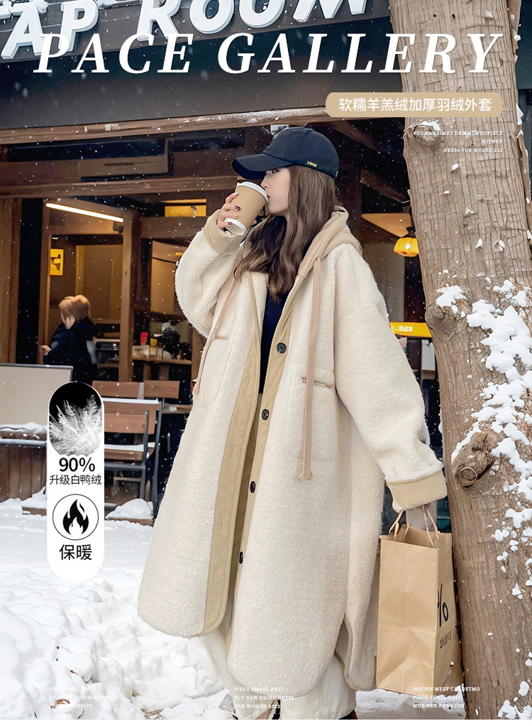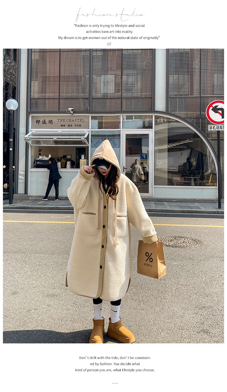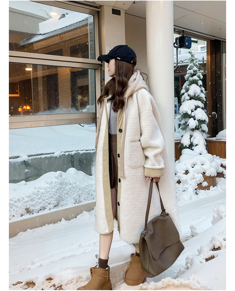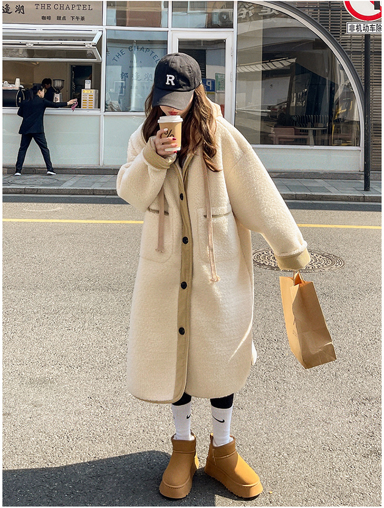 Нежно-белая капюшон с шапочкой 2025 имитация шерстяной шерсти ягненка женский осенне-зимний свободный ленивый средний длинный хлопковый костюм плюшевая куртка прилив