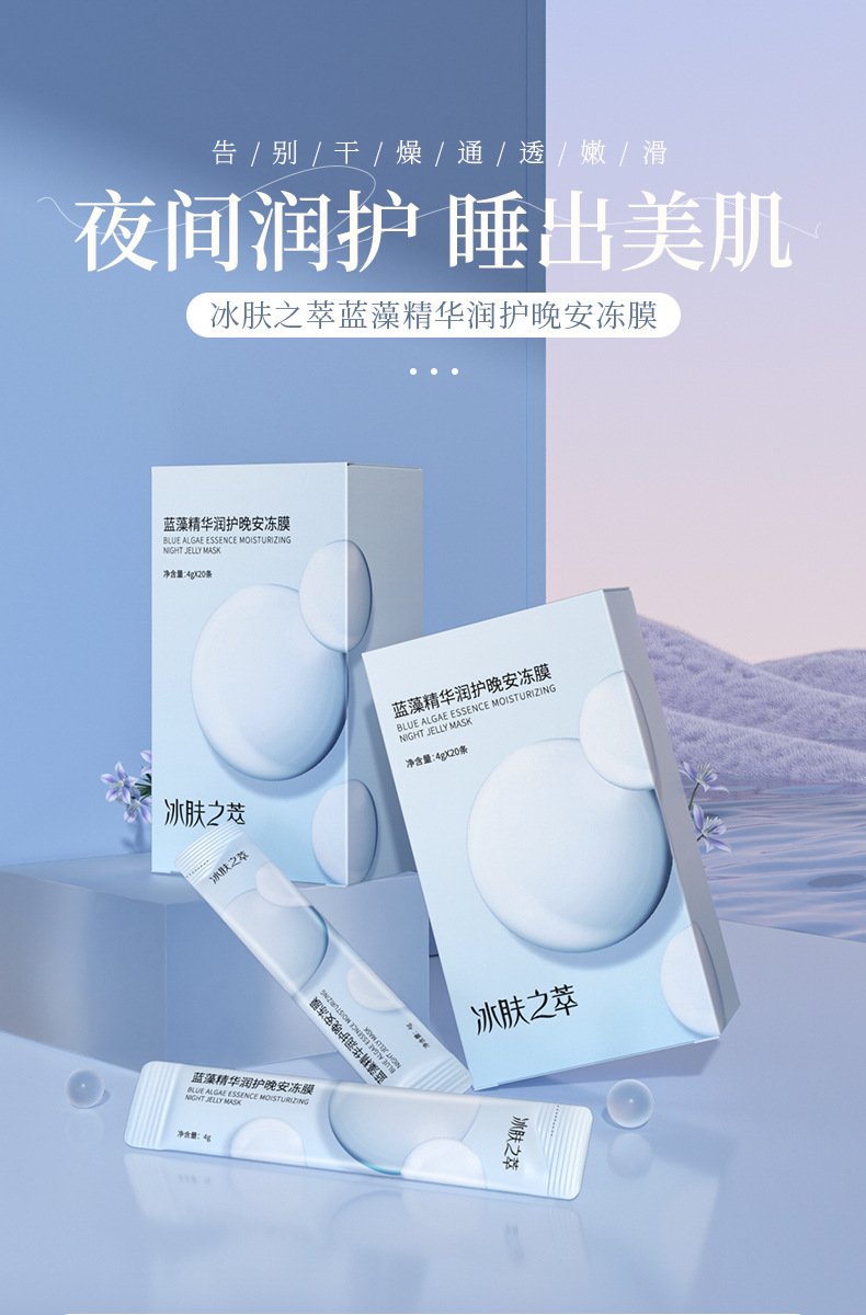 Экстракт ледяной кожи, эссенция синих водорослей, увлажняющая желейная маска «Доброй ночи» (20 шт./кор.); Леденящаяся замороженная пленка с фризидрированным водным свечением (4 г x 20 пакетов/коробка); Желейная маска на ночь с коллагеном и календулой Ice Skin (20 пакетиков в упаковке); Эссенция для кожи Ice Skin Bosein: увлажняющая маска против старения (20 штук в упаковке)