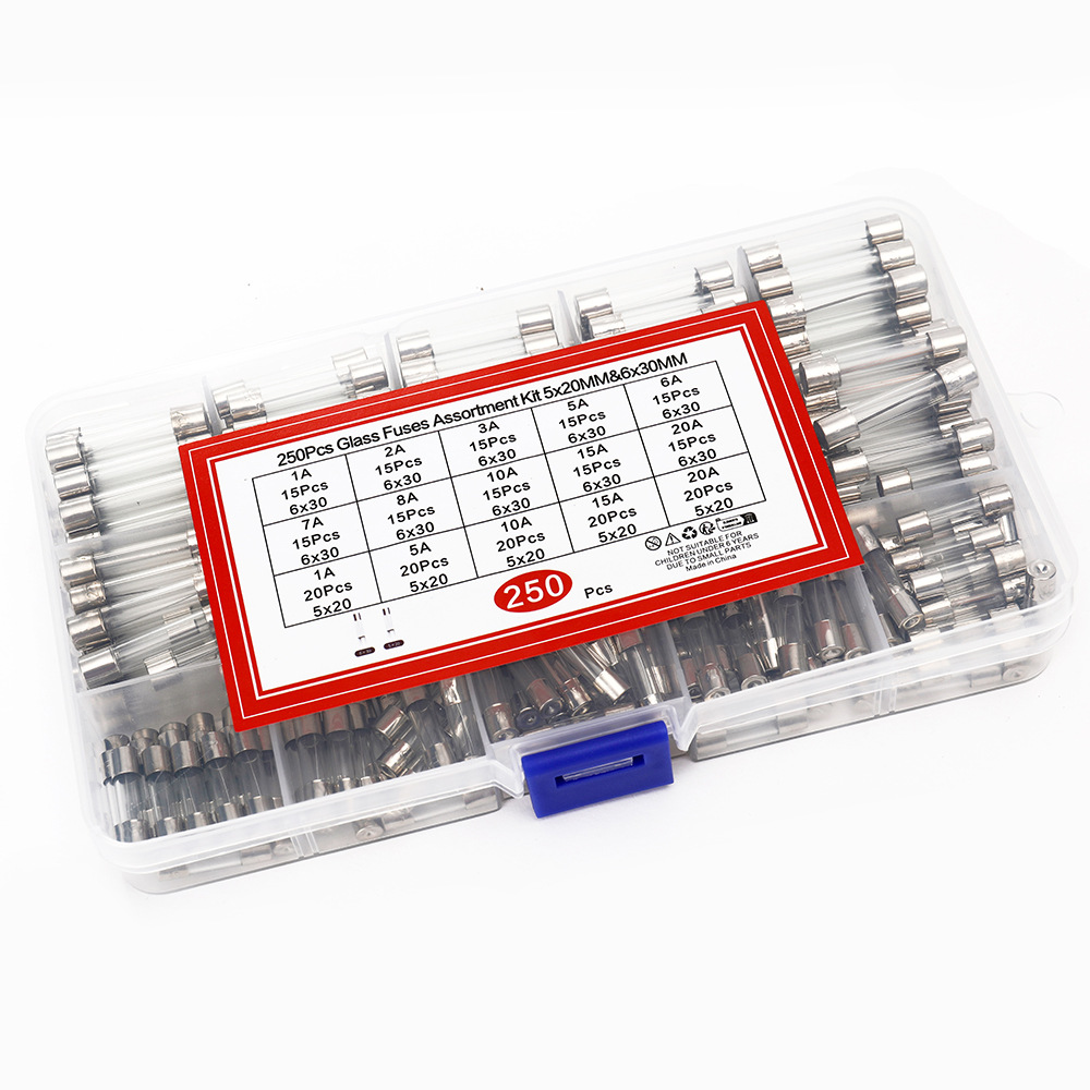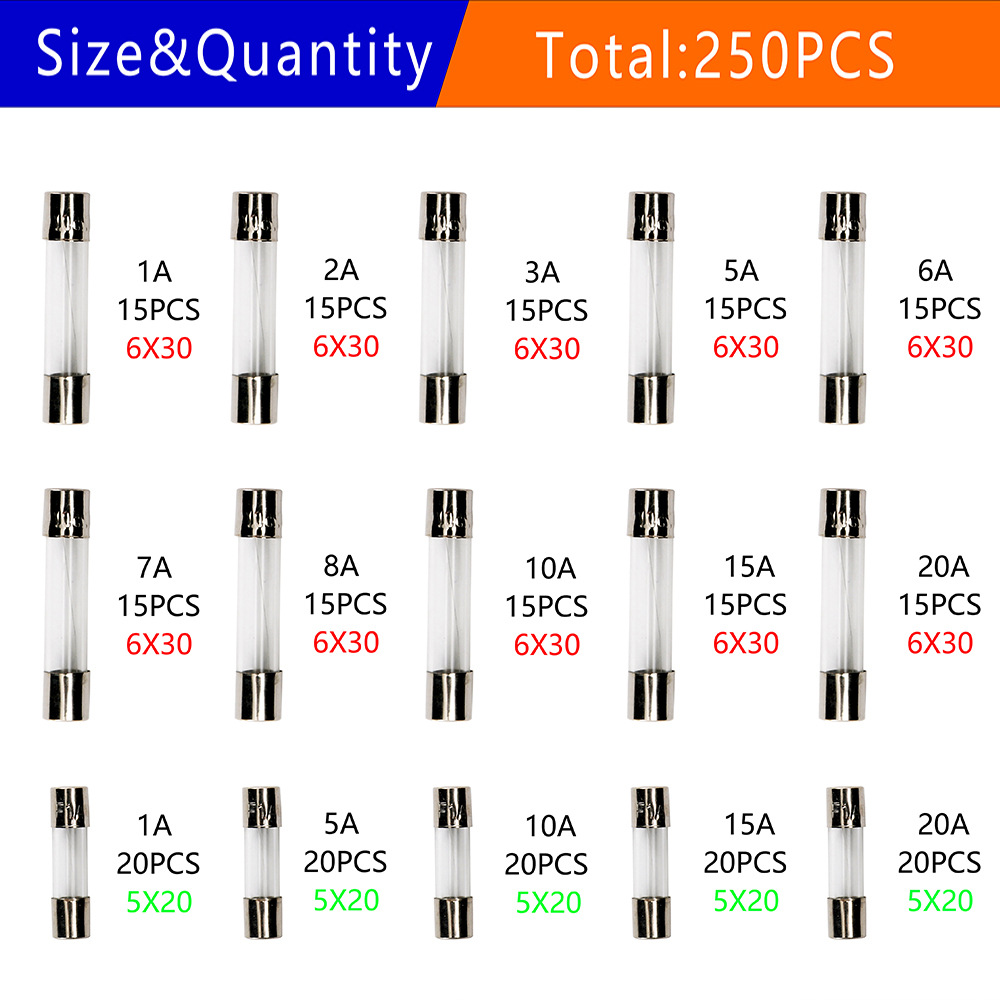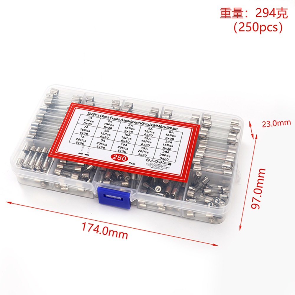 250 шт. предохранителей в 15 вариантах: 6*30 мм/5*20 мм, быстродействующие стеклянные предохранители, смешанный набор, 250В