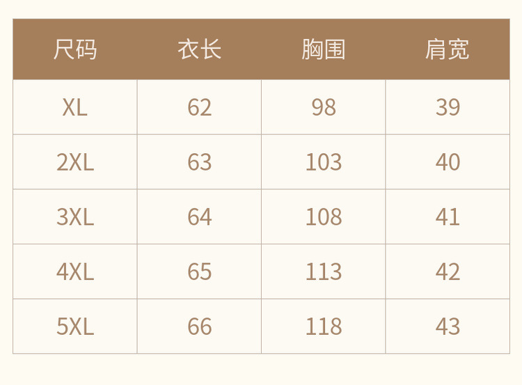 XL (рекомендуется менее 105 Цзинь); 2XL (рекомендуется 52,50-60,00 кг; 3XL (рекомендуется 60,00-67,50 кг; 4XL (рекомендуется 67,50-75,00 кг; 5XL (рекомендуется 75,00-82,50 кг