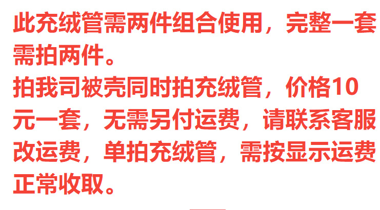 拍我司被壳同时拍充绒管,价格10元一套,无需另付运费,请联系客服改运费,单拍充绒管,需按显示运费正常收取。
