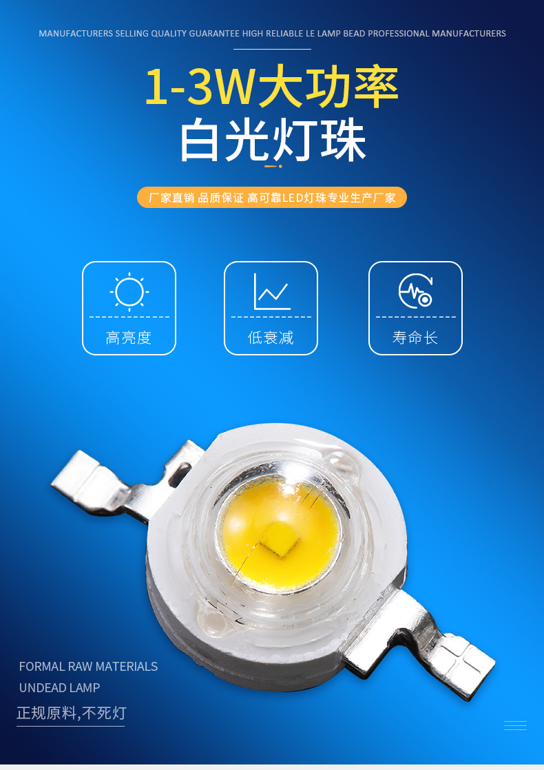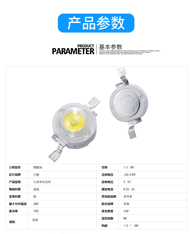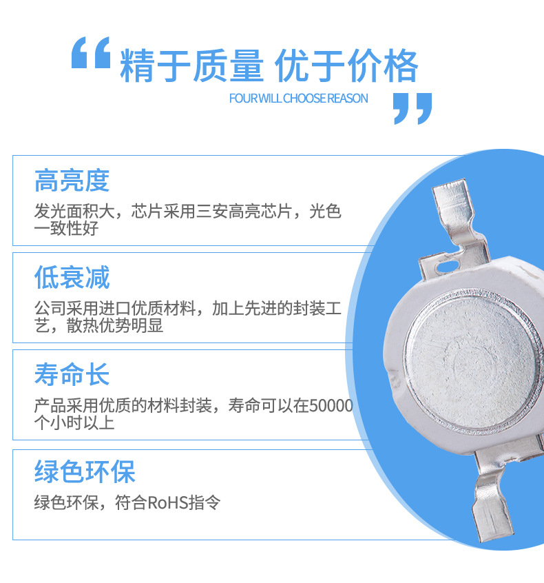1W Высокая мощность белого света (110-120lm); 1W Высокая мощность белого света (120-130lm); 3W Мощный белый свет (имитация 45mil 220-240lm; 3W Высокая мощность двойной сердечник белый свет шарик (220-240lm