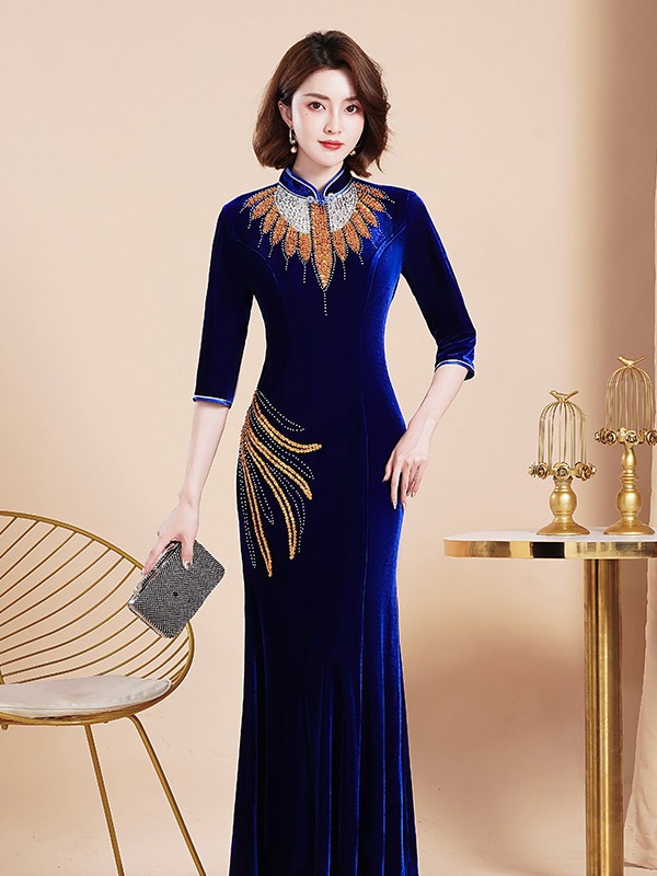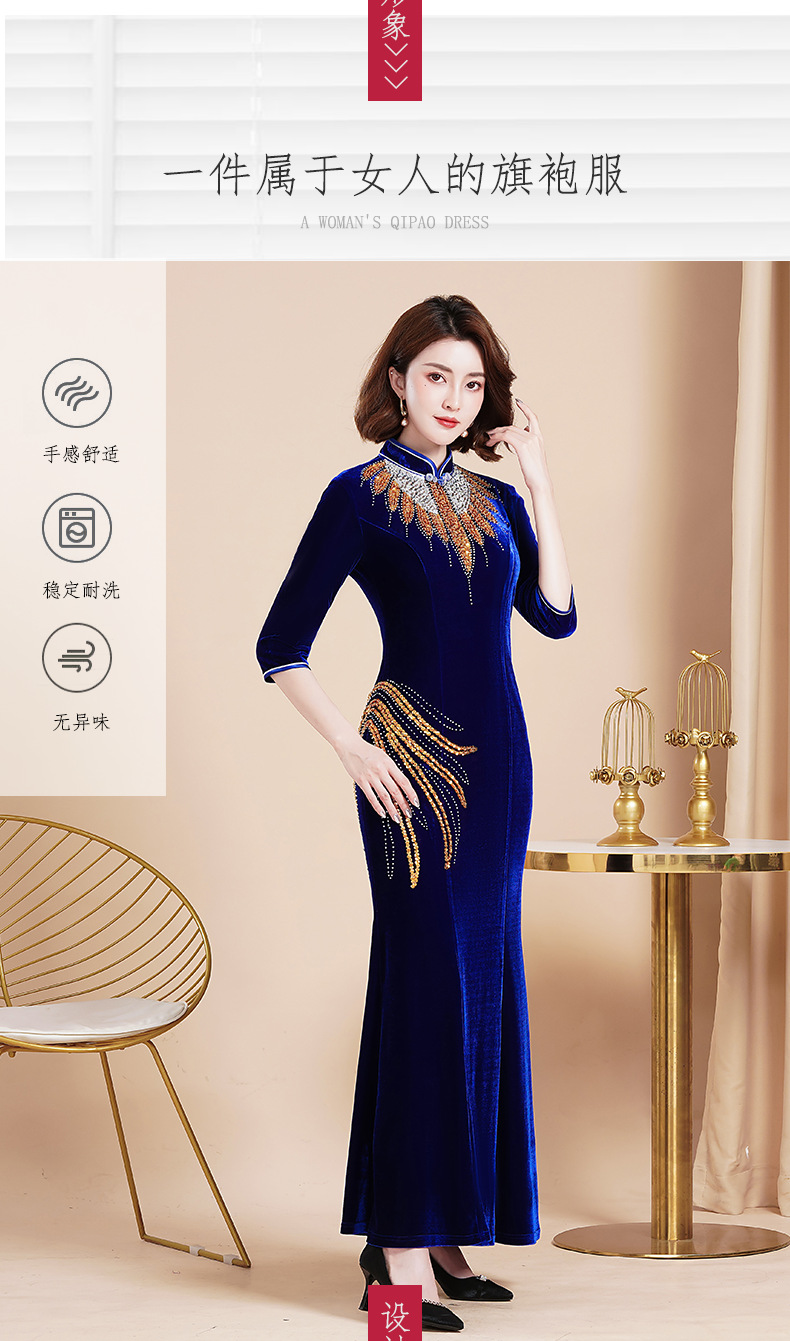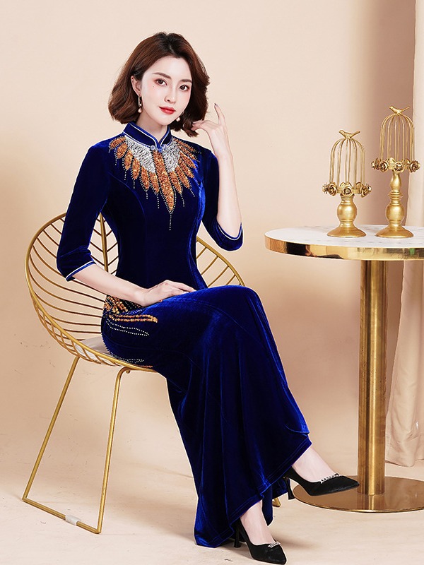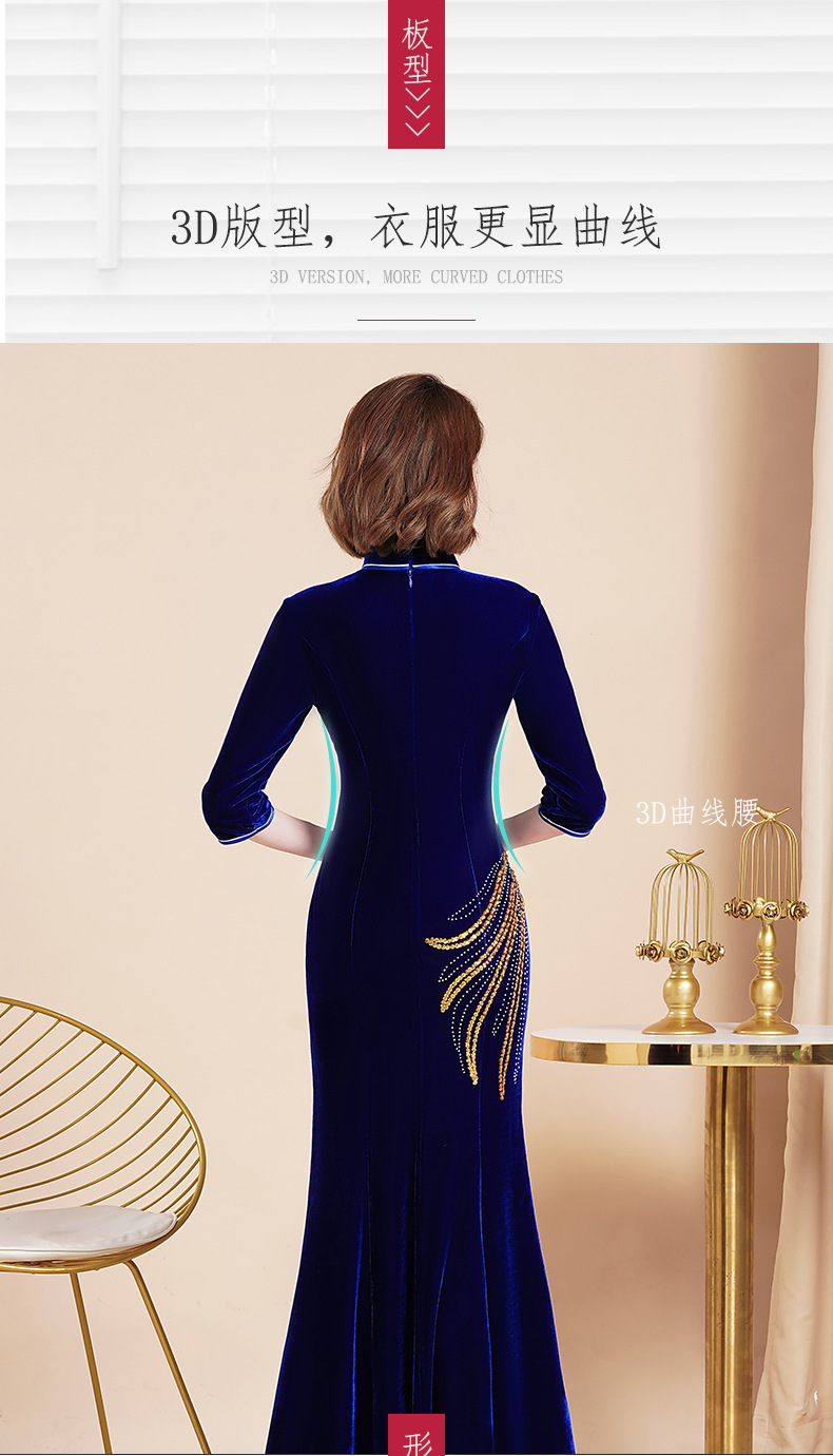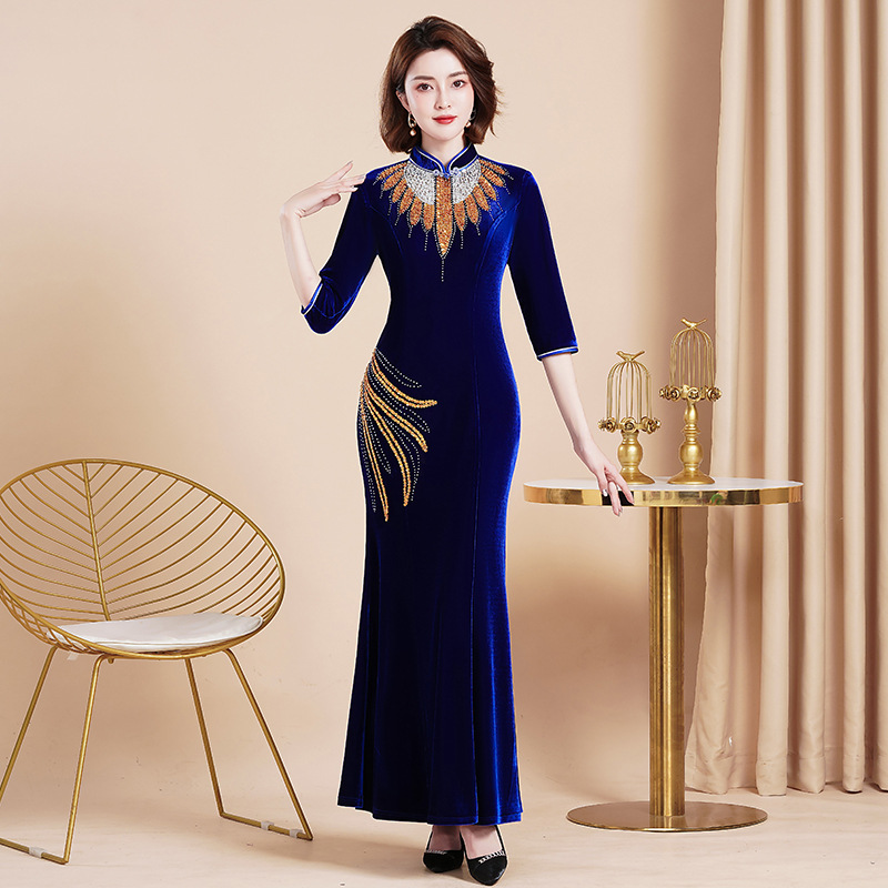 Банкетный Золотой бархатный Чонсам улучшенное платье рыбий хвост благородное длинное платье сценический костюм для подиума Длинный Элегантный