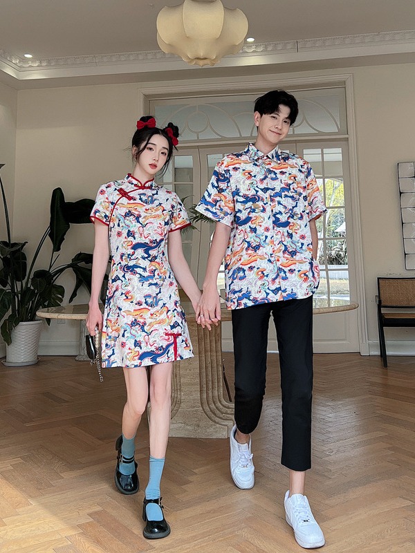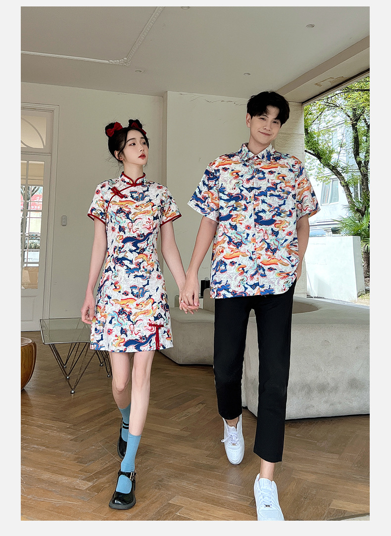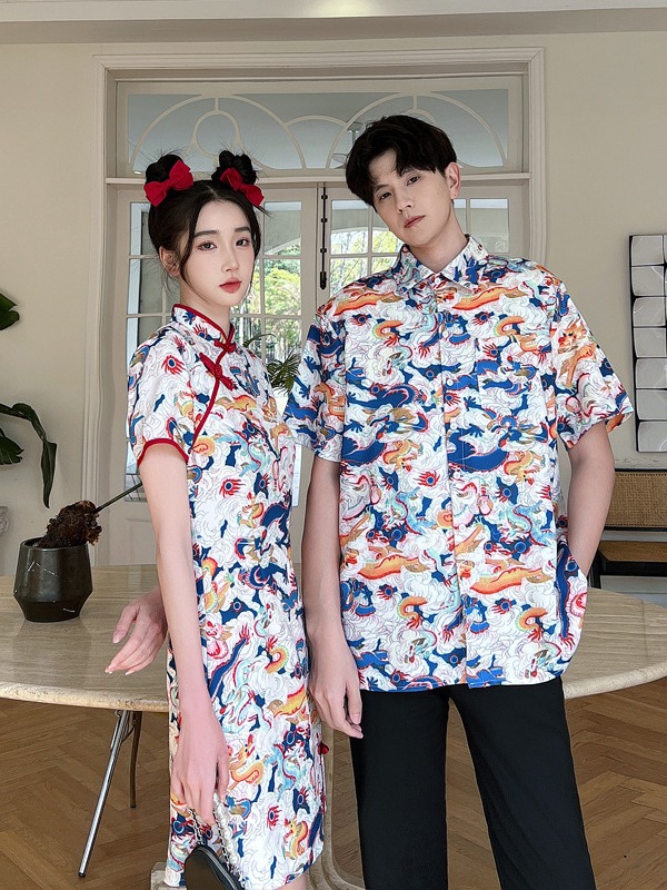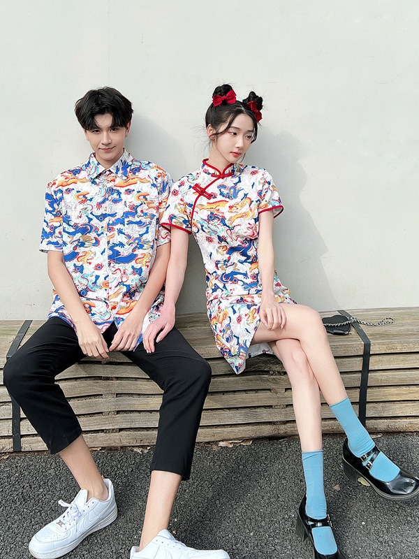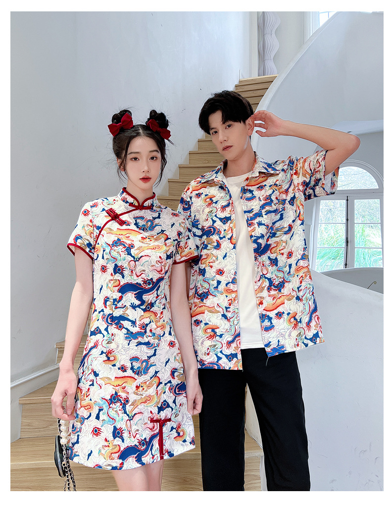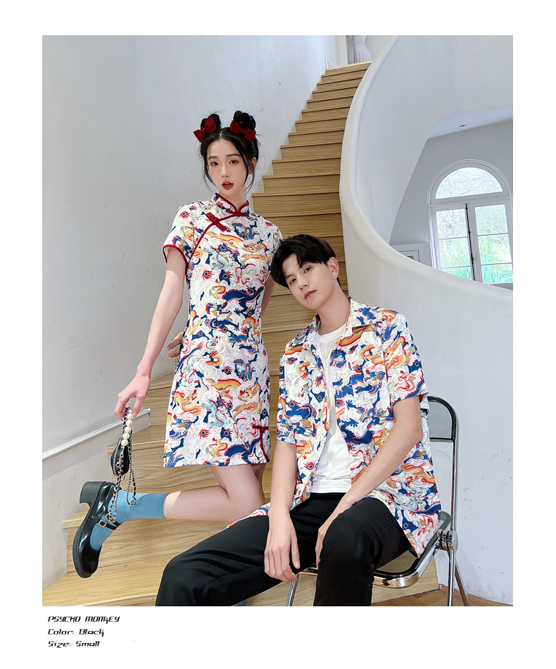 Китайский стиль пара ретро улучшенный нерегулярный дизайн с принтом с открытым принтом плюс размер cheongsam платье рубашка с отворотом