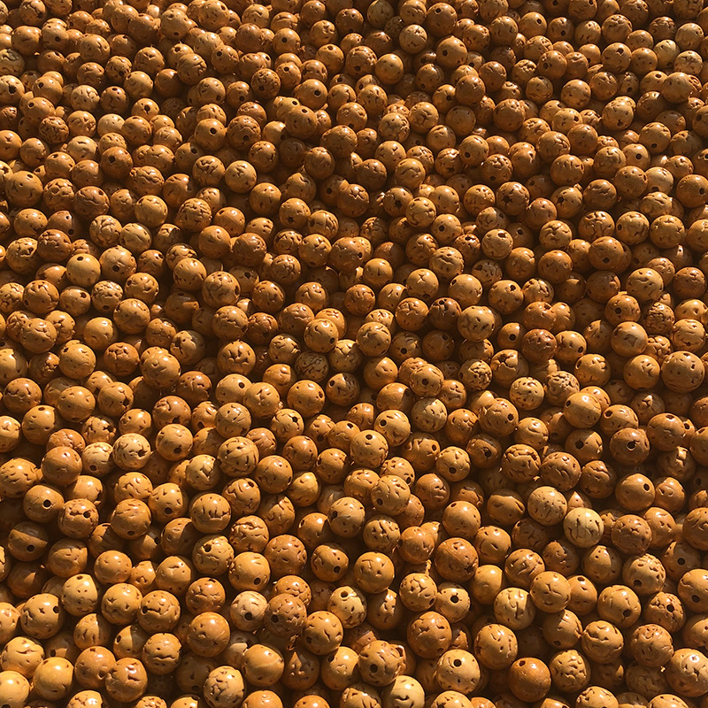 Производитель поставляет 108 беззубых бусин рудракшы, идеально круглых, с узором под кость, сухой полировки, на длинной нити.