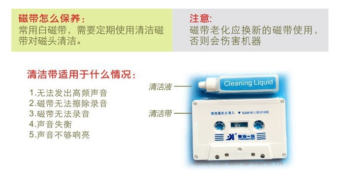 清磁作用。使用时,按正常放音速度运行,就能擦去磁头及磁带通道中的磁粉和