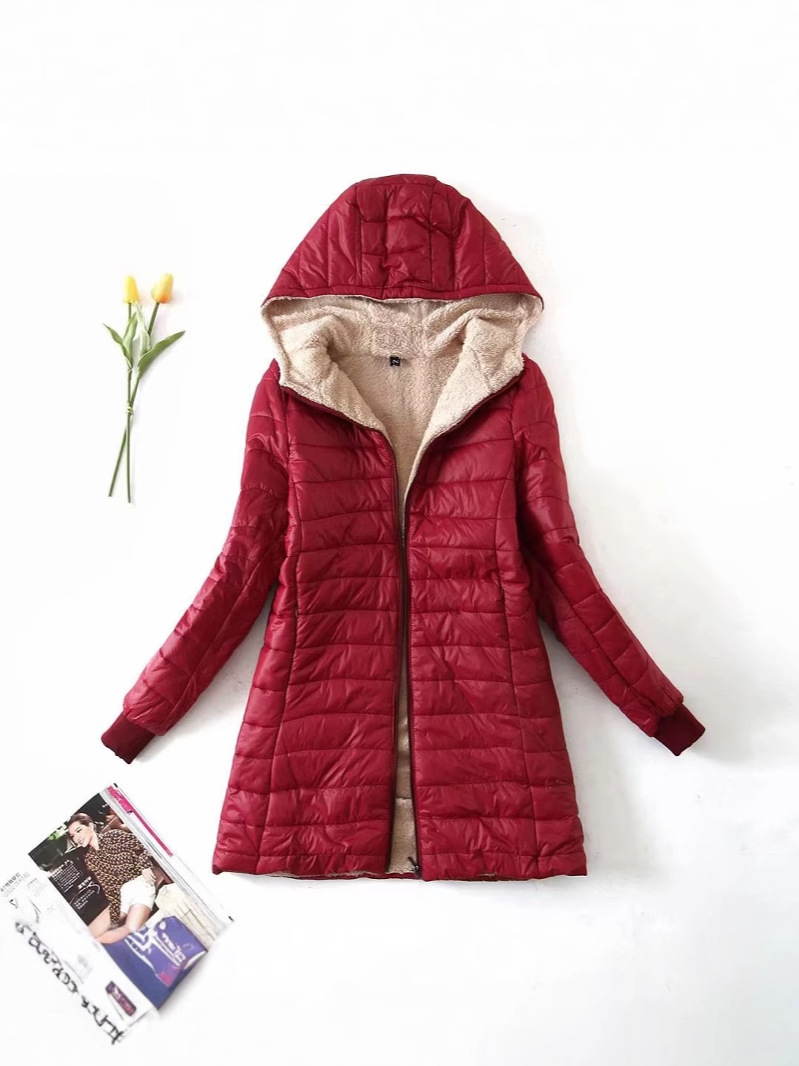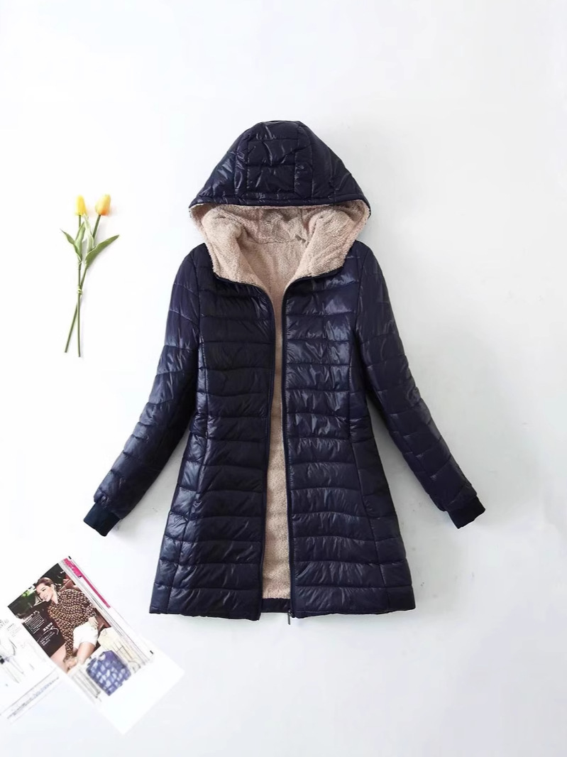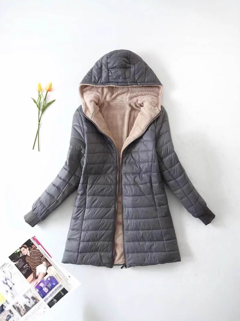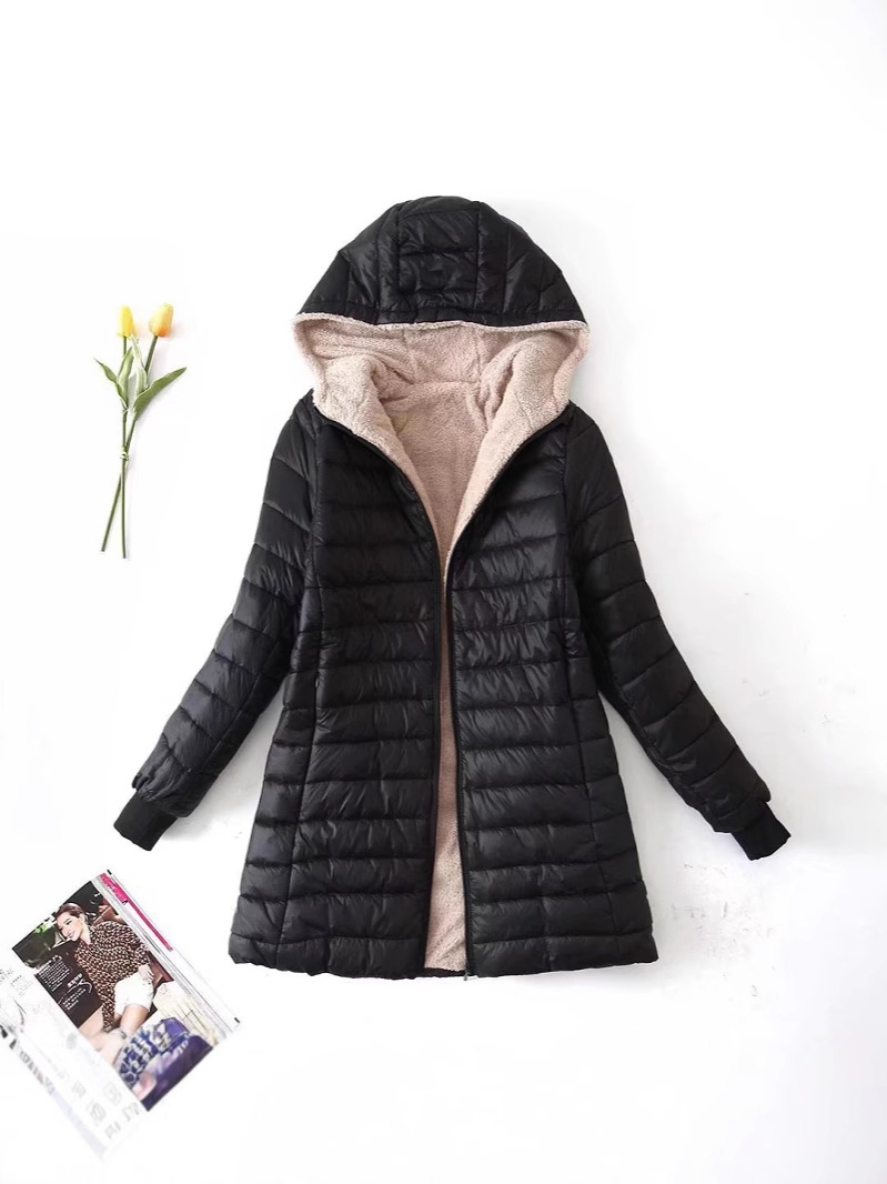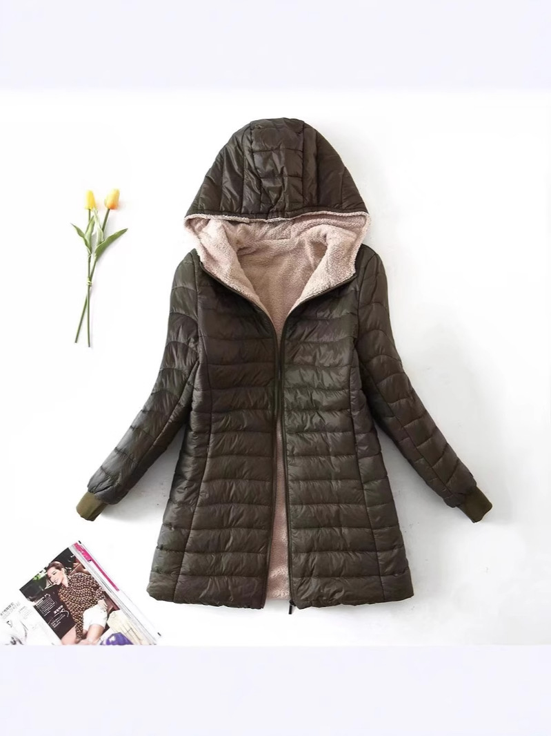 Женская куртка 2025 года, новая осенне-зимняя, корейского стиля, утолщенная вельветовая, с капюшоном, средней длины, тонкая, теплая, из кашемира и хлопка.